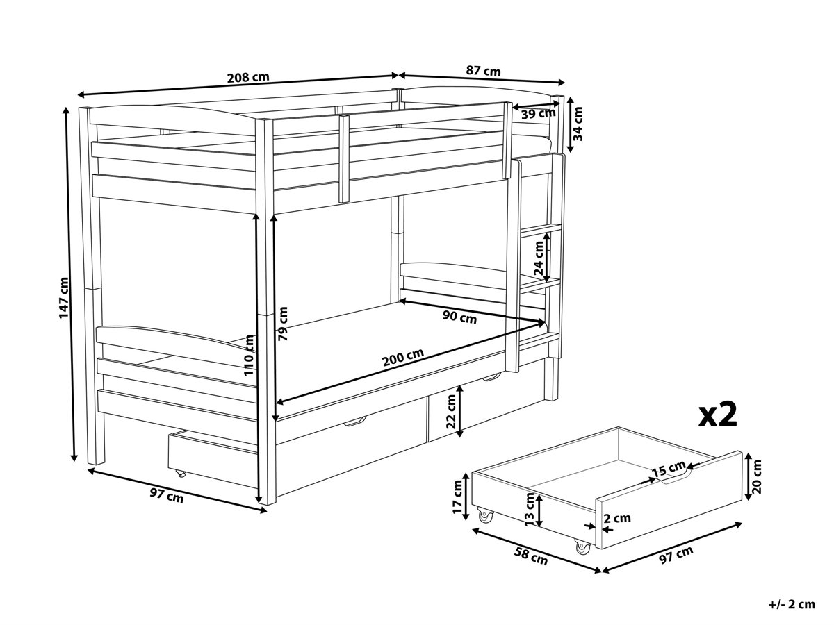 La oferta incluye: 1 x Estructura de cama, 2 x Cajón de almacenaje, 2 x Somier (15 láminas), 1 x Escalera, No incluye: colchón y ropa de cama