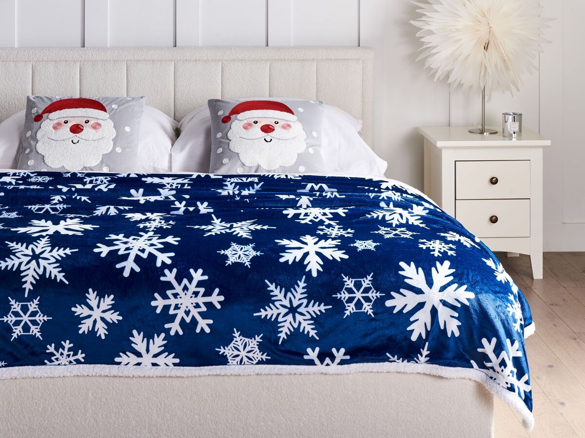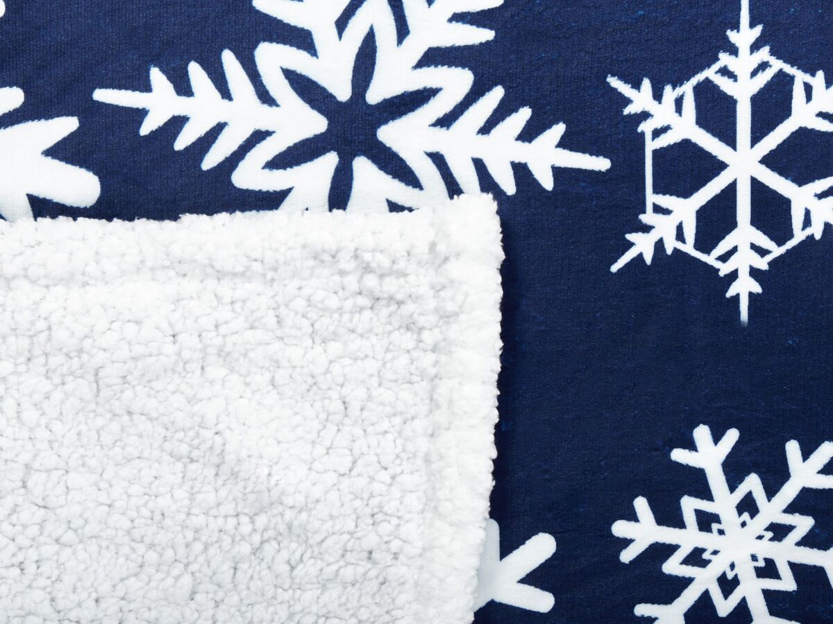 Colcha suave de invierno. Esta manta gruesa, mullida e increíblemente suave es ideal para noches de invierno. El diseño reversible presenta un elegante lado azul oscuro adornado con un delicado estampado de copos de nieve, mientras que el reverso es de color blanco clásico, ofreciendo versatilidad y estilo. Es perfecta para usarla en la cama o como manta para sofás y sillas, ya que añade calidez, lujo y un toque de encanto invernal a cualquier espacio.