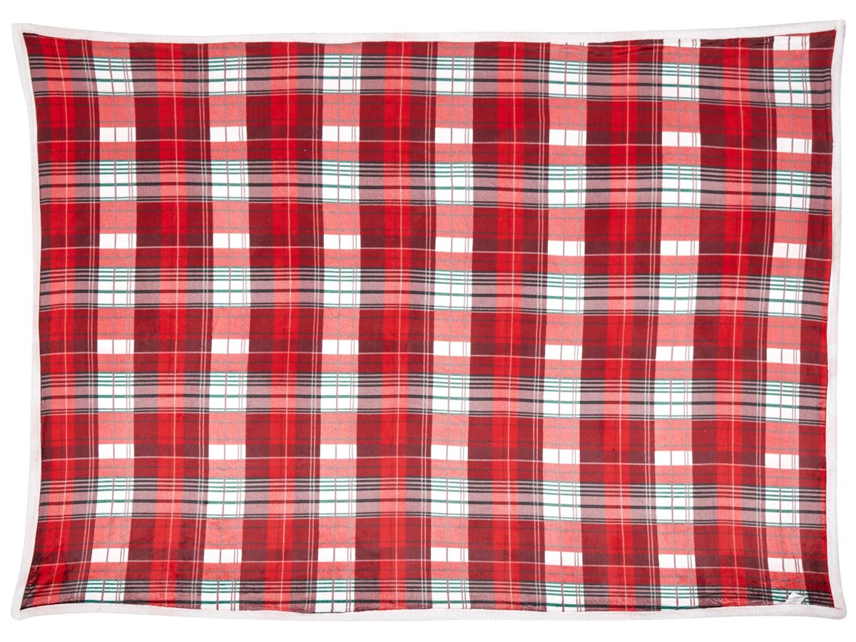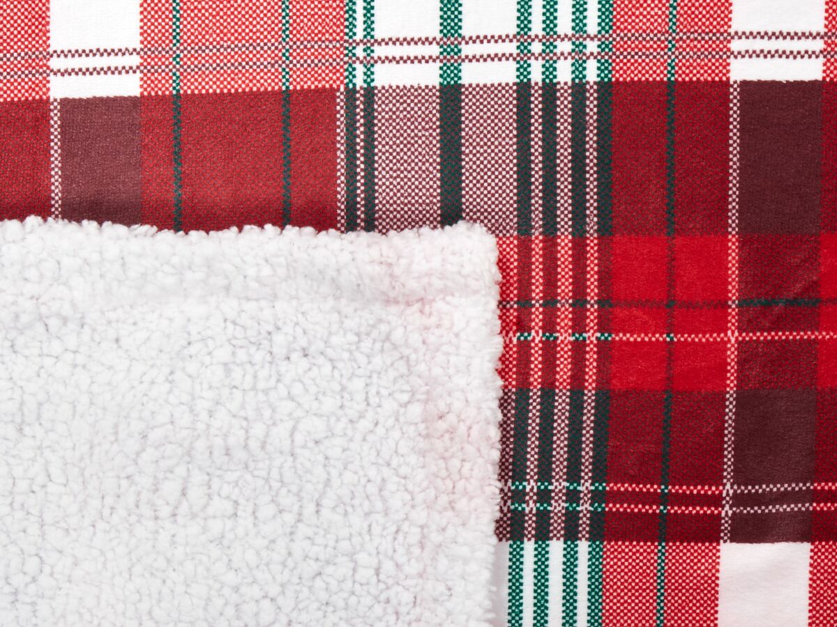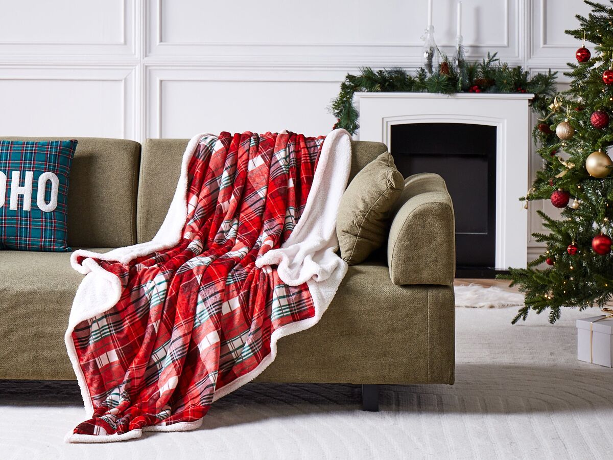 Colcha suave de invierno. Esta manta gruesa, mullida e increíblemente suave es ideal para noches de invierno. El diseño reversible presenta un estampado clásico de tartán en rojo con toques de blanco y verde en una cara dando un toque festivo, mientras que el reverso es de color blanco para un estilo versátil. Es perfecta para usarla en la cama o como manta para sofás y sillas, ya que añade calidez, lujo y un toque de encanto invernal a cualquier espacio.