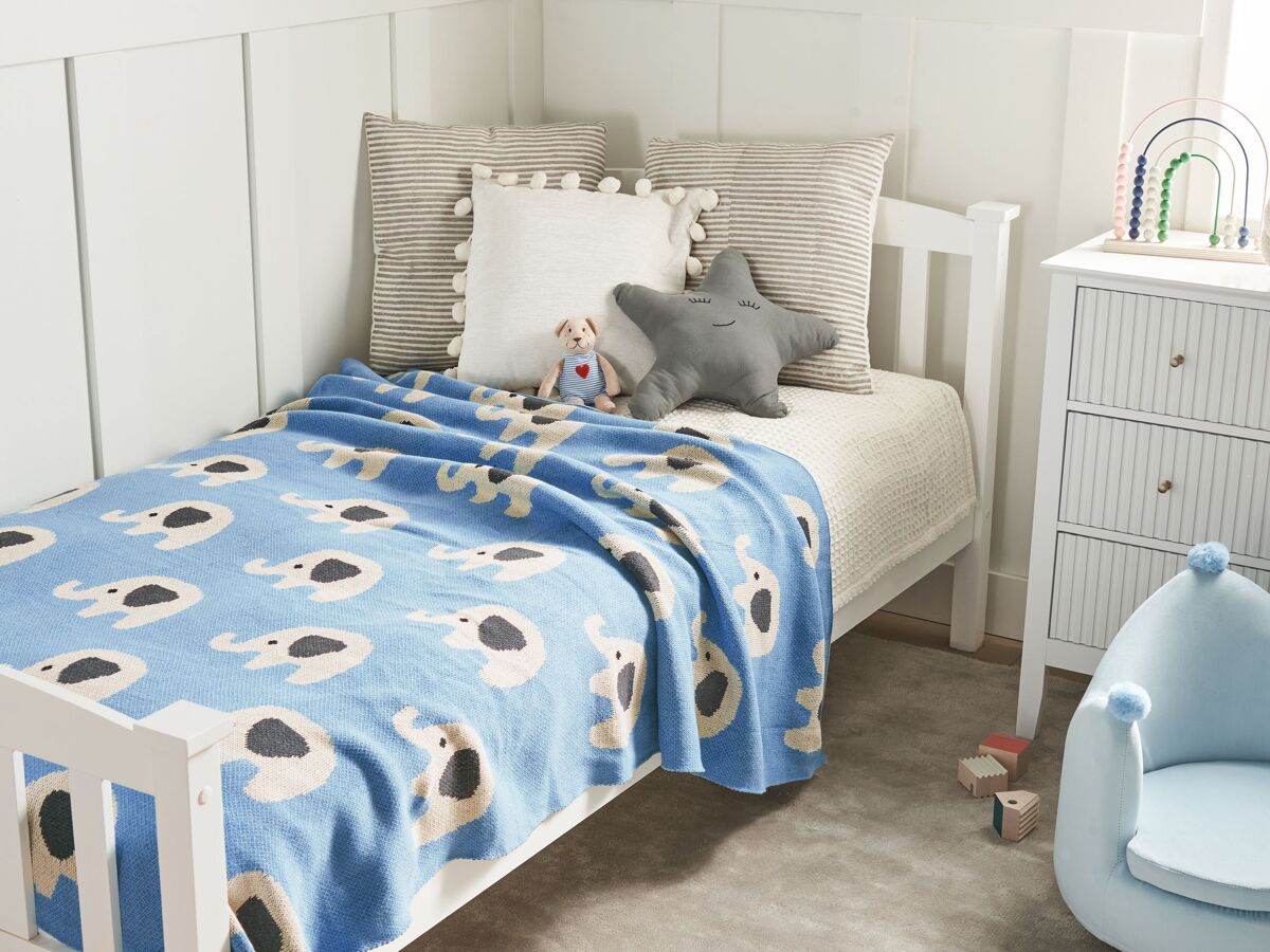 Manta decorativa infantil. Complementa la habitación infantil gracias a esta adorable manta con un encantador motivo de elefante y su acogedor tono neutro que combina a la perfección con cualquier decoración. Fabricada en algodón suave y transpirable, ofrece comodidad y calidez a tu niño. Es fácil de mantener, ya que se puede lavar a máquina. Un complemento ideal, lleno de calidez y juego para cualquier espacio dedicado a los más pequeños.