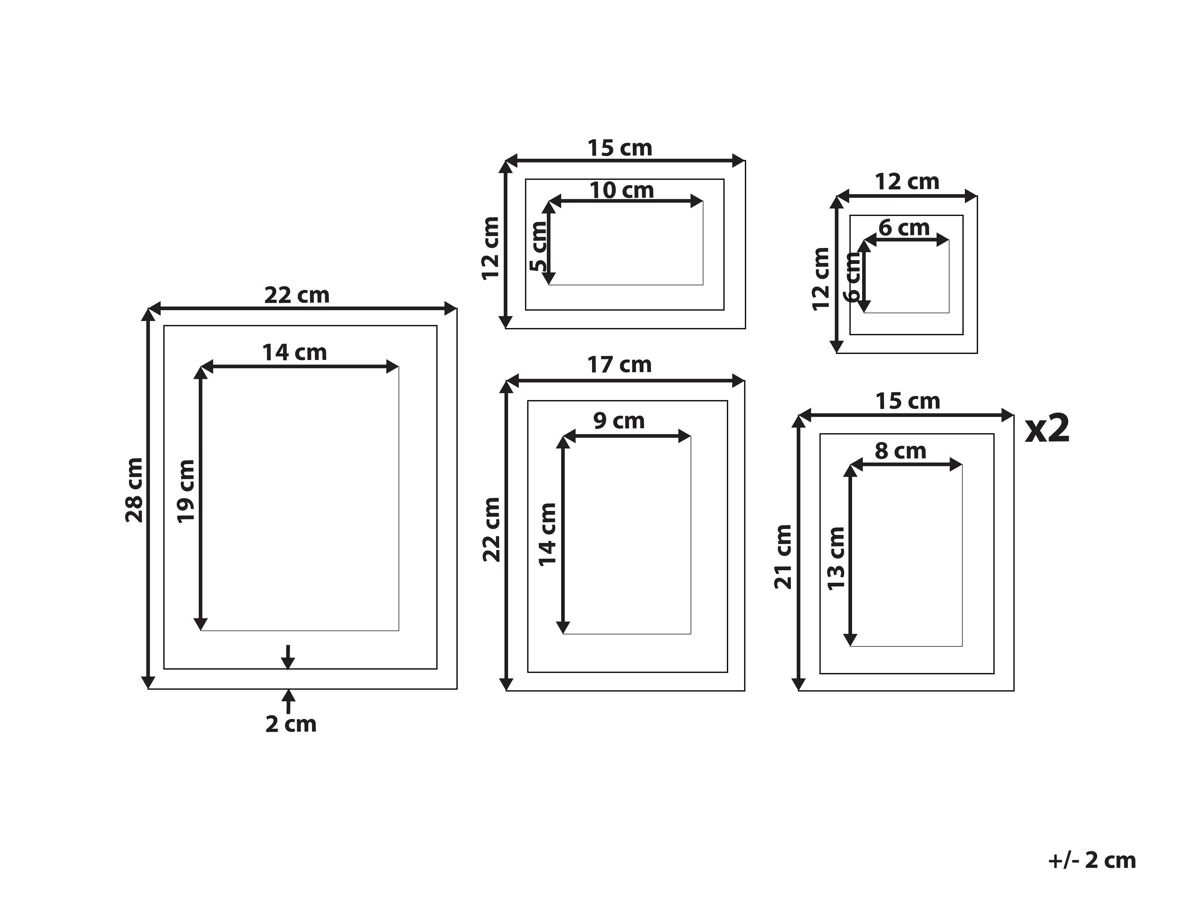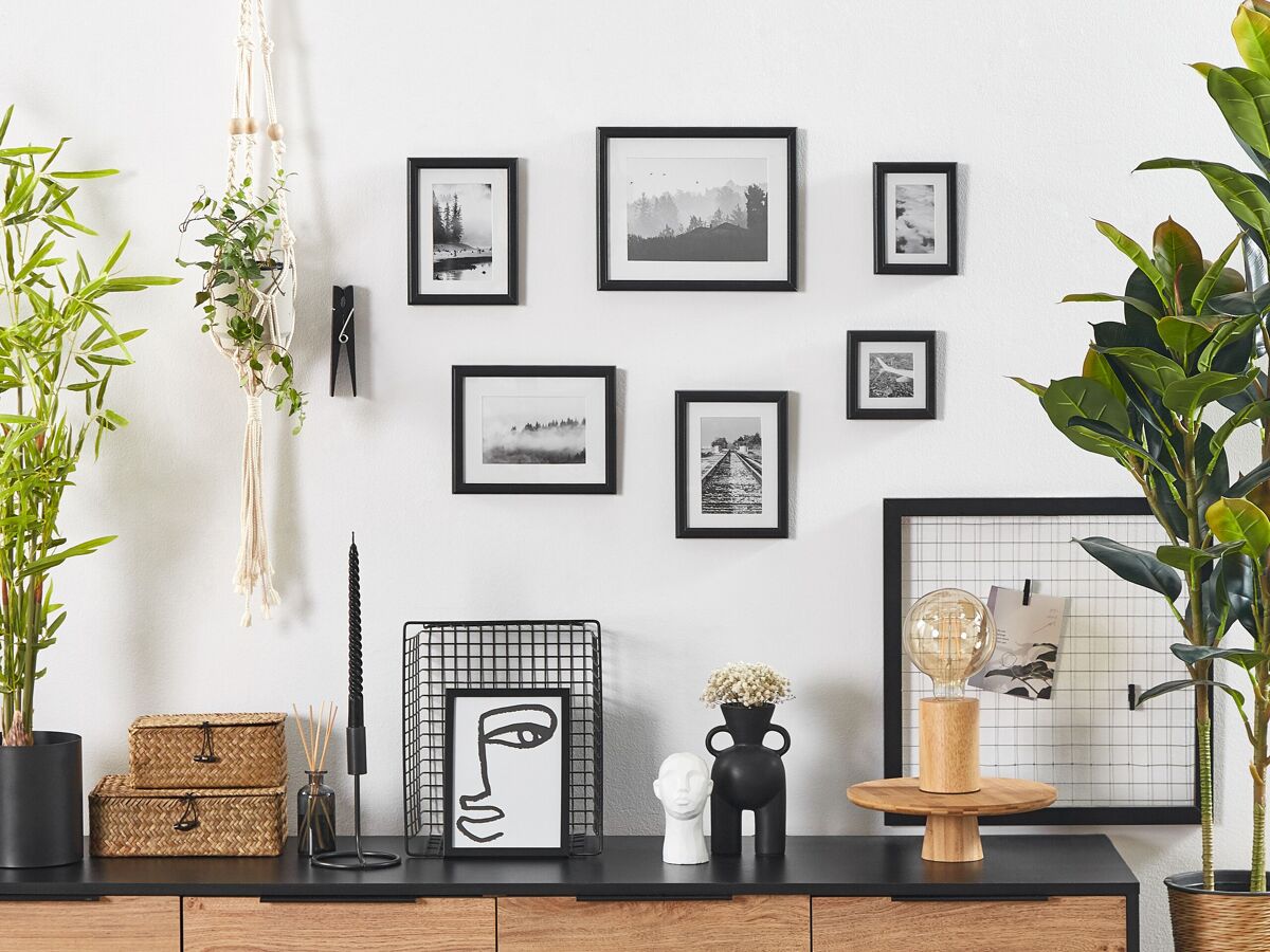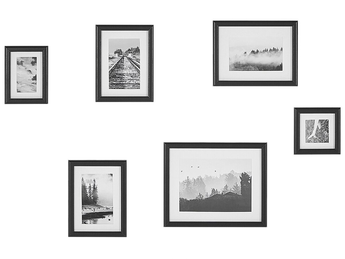 Juego de marcos. Decora la pared de tu hogar con este conjunto de 6 marcos. El juego está fabricado a partir de MDF con una lámina de plexiglás que protege el contenido. Los ganchos incluidos en la parte posterior permiten colgarlos horizontal o verticalmente, según prefieras. Puedes poner tus propias fotografías dentro de los marcos.