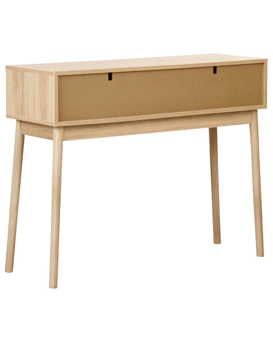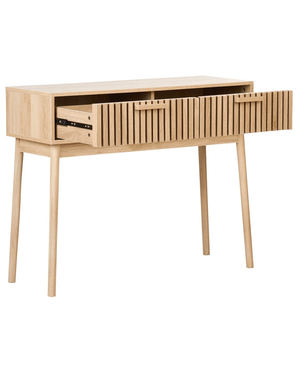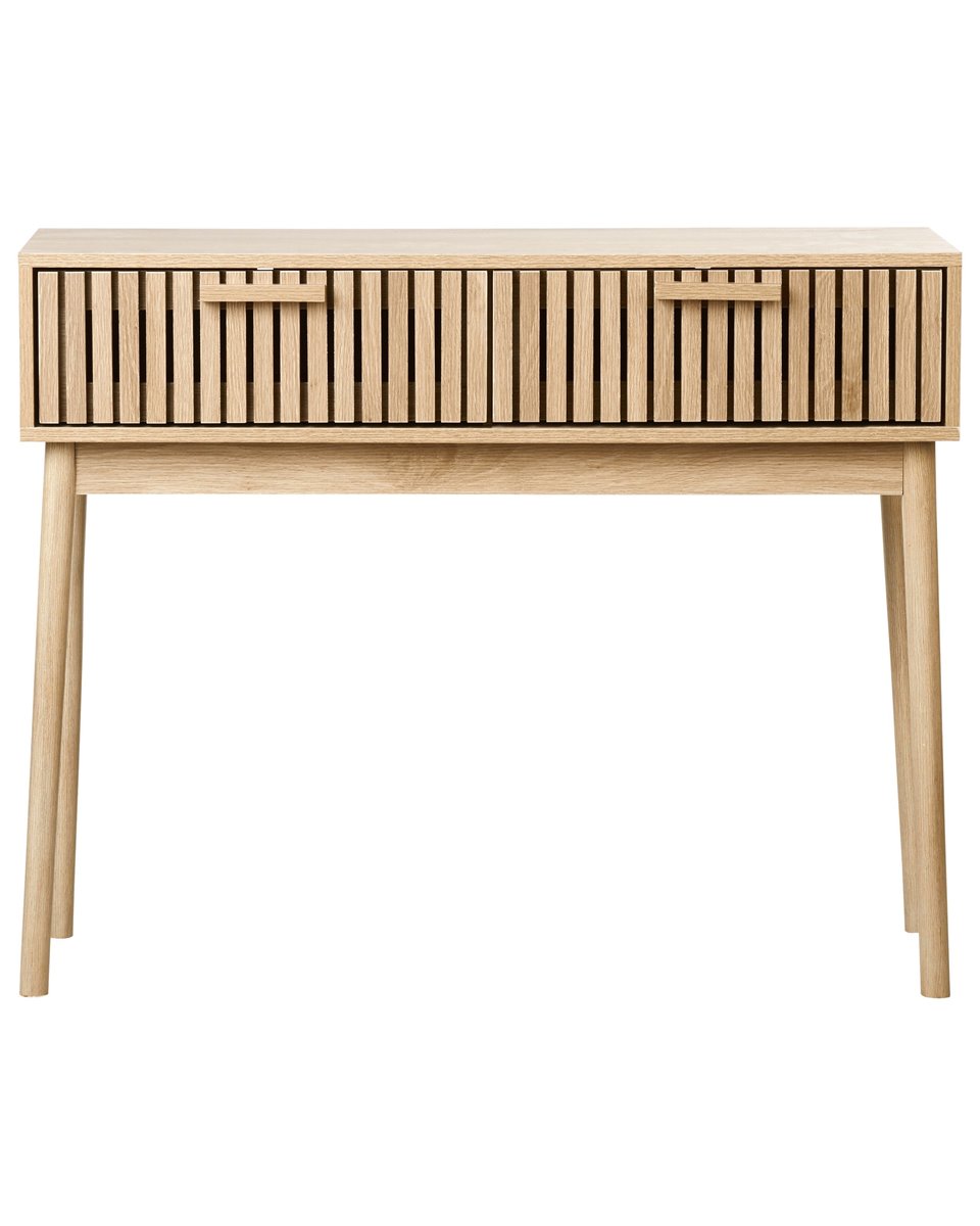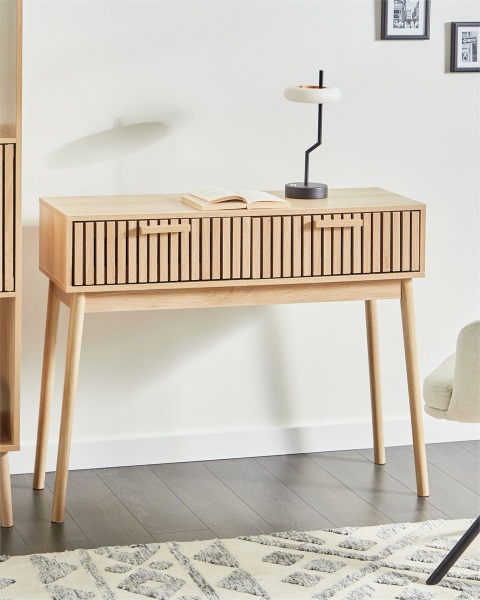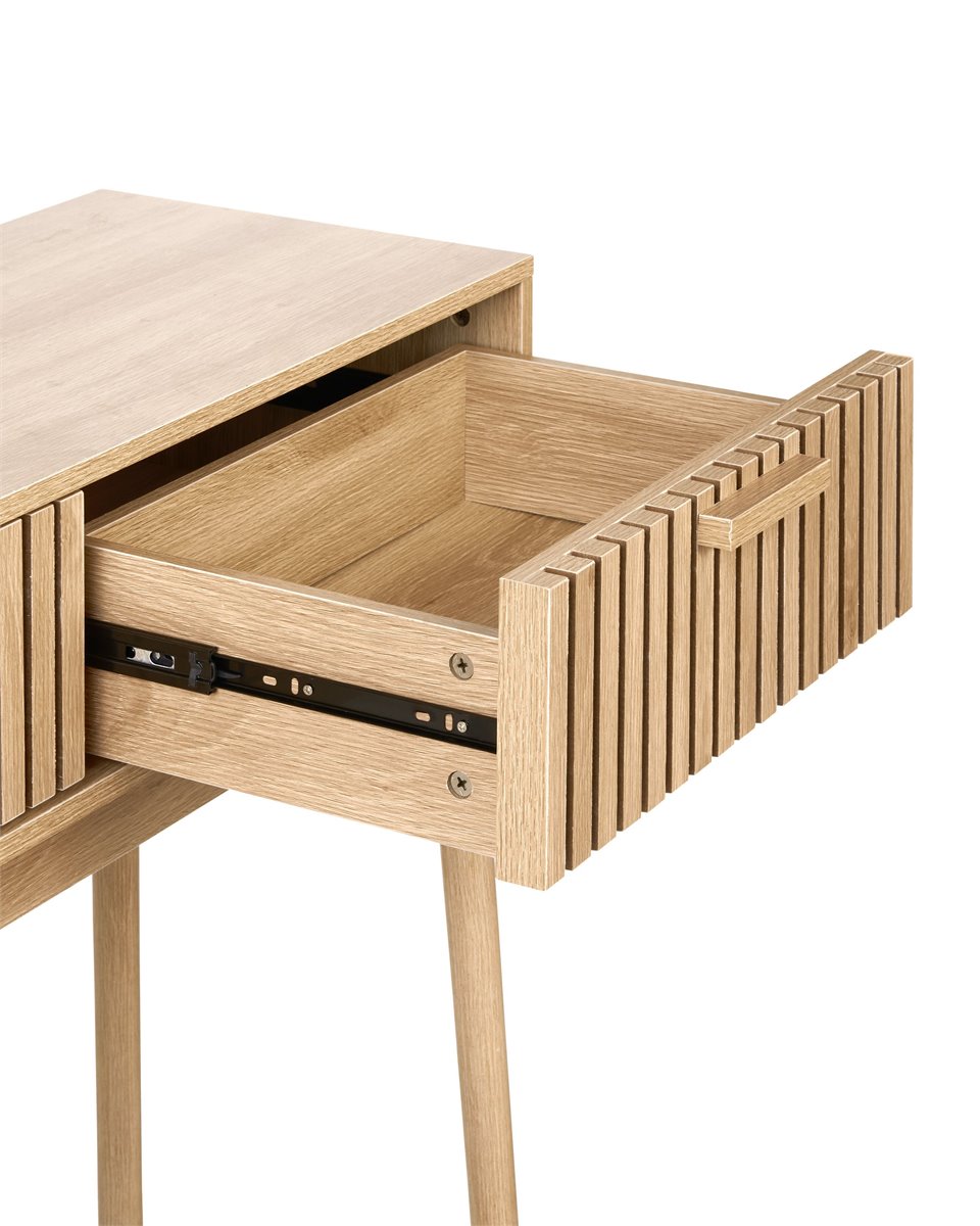 Consola con frentes acanalados. Esta consola de madera de ingeniería aportará a tu espacio un aspecto natural y acogedor con sus atractivos detalles de nudos de madera. Cuenta con dos amplios cajones con frentes acanalados decorativos, mezclando estilo con almacenamiento práctico para los objetos de uso diario. La consola apoyada en patas de madera maciza para una mayor estabilidad, es ideal para pasillos, salones o entradas, ya que añade funcionalidad y un toque de elegancia rústica a tu hogar.