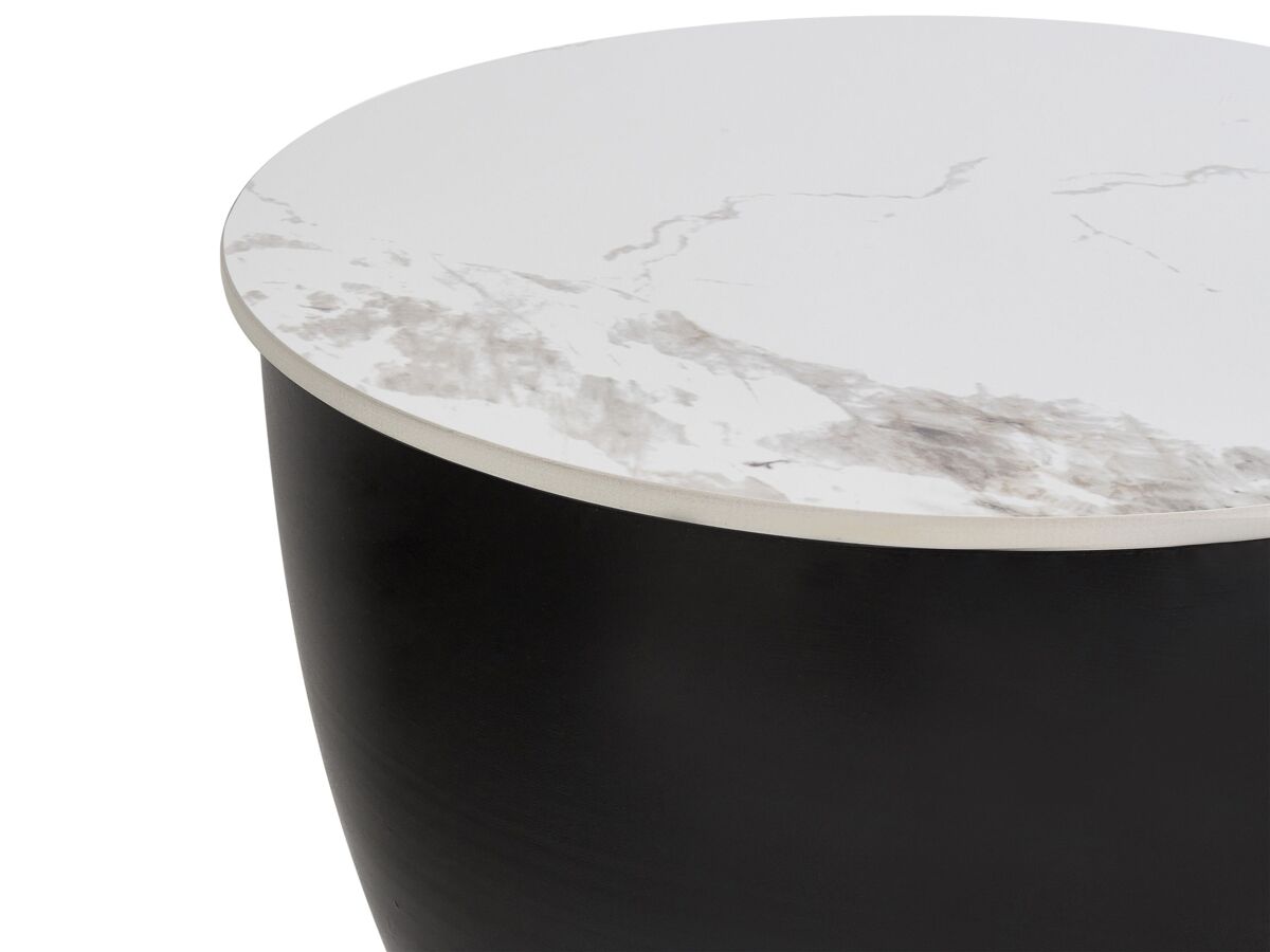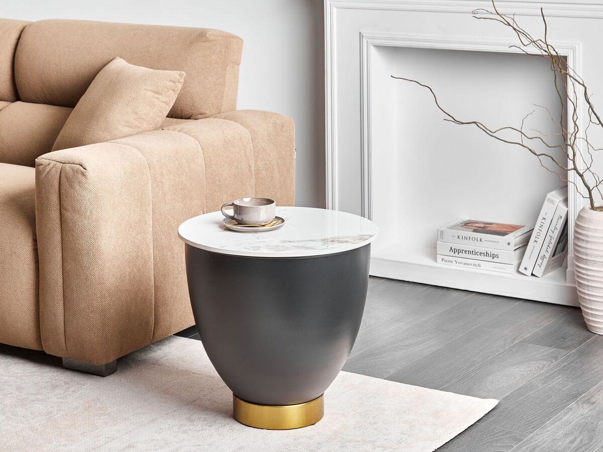 Mesa de estilo moderno. Una mezcla perfecta de estilo y funcionalidad, esta mesa auxiliar cuenta con una elegante base de metal con un sofisticado acabado en negro y un detalle dorado que le da un toque lujoso. El duradero tablero de piedra sinterizada ofrece un refinado aspecto marmóreo y es extraíble, dejando al descubierto un espacio de almacenaje oculto en su interior. Ideal para espacios modernos, ofrece una solución elegante y práctica para guardar lo esencial y realzar la decoración.