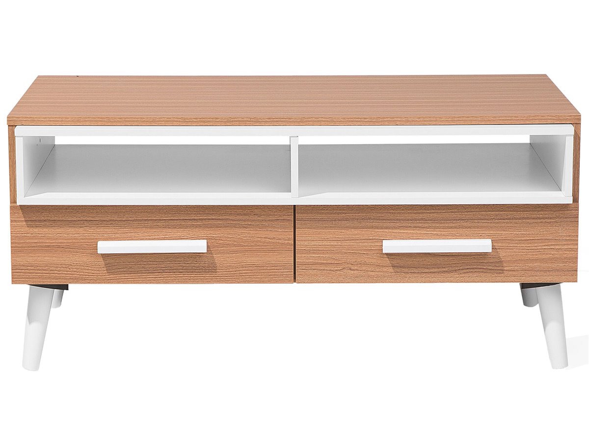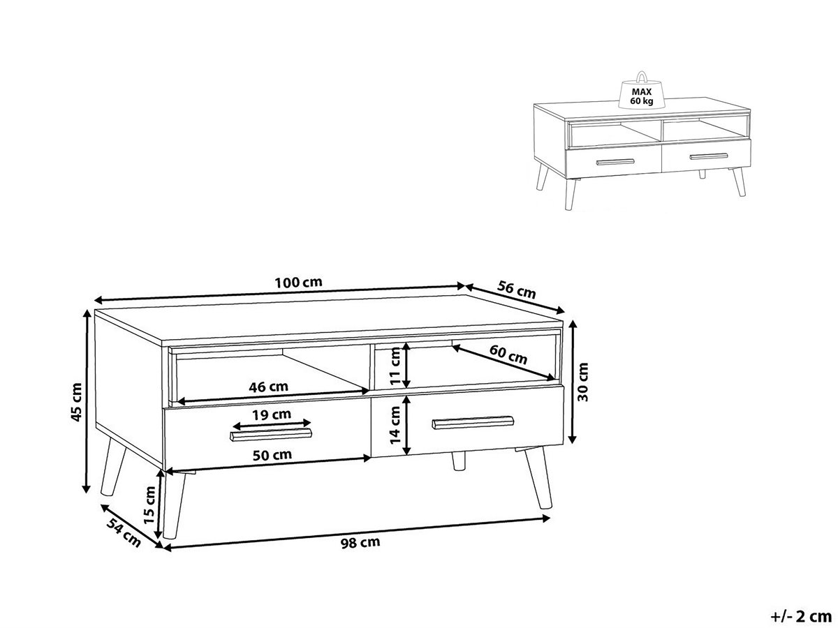 Mesa auxiliar. Añade un toque escandinavo a la decoración de tu sala de estar con esta mesa de centro. Está fabricada a partir de tablero de partículas de alta calidad. Los cajones y los estantes ofrecen el suficiente espacio de almacenaje para guardar libros, revistas u otros accesorios. Las patas de madera maciza garantizan la máxima estabilidad.
