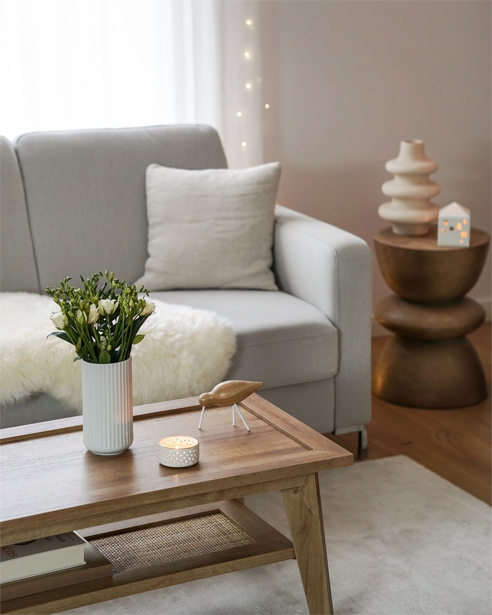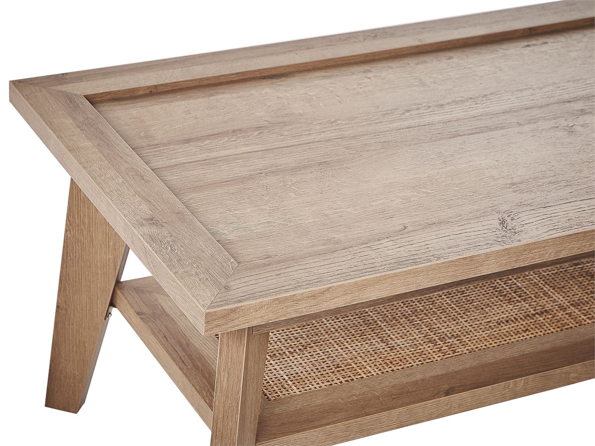 Mesa auxiliar. Añade modernidad a tu sala de estar con esta mesa de centro. Está fabricada a partir de tablero de fibra resistente y de bajo mantenimiento. El estante de ratán situado en la parte superior ofrece el suficiente espacio de almacenaje para guardar los distintos accesorios.