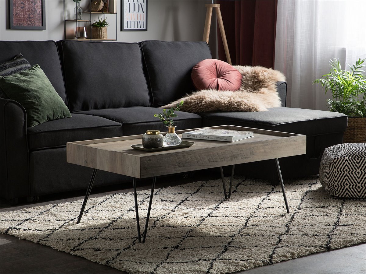 Mesa auxiliar. Esta mesa de centro impresiona por su hermosa forma y estructura que imita la madera. El tablero de la mesa recuerda a la madera tallada y ofrece una cantidad extraordinaria de espacio. Las patas de acero inoxidable tienen bordes redondeados y le dan a la mesa un toque de elegancia. Esta práctica y llamativa mesa de centro no debe faltar en ningún hogar.