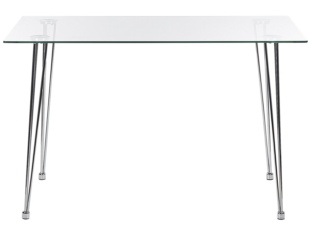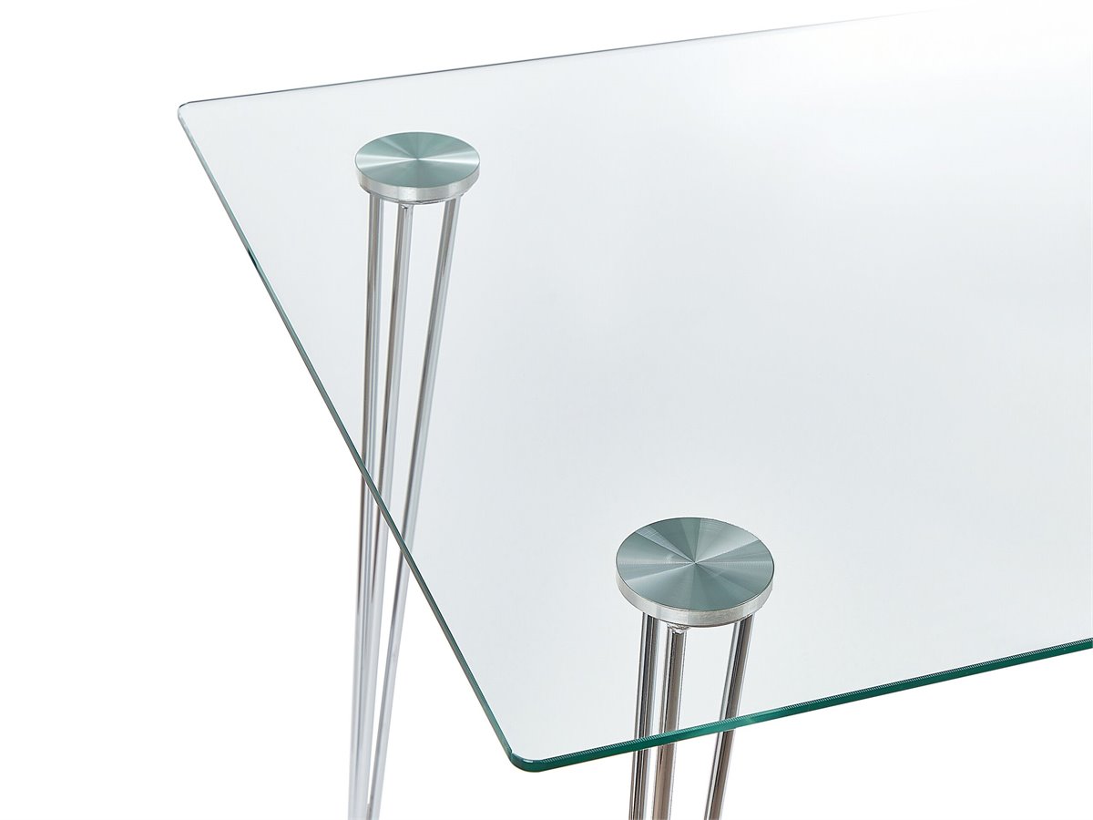 Mesa de diseño moderno. Añade modernidad a tu interior con esta mesa de comedor. El tablero está fabricado a partir de vidrio templado duradero y de alta calidad. Las patas de metal cromado ofrecen estabilidad.