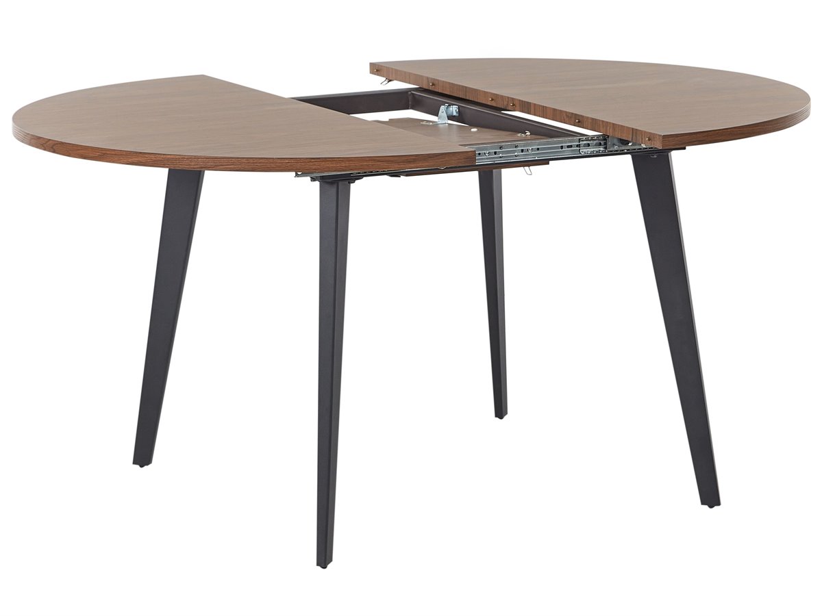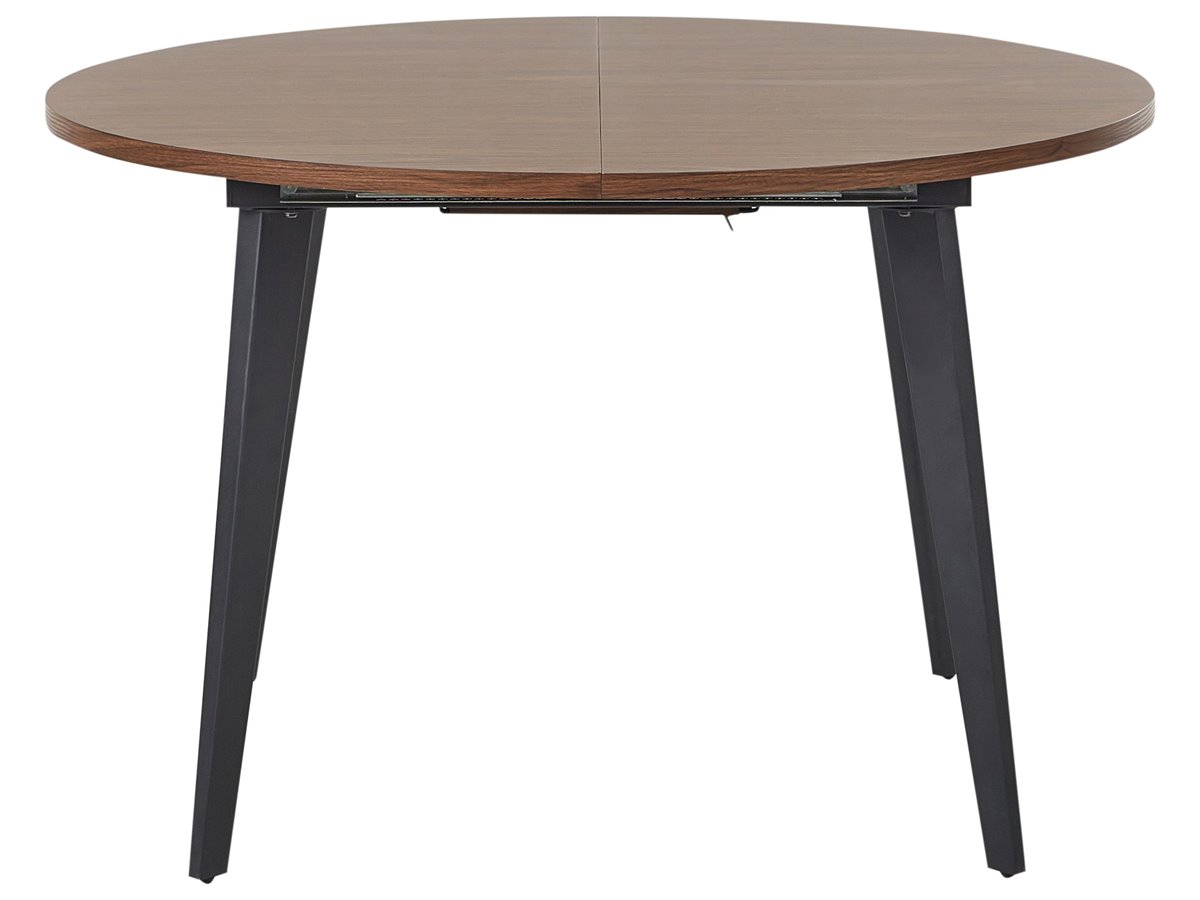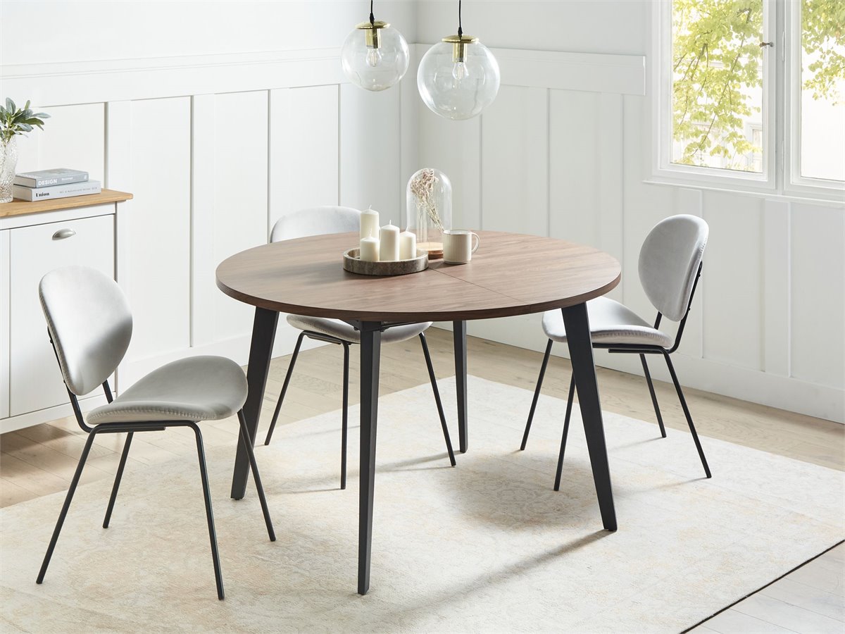 Mesa de comedor redonda extensible. Dale un toque moderno a tu cocina o comedor con esta elegante mesa. El tablero, fabricado en MDF chapado, presenta tonos de madera oscura con bordes suaves y redondeados que le dan un aspecto pulido. Apoyada en robustas patas de metal con recubrimiento en polvo negro, le dan un toque contemporáneo y proporcionan estabilidad. Tiene capacidad para cuatro personas en las comidas diarias y cuenta con una ampliación en forma de hoja de mariposa que facilita su uso para más comensales.