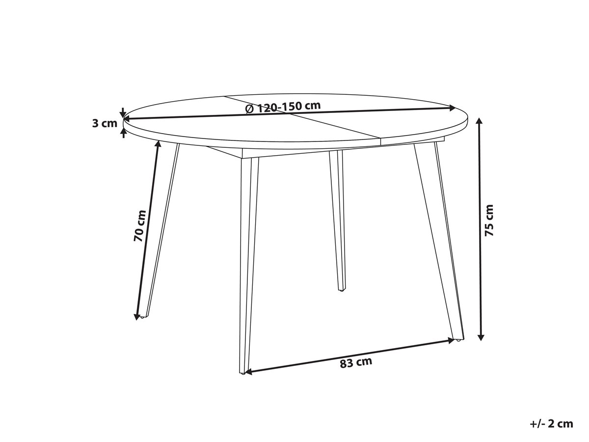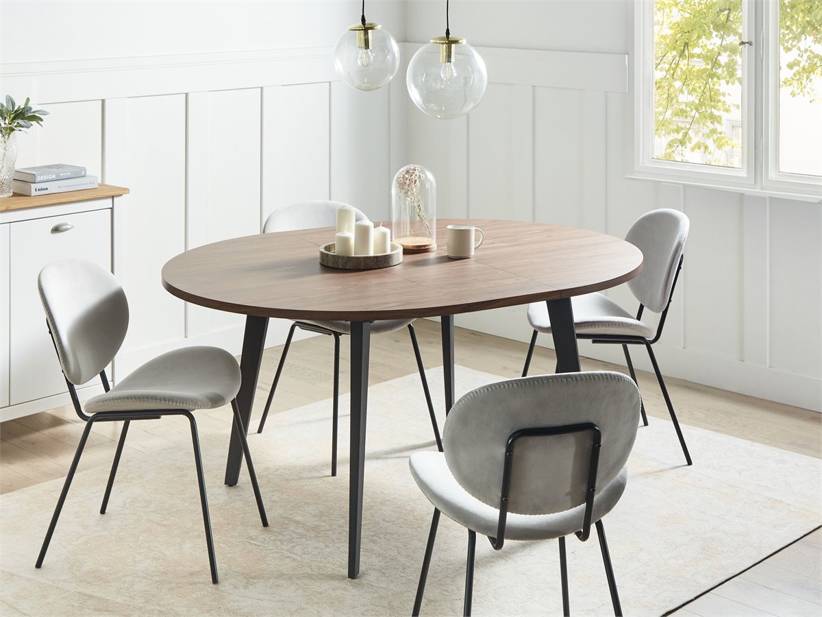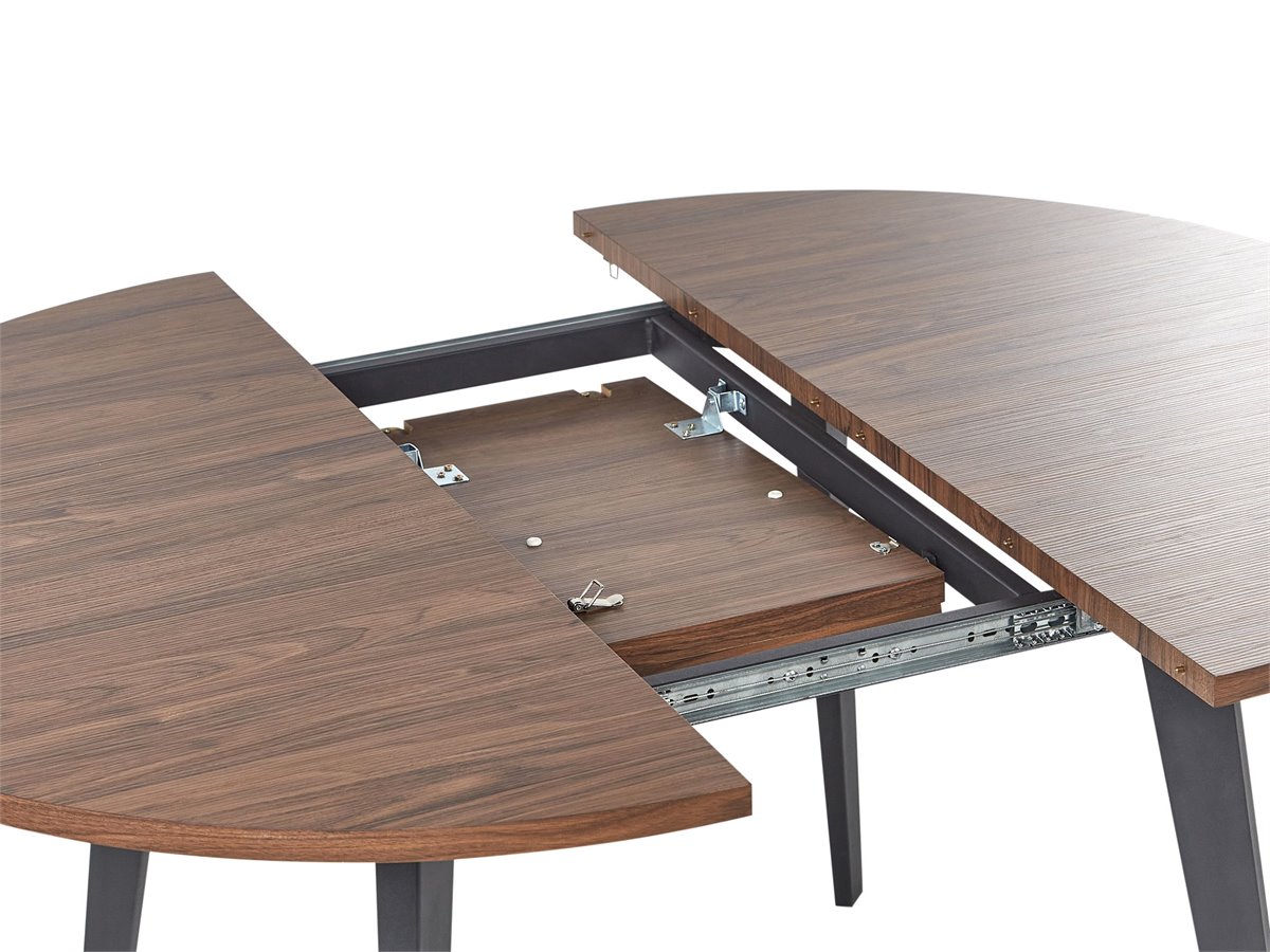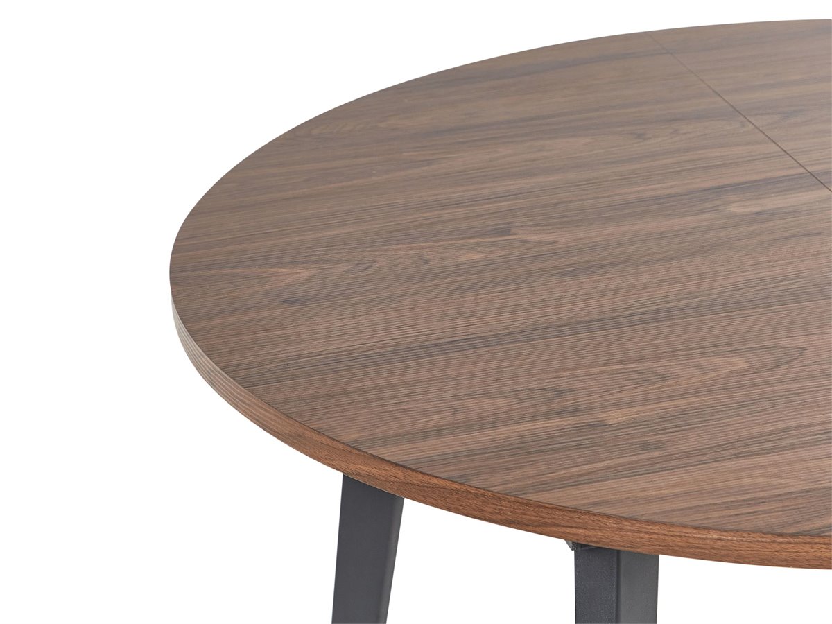 Mesa de comedor redonda extensible. Dale un toque moderno a tu cocina o comedor con esta elegante mesa. El tablero, fabricado en MDF chapado, presenta tonos de madera oscura con bordes suaves y redondeados que le dan un aspecto pulido. Apoyada en robustas patas de metal con recubrimiento en polvo negro, le dan un toque contemporáneo y proporcionan estabilidad. Tiene capacidad para cuatro personas en las comidas diarias y cuenta con una ampliación en forma de hoja de mariposa que facilita su uso para más comensales.