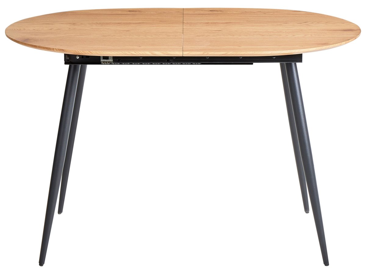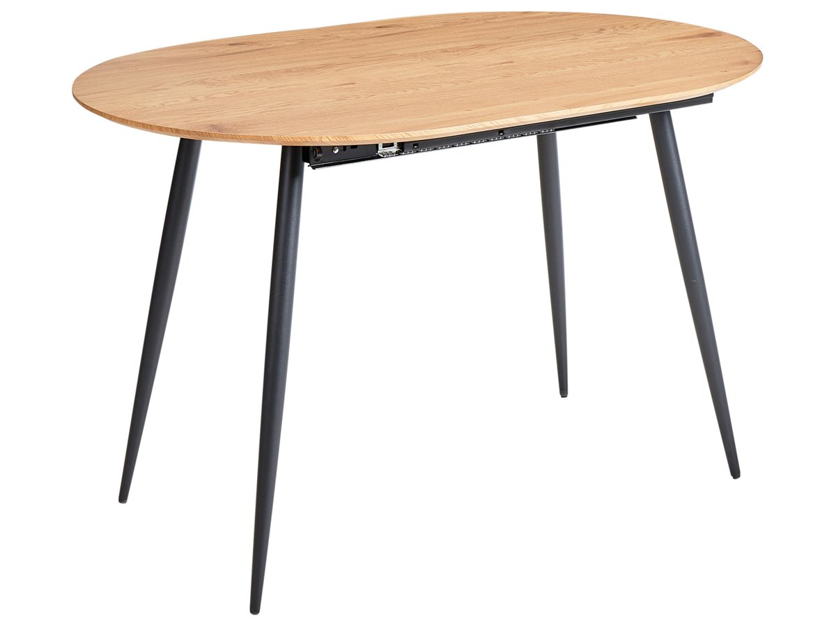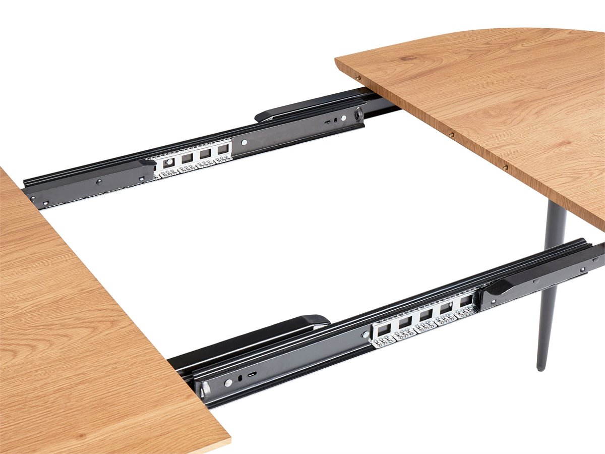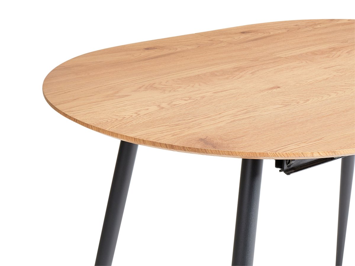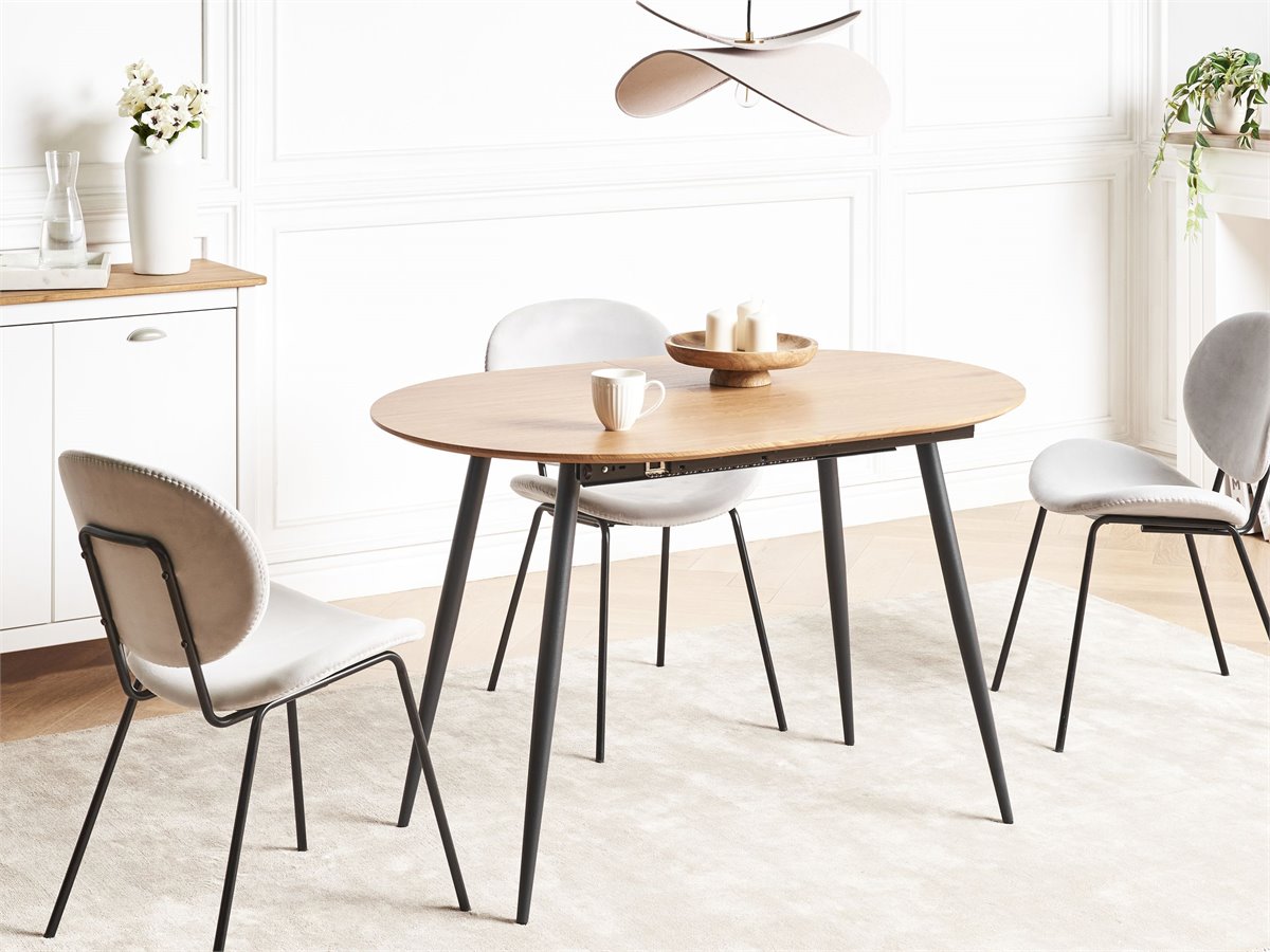 Mesa de comedor ovalada. Esta elegante mesa es el complemento perfecto para cualquier hogar, ya que se adapta fácilmente a tu espacio cuando es necesario. Con bordes redondeados y un acabado suave en tono madera clara, aporta un aspecto cálido y acogedor a su comedor. Las patas negras ofrecen un contraste moderno, mientras que su diseño extensible la hace apta para estancias grandes y pequeñas, ya sea en la cocina o en el salón.