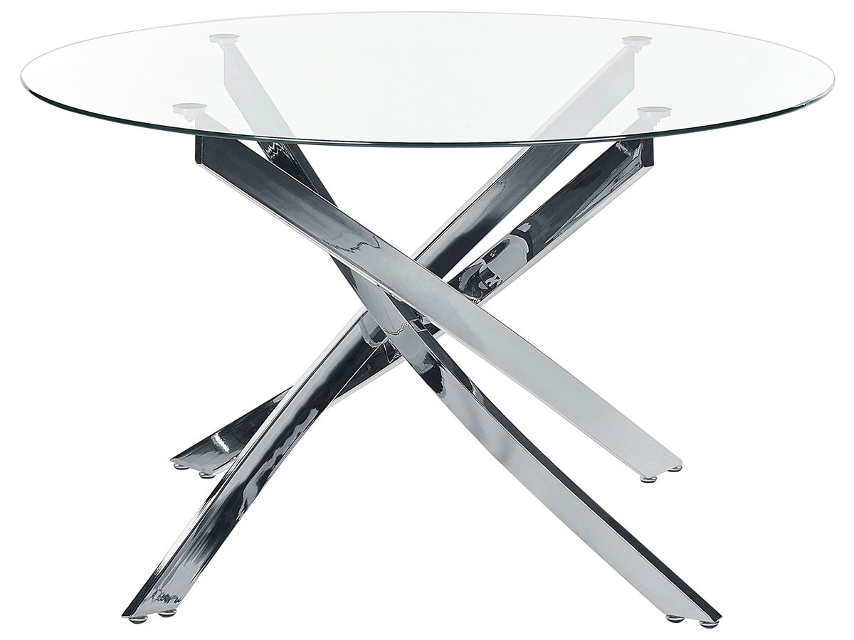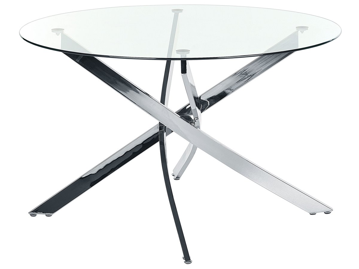 Mesa de diseño moderno. Esta mesa redonda encajará en un interior moderno, añadiendo un toque de glamour a la decoración. La pieza, colocada sobre patas de hierro cromado, sin duda destacará en tu comedor. El tablero es de vidrio templado, que no requiere mantenimiento diario y durará muchos años.
