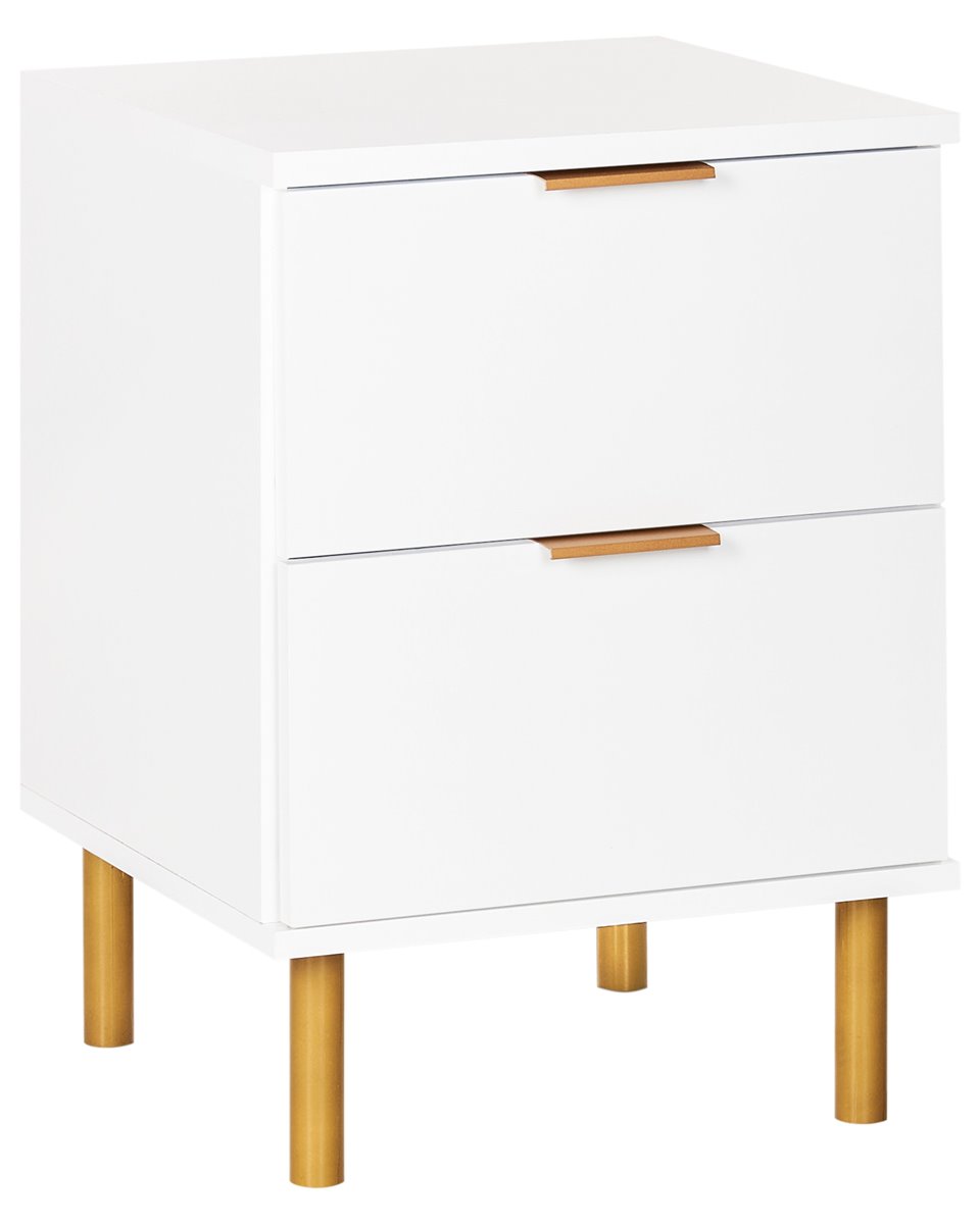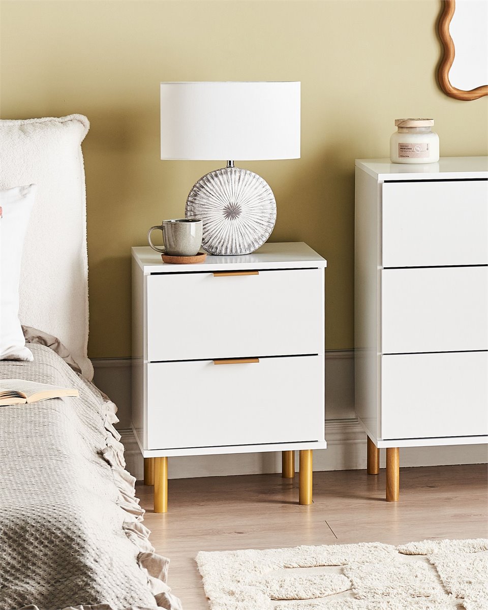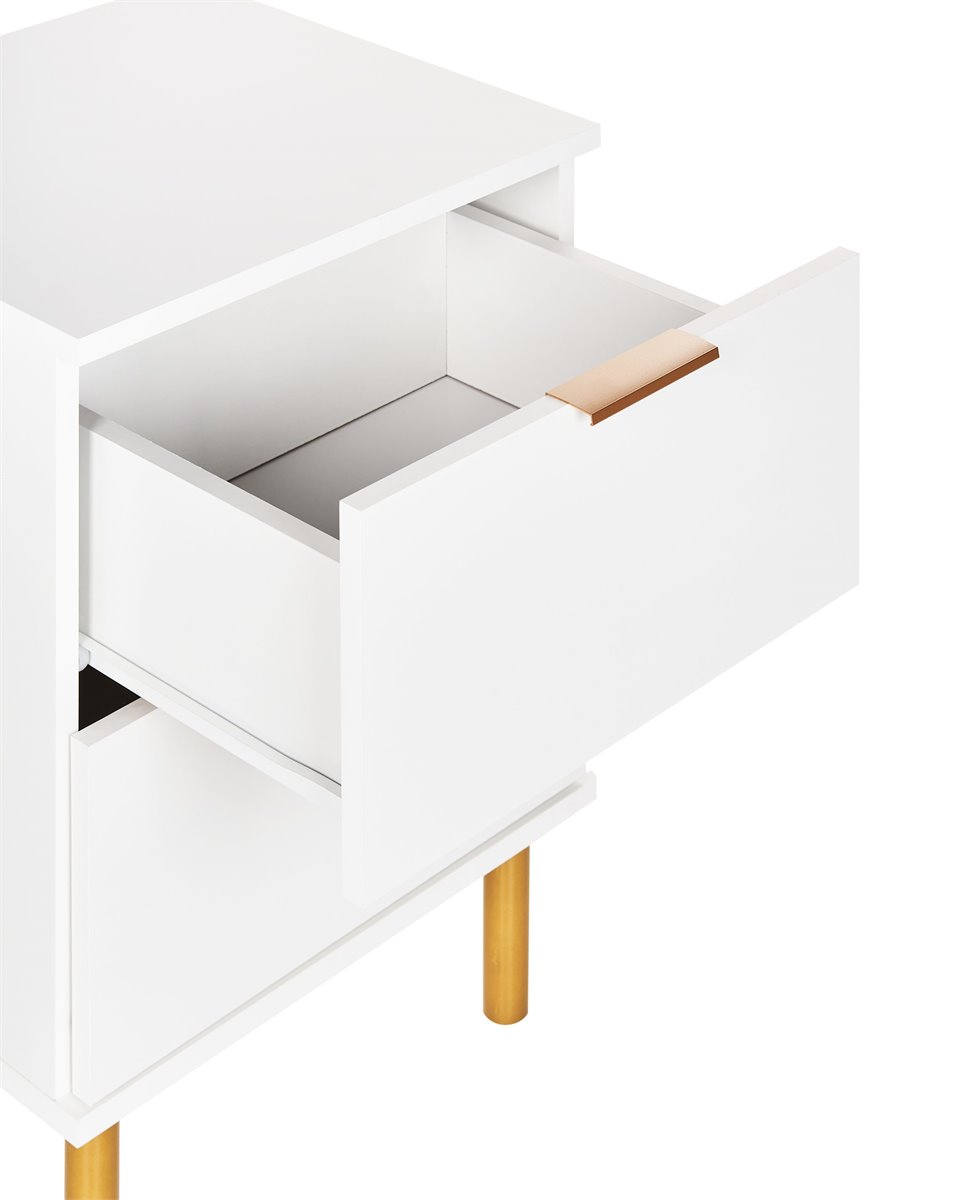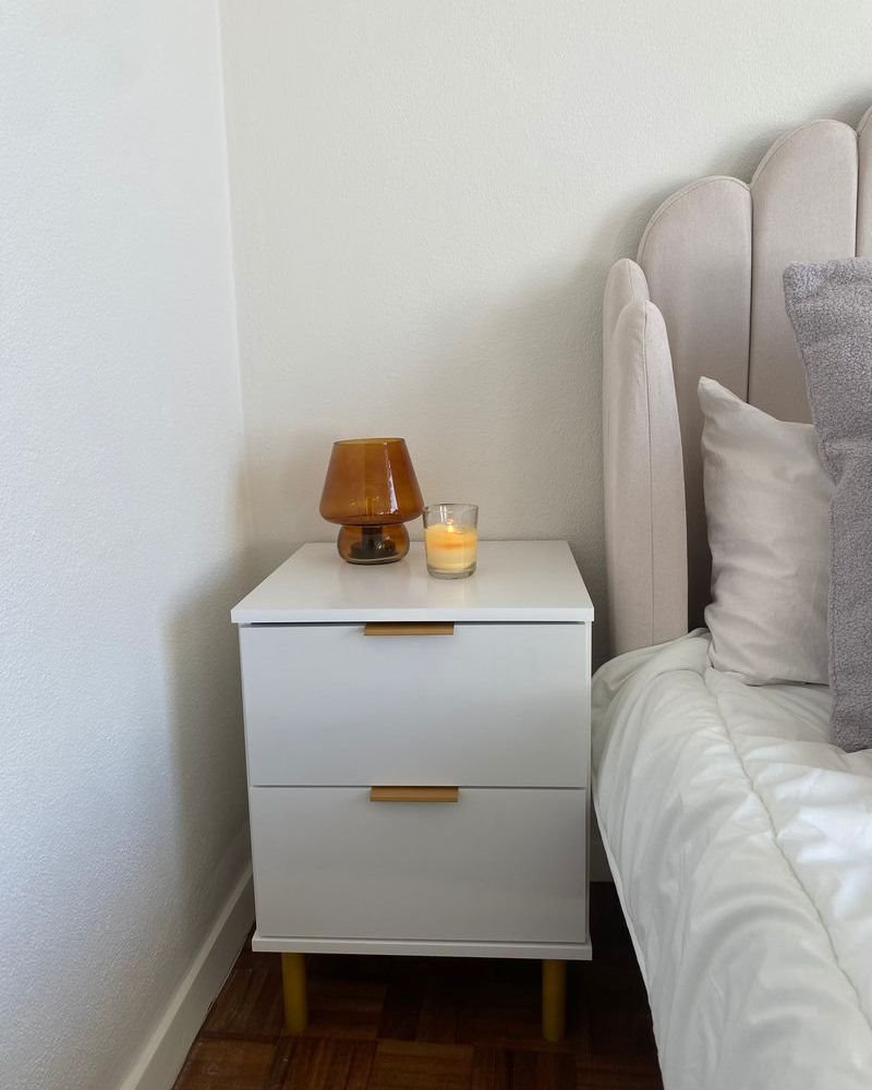 Mesilla de estilo retro. Esta elegante mesita de noche cuenta con dos amplios cajones con llamativos tiradores dorados, que combinan la practicidad con un toque de glamour. Fabricada con patas de madera maciza, ofrece una gran estabilidad y durabilidad. Perfecta para mantener organizados los objetos esenciales a la hora de dormir, su elegante diseño complementa los estilos de dormitorio clásicos y modernos. Es un complemento elegante y funcional que mejorará tu espacio sin esfuerzo.