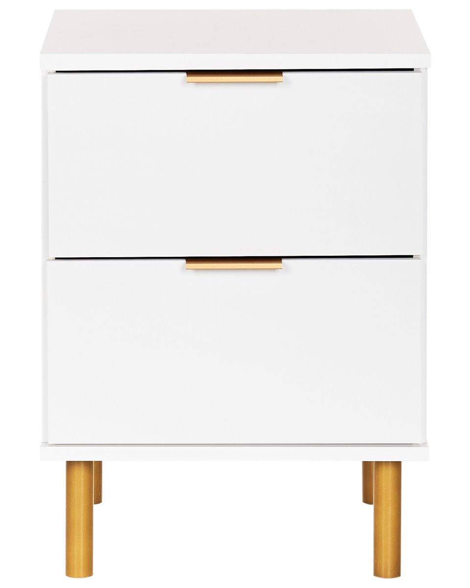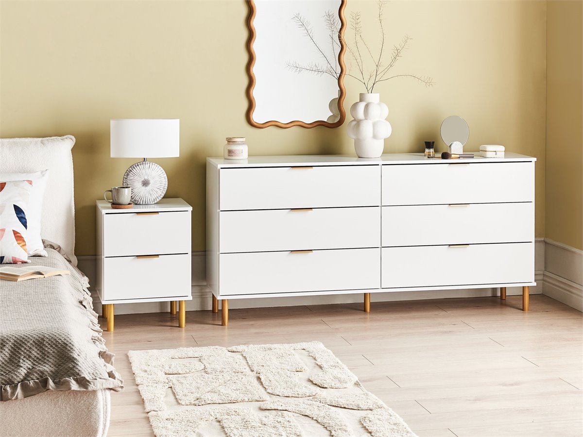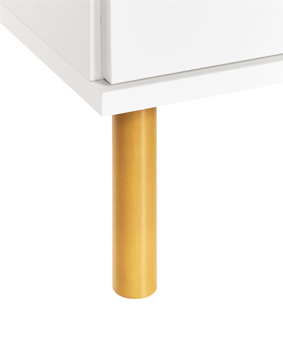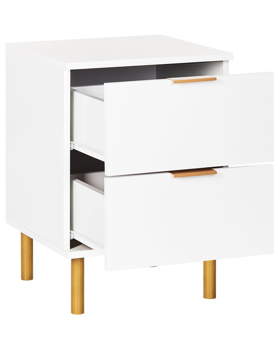 Mesilla de estilo retro. Esta elegante mesita de noche cuenta con dos amplios cajones con llamativos tiradores dorados, que combinan la practicidad con un toque de glamour. Fabricada con patas de madera maciza, ofrece una gran estabilidad y durabilidad. Perfecta para mantener organizados los objetos esenciales a la hora de dormir, su elegante diseño complementa los estilos de dormitorio clásicos y modernos. Es un complemento elegante y funcional que mejorará tu espacio sin esfuerzo.