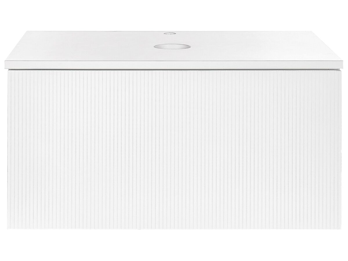 Mueble de pared con cajones. Renueva tu cuarto de baño con este elegante y funcional armario colgante de pared. Su diseño estilizado y moderno, con frentes estriados, añade un toque de sofisticación, mientras que el espacioso cajón proporciona un amplio espacio de almacenaje para tus básicos de aseo. El diseño del armario oculta hábilmente los accesorios de fontanería, creando un aspecto limpio y despejado. Los orificios pre cortados en la encimera facilitan y agilizan la instalación del lavabo, garantizando un espacio de baño organizado y sin juntas.