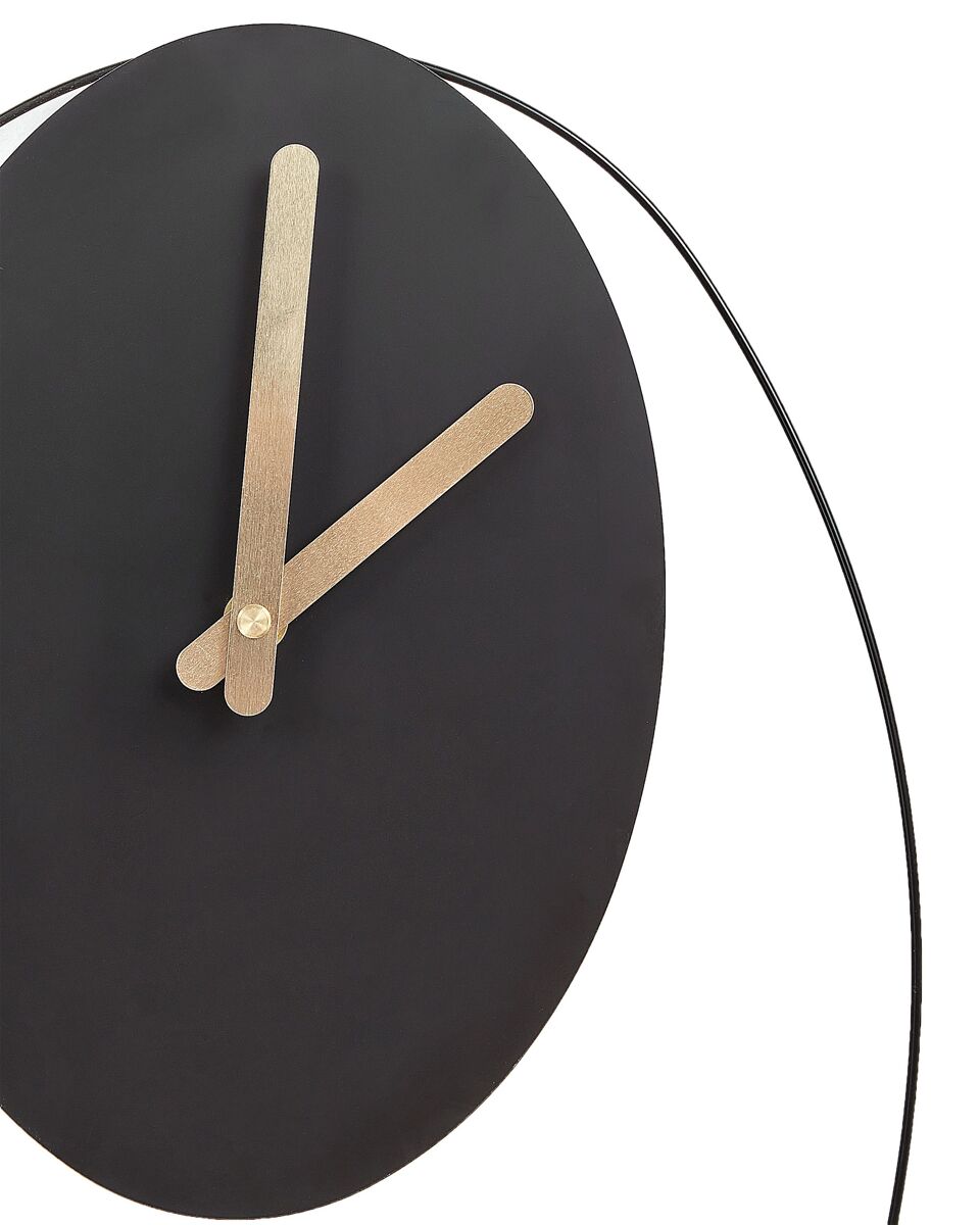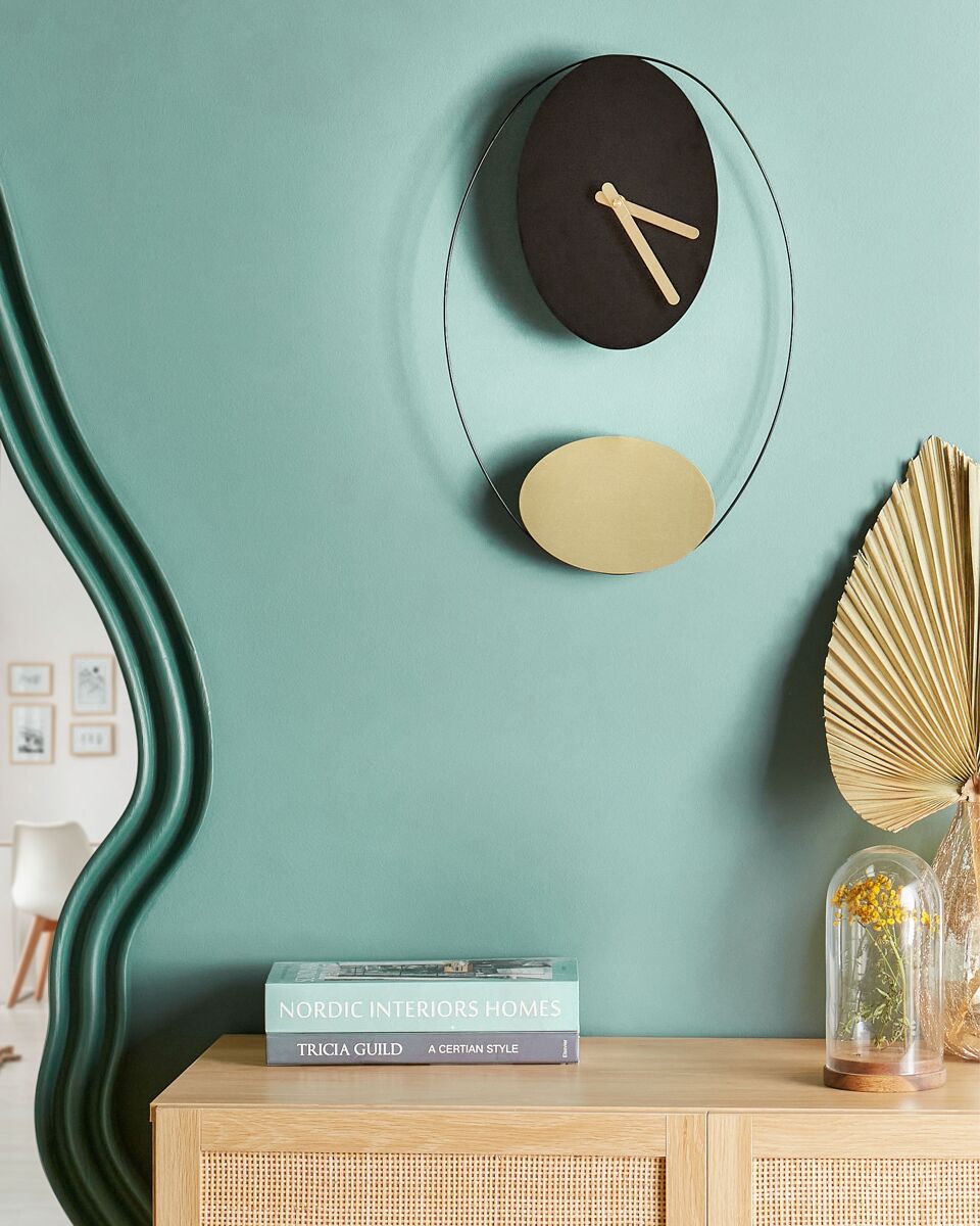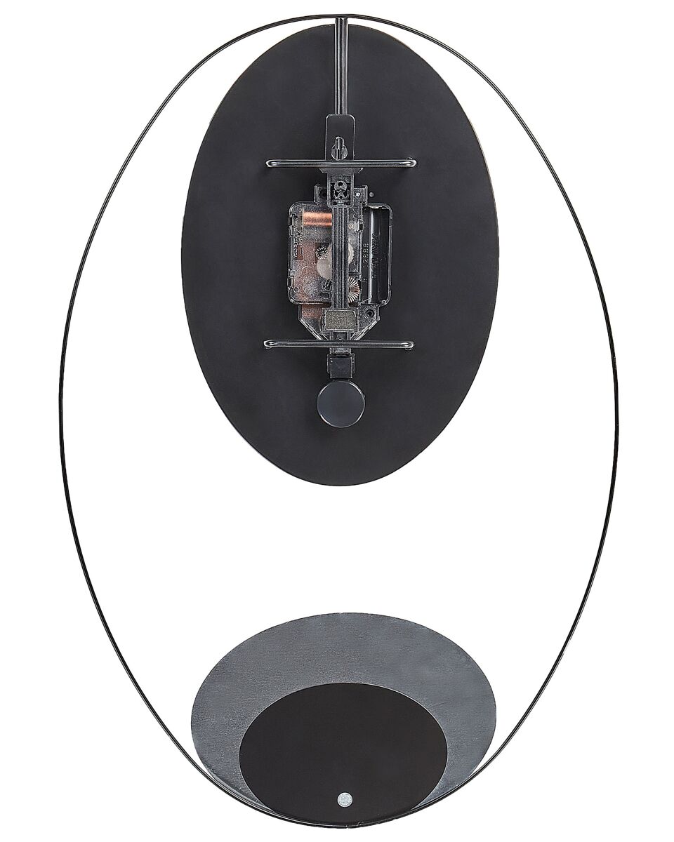 Reloj con péndulo decorativo sin números. Un escultural reloj de pared que combina el diseño artístico con la funcionalidad. Sus formas ovaladas, suspendidas dentro de un fino marco de alambre, dan la ilusión de flotar, mientras que la paleta de colores negro y dorado añade un sofisticado contraste. Perfecto para interiores modernos, este reloj ofrece una forma única y elegante de controlar el tiempo a la vez que realza tu decoración.