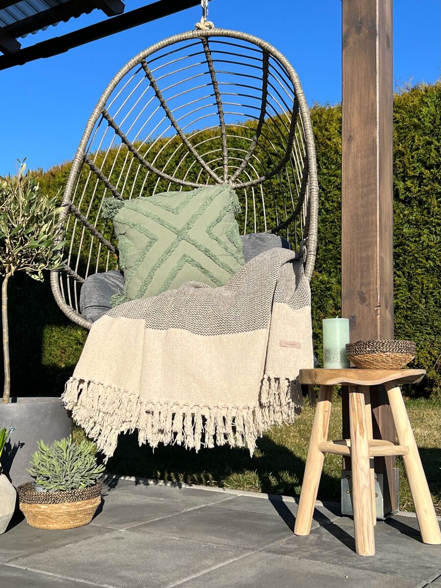 Silla colgante estilo boho. Añade comodidad a tu zona exterior con esta silla colgante. Está fabricada a partir de ratán sintético de alta calidad. La estructura de metal proporciona estabilidad y durabilidad. Los cojines de acolchado grueso ofrecen la máxima comodidad. Combina bien en cualquier balcón o terraza de estilo boho.
