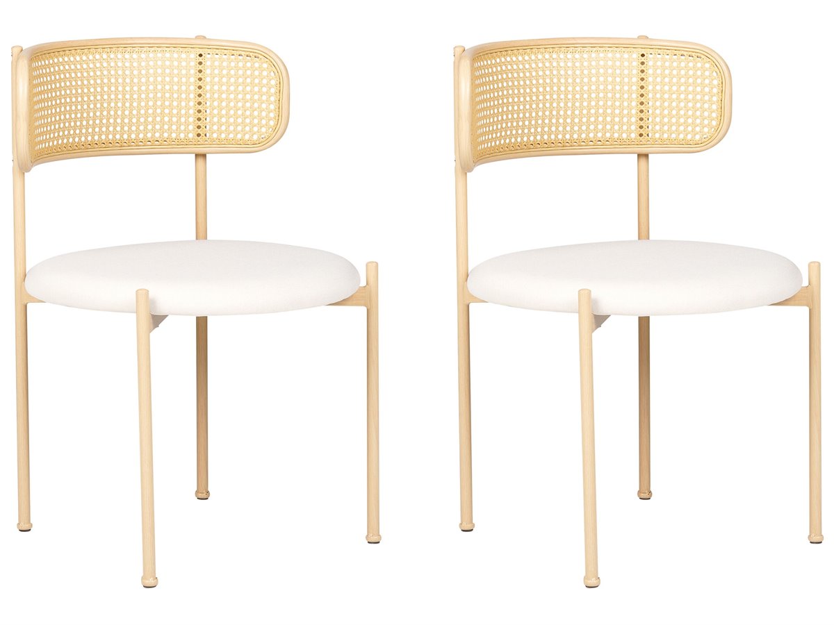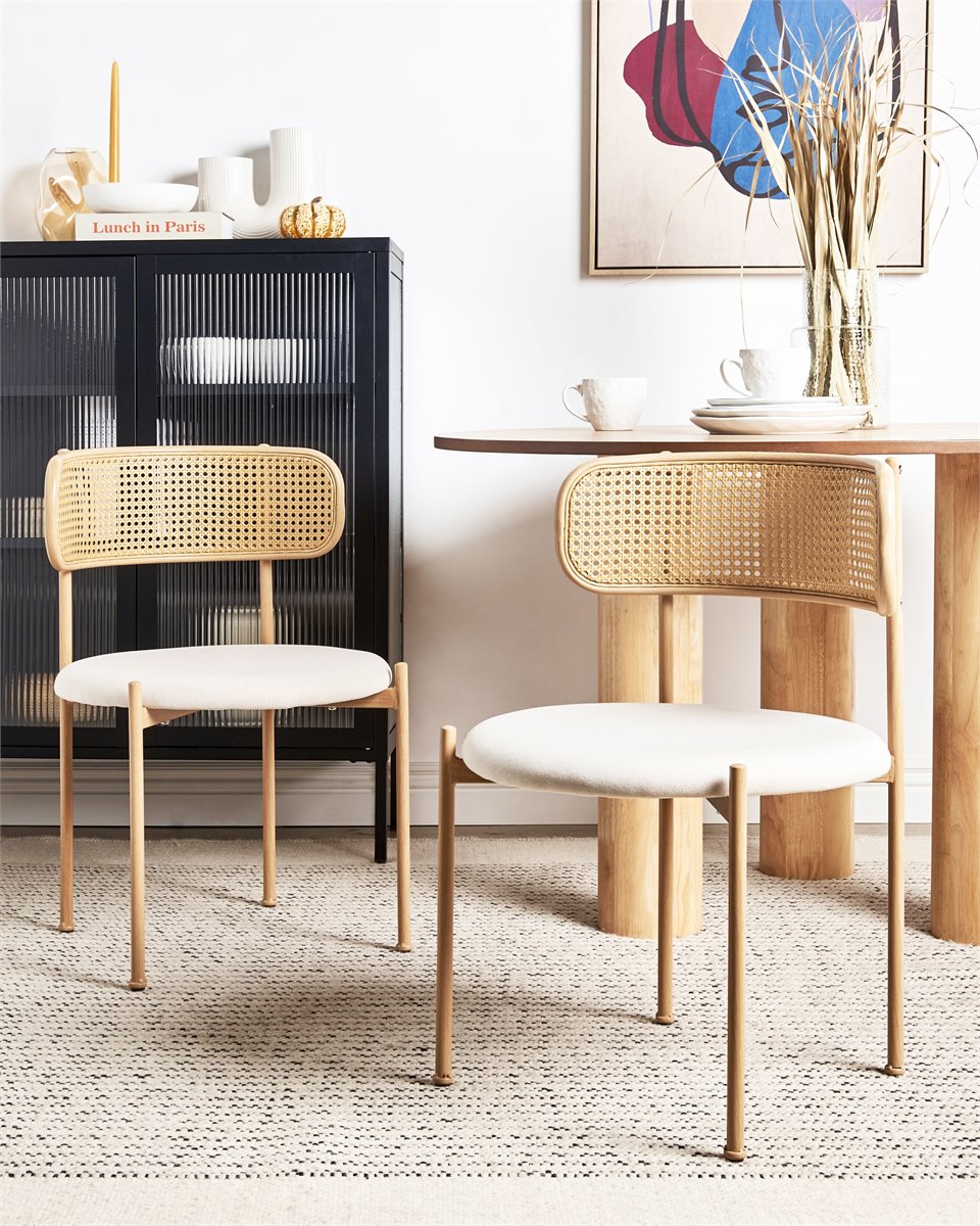 Sillas decorativas con respaldo de trenza vienesa. Embárcate en un viaje en el tiempo con este dúo de sillas fabricadas en metal, donde la fuerza industrial se une a la delicadeza retro. Disfruta del abrazo de los asientos y respaldos de tela adornados con trenza vienesa, una fusión de comodidad y elegancia vintage. Gracias a sus elegantes patas con tapas, estas sillas bailan con gracia sobre las superficies, garantizando que tus suelos permanezcan intactos. Canalizando la nostalgia, estas piezas redefinen tu espacio, transformándolo en un refugio donde el pasado y el presente armonizan sin esfuerzo.