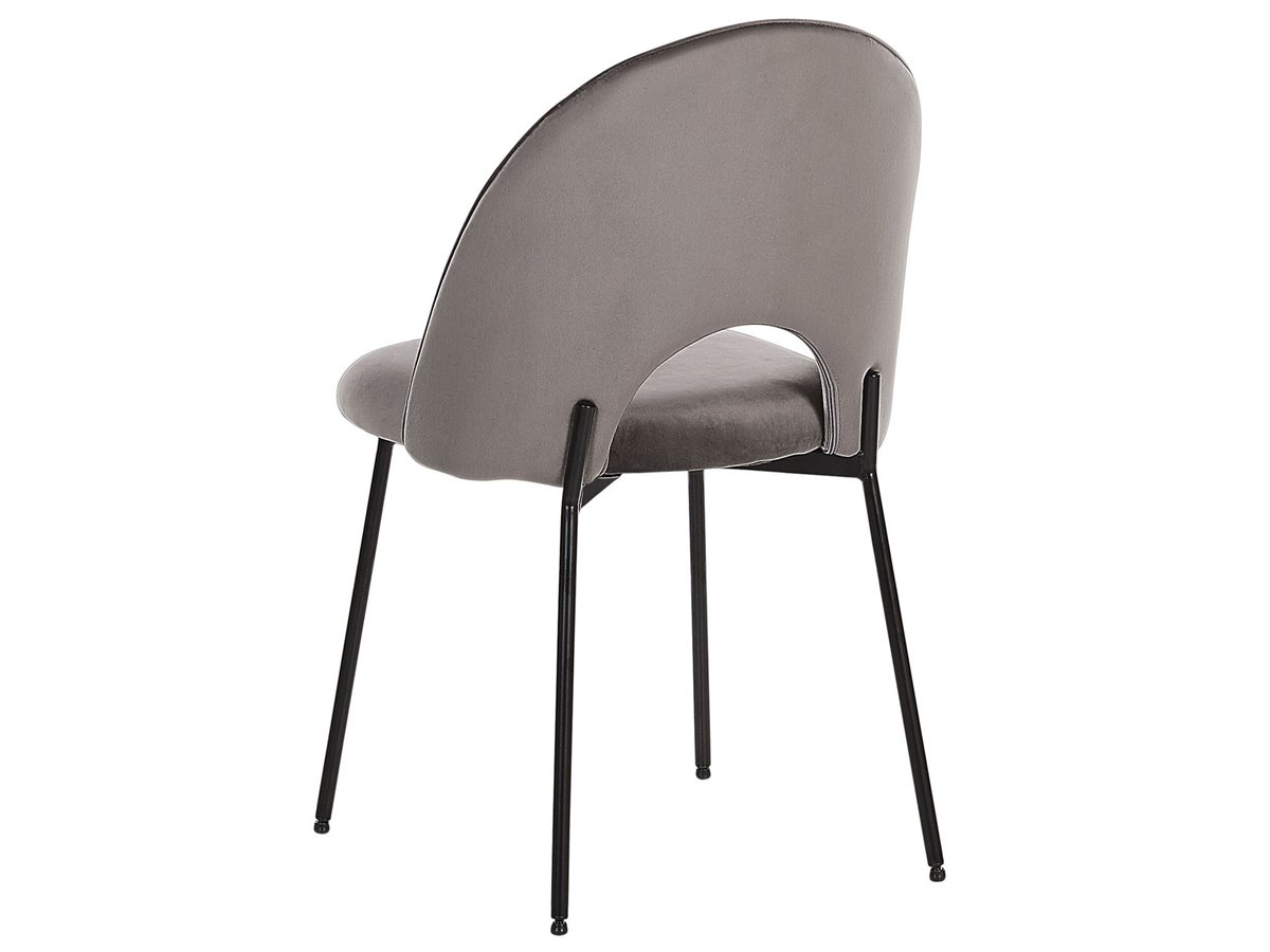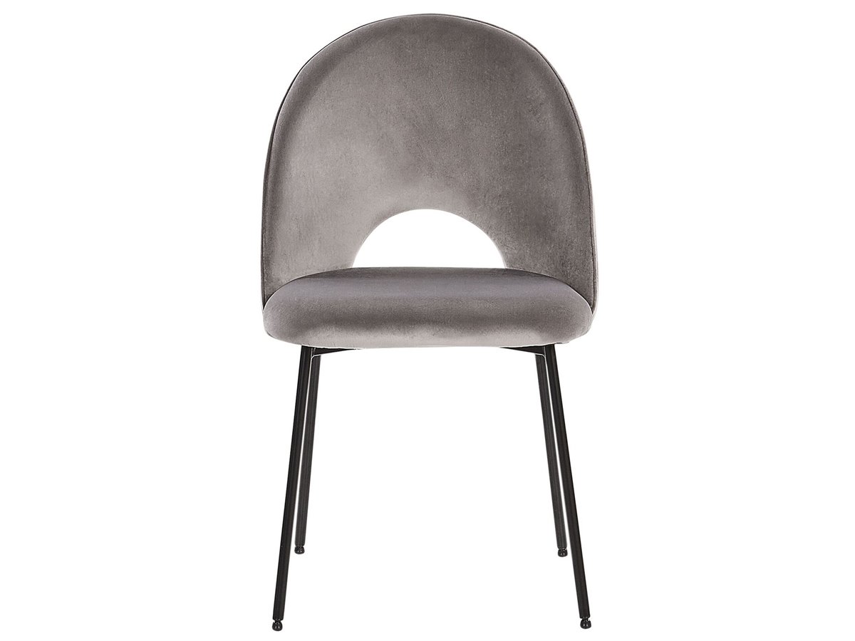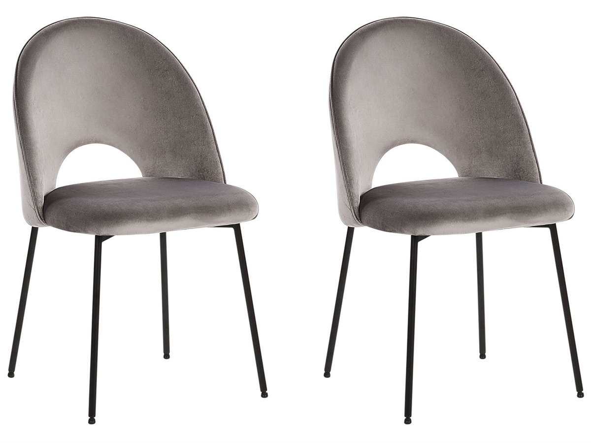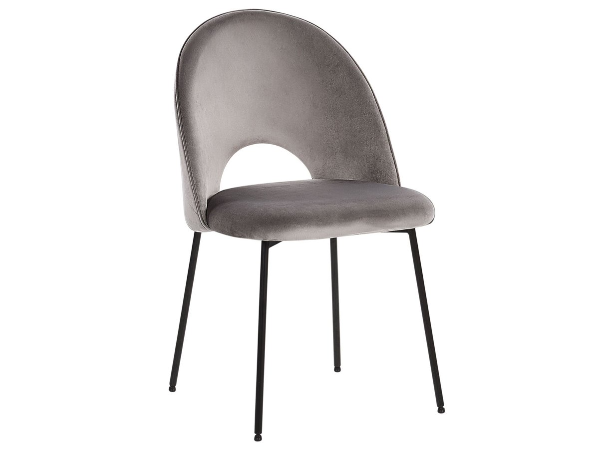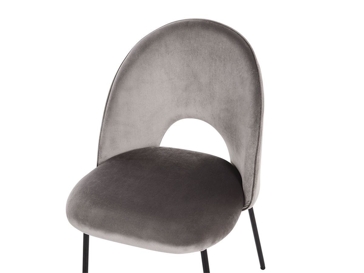 Juego de sillas de diseño. Añade un toque retro a tu interior con este conjunto de 2 sillas de comedor. Está fabricado a partir de terciopelo de alta calidad y suave al tacto. El hueco decorativo en el respaldo combina bien con cualquier esquema de decoración moderno o tradicional. Las patas de metal aportan un cierto carácter al diseño.