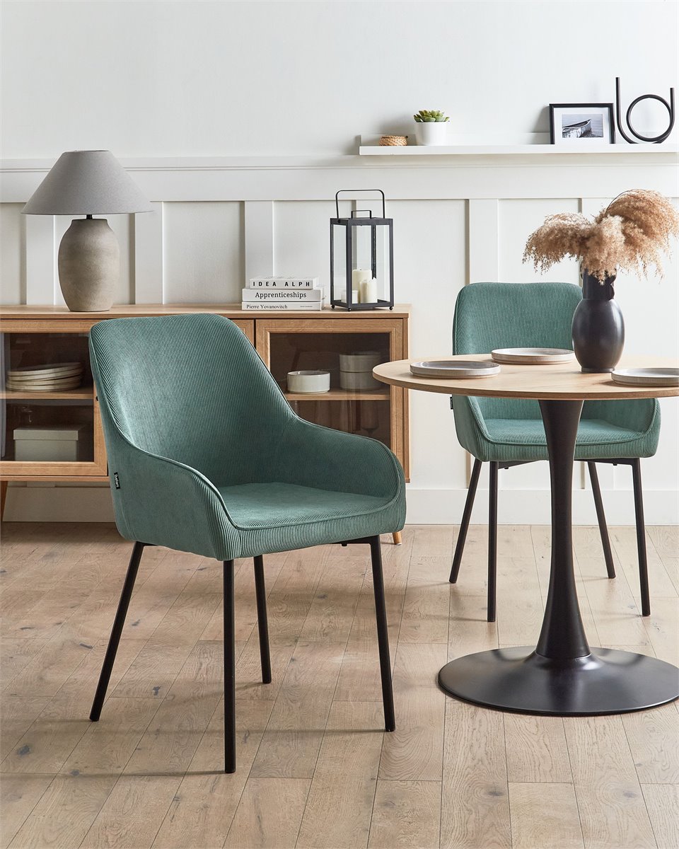 Juego de sillas de diseño. Añade un toque retro a tu interior con este conjunto de 2 sillas de comedor. Está fabricado a partir de terciopelo de alta calidad. Los reposabrazos y los asientos acolchados proporcionan la máxima comodidad. El diseño con costuras en la parte posterior combina bien con cualquier comedor moderno, glamuroso o de inspiración industrial.