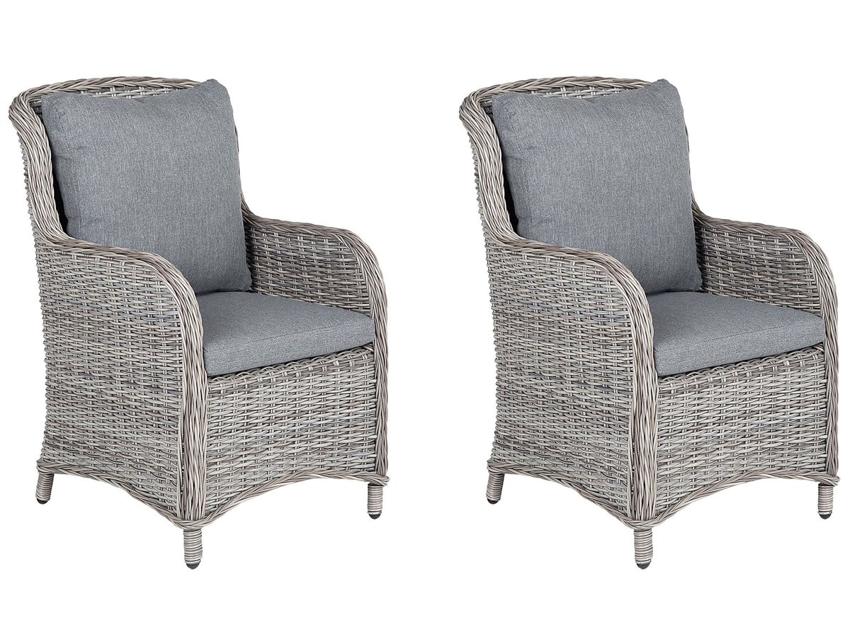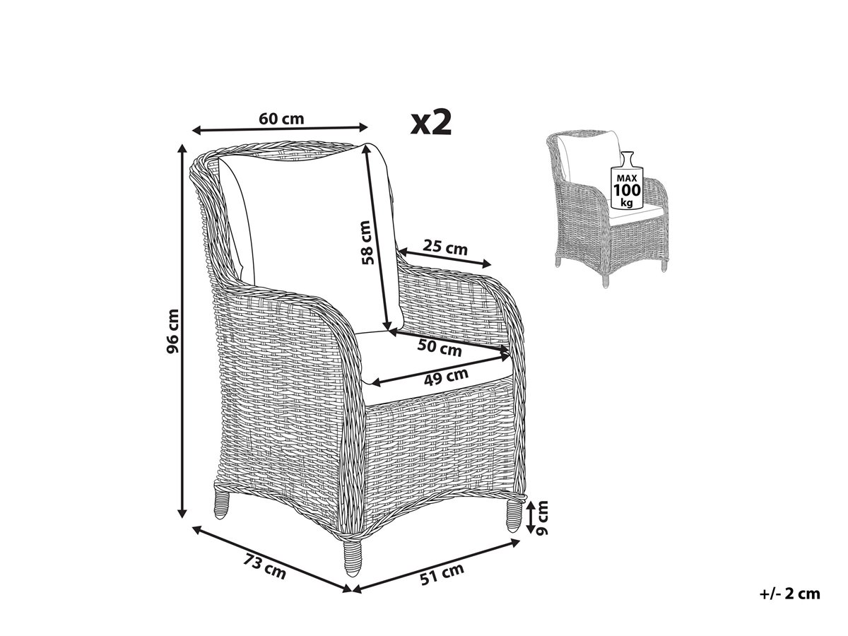Juego de sillas de ratán sintético. Añade a tu zona exterior este conjunto de 2 sillas de jardín. Está fabricado a partir de ratán sintético de alta calidad. El respaldo acolchado y los cojines de asiento proporcionan la máxima comodidad. La estructura de aluminio resistente ofrece estabilidad. Combina bien con cualquier área contemporánea, tradicional o moderna.