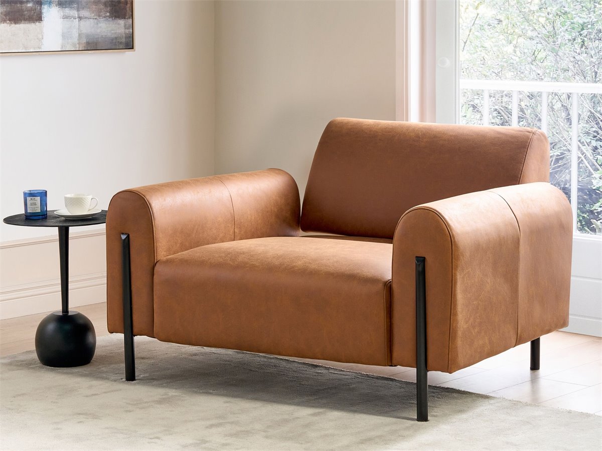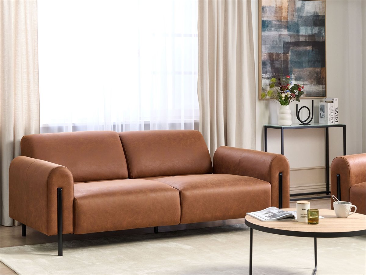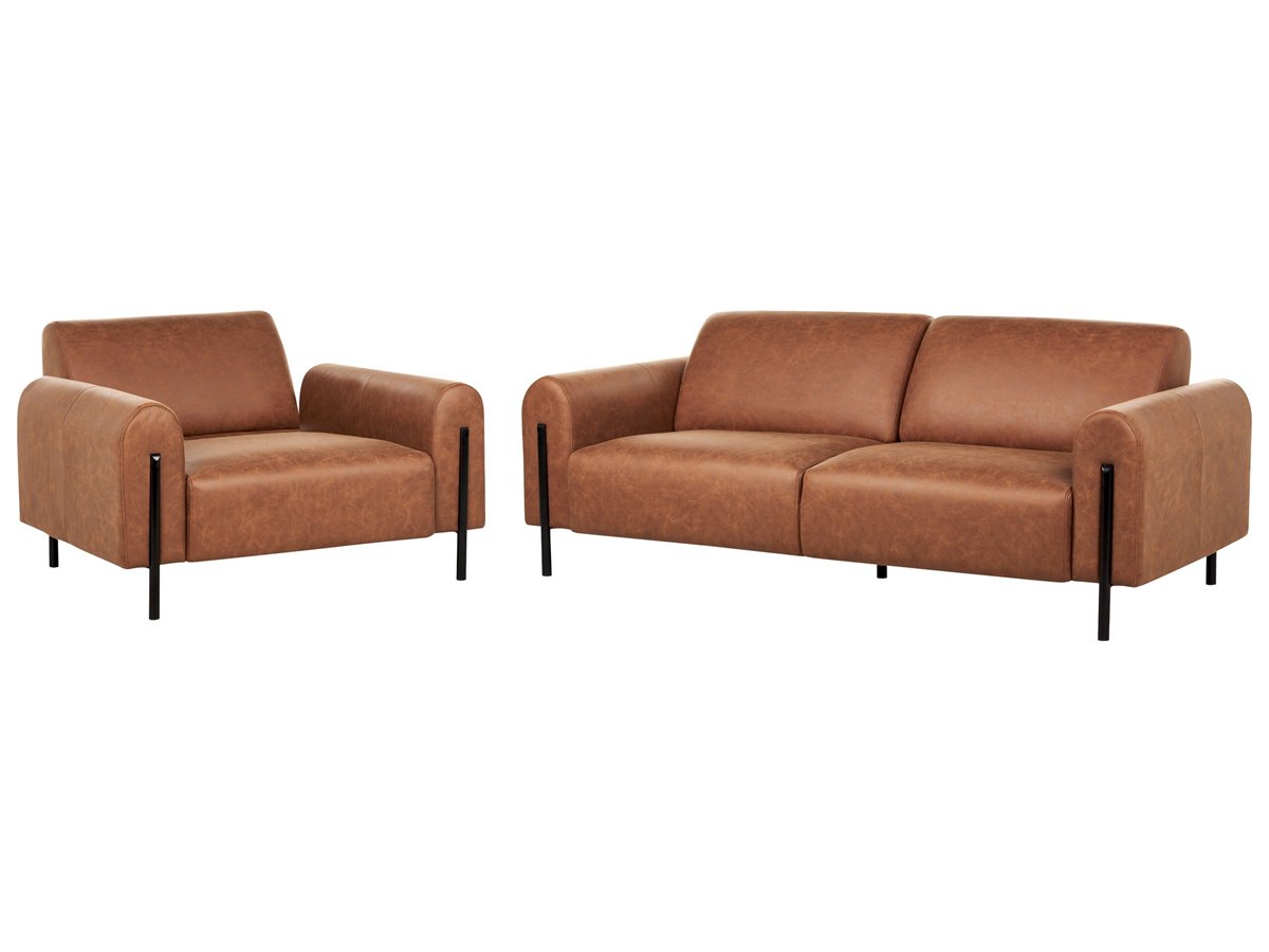 Juego de salón con efecto cuero. Experimenta la mezcla perfecta de tradición y modernidad con este exquisito conjunto de salón. Compuesto por un sofá y un sillón, está diseñado para albergar hasta cuatro personas. Su elegante diseño se complementa con robustas patas de metal que garantizan su estabilidad. La duradera tapicería se asemeja a la piel y promete longevidad y estilo. Disfruta de una comodidad personalizable gracias a su respaldo deslizante, que proporciona una superficie de asiento adicional para una relajación total.