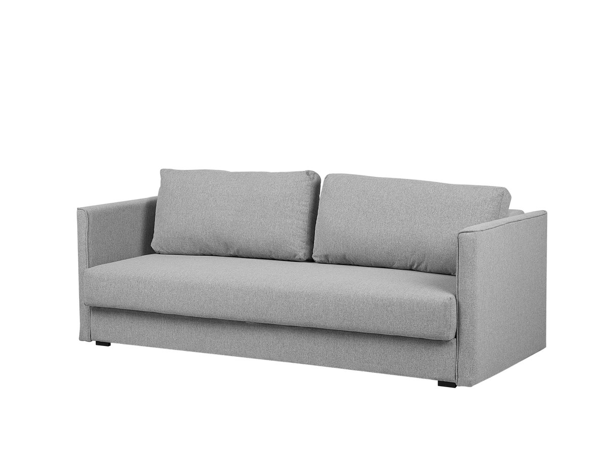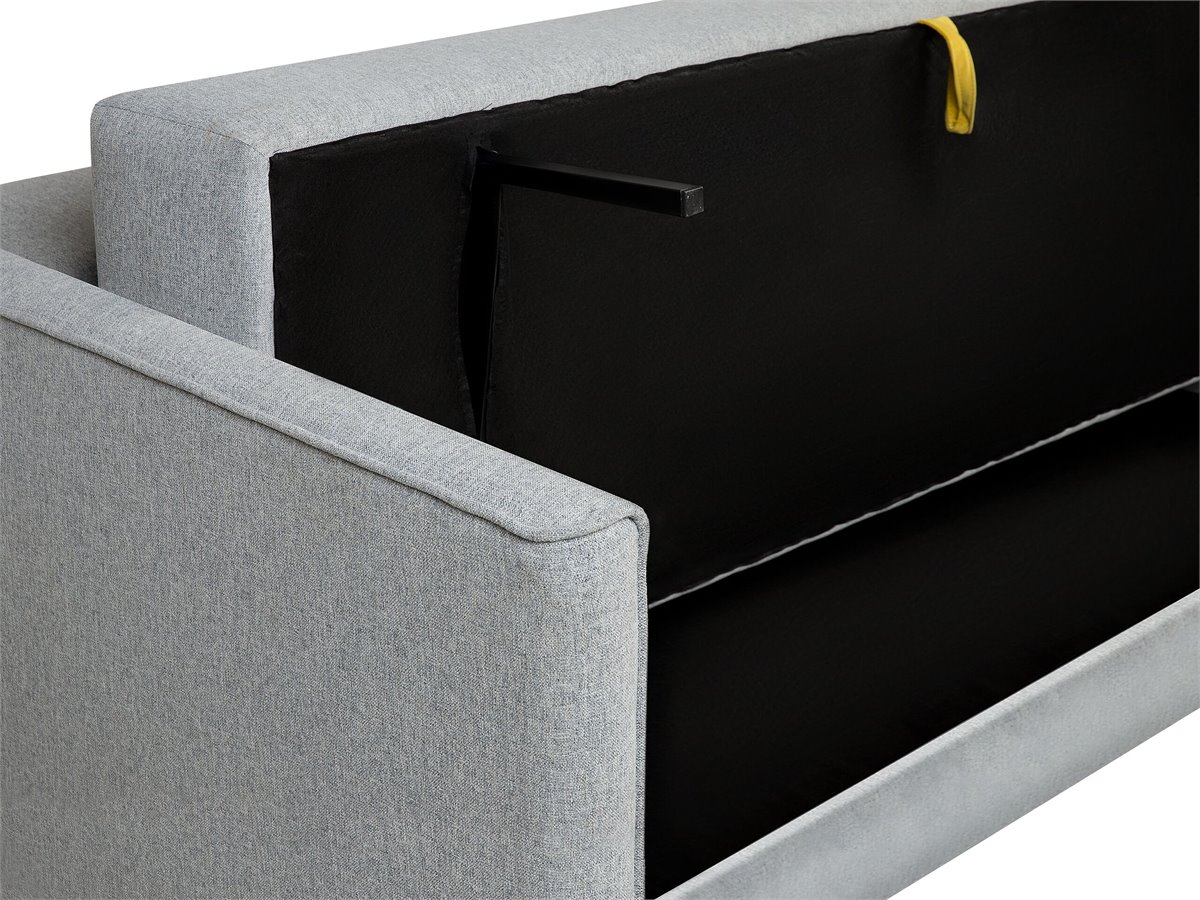 Sofá convertible. Este sofá cama de diseño moderno es ideal para cualquier sala de estar tradicional o minimalista. Está fabricado a partir de tela de poliéster suave al tacto. Los cojines de asiento acolchados y las patas de madera ofrecen comodidad y estabilidad. Incluye un espacio de almacenaje para guardar ropa u otros accesorios. Fácilmente convertible en cama de invitados.