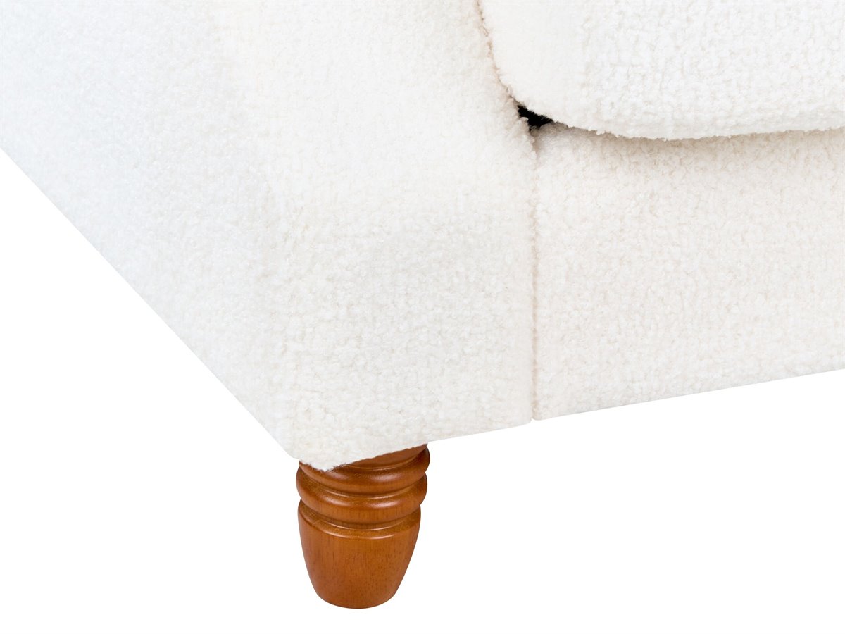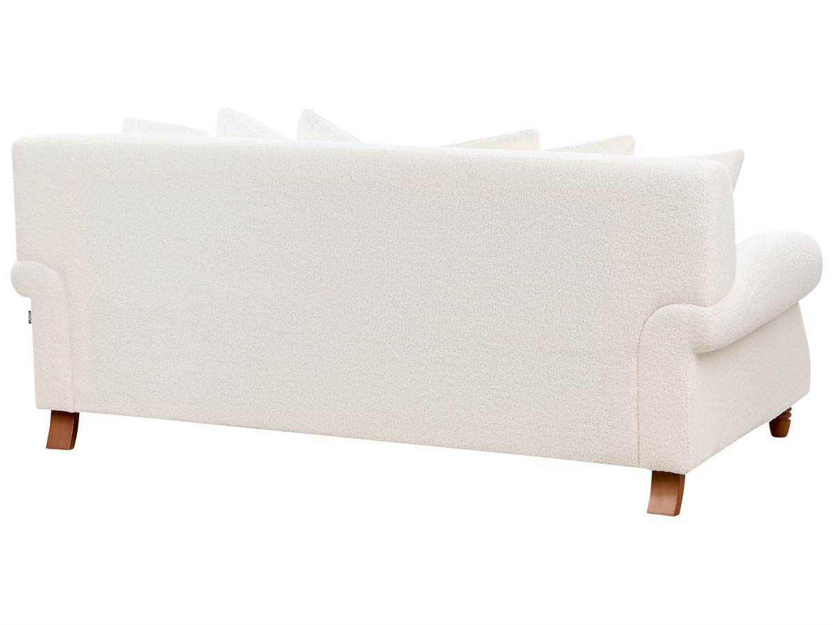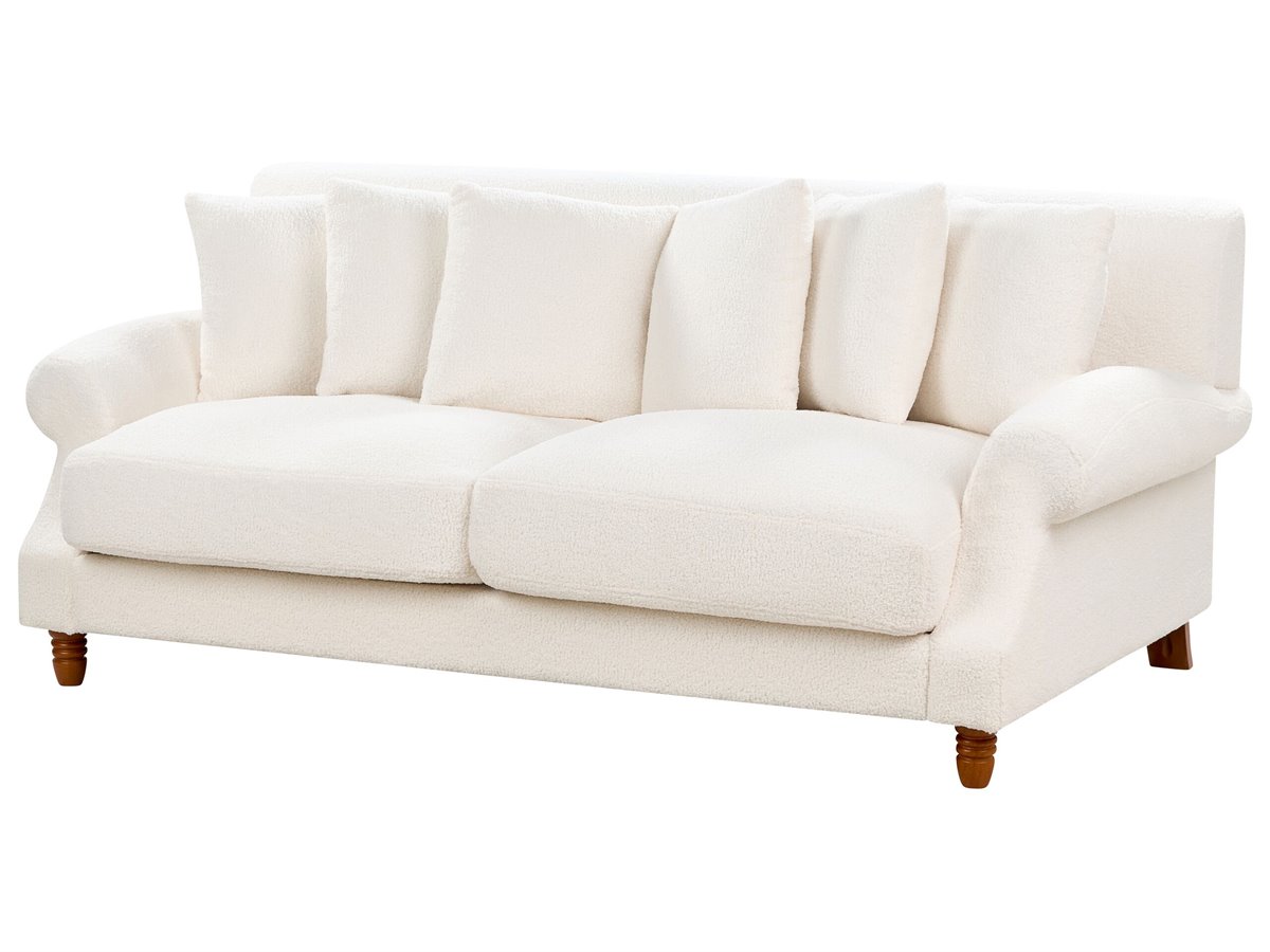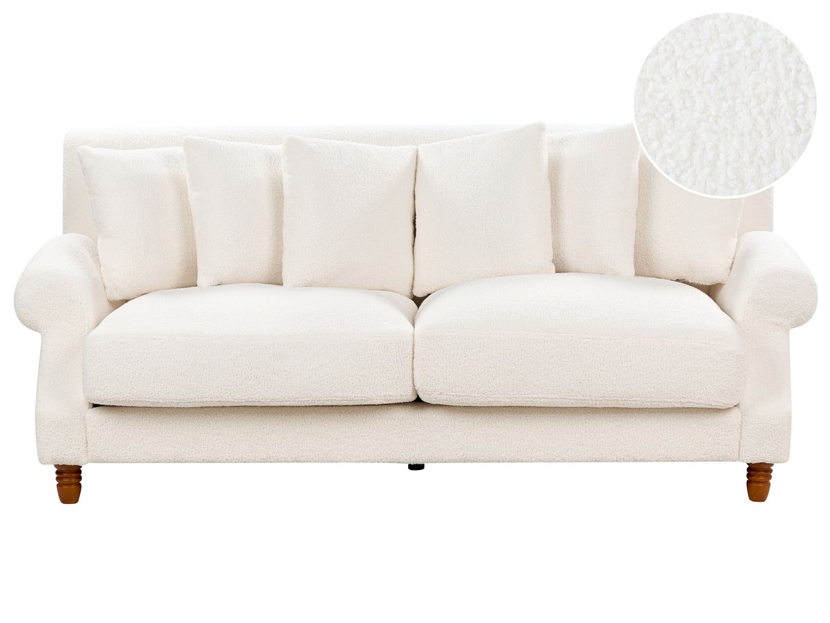 Sofá de estilo vintage. Este sofá de bouclé atrae todas las miradas e infunde a tu salón un suave aire vintage. Diseñado para aportar a tu hogar un ambiente hogareño y elegante, cuenta con patas de madera ornamentadas, reposabrazos enrollados y un suave tejido que mantendrá su color durante años. Los respaldos acolchados y los cojines a juego complementan la pieza, creando una composición muy acogedora.