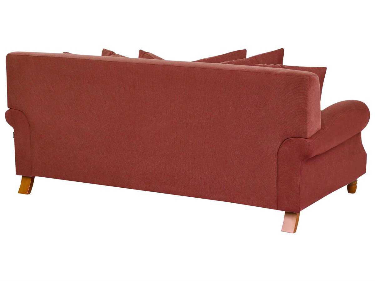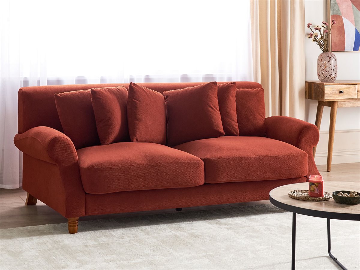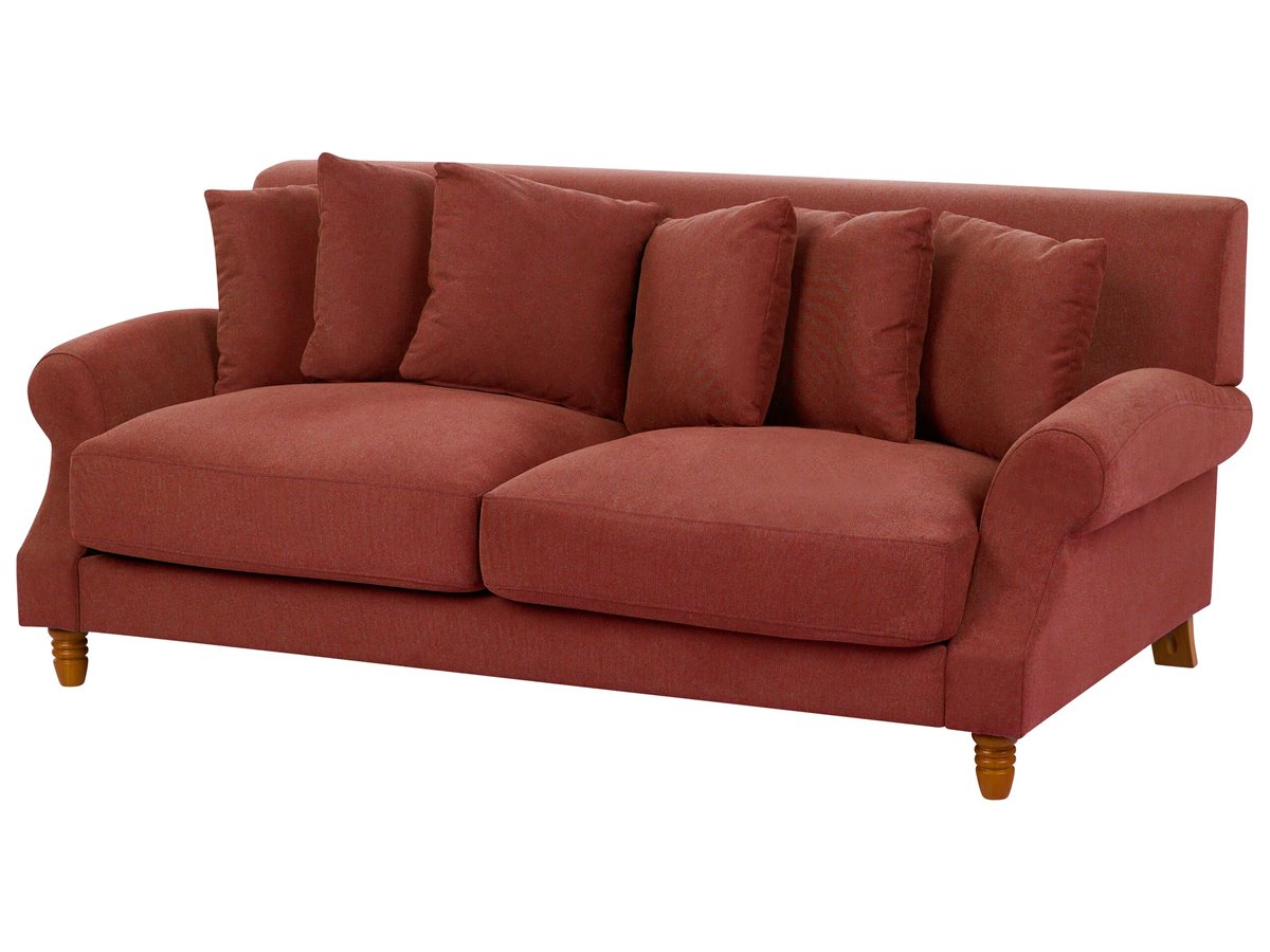 Sofá de estilo vintage. Este sofá de tela atrae todas las miradas e infunde a tu salón un suave aire vintage. Diseñado para aportar a tu hogar un ambiente hogareño y elegante, cuenta con patas de madera ornamentadas, reposabrazos enrollados y un suave tejido que mantendrá su color durante años. Los respaldos acolchados y los cojines a juego complementan la pieza, creando una composición muy acogedora.