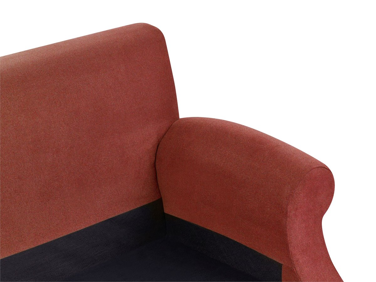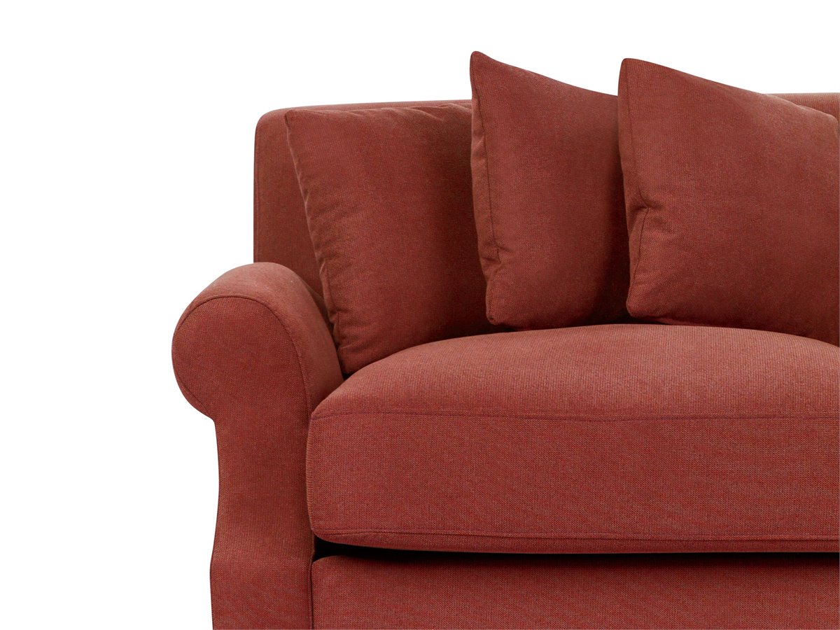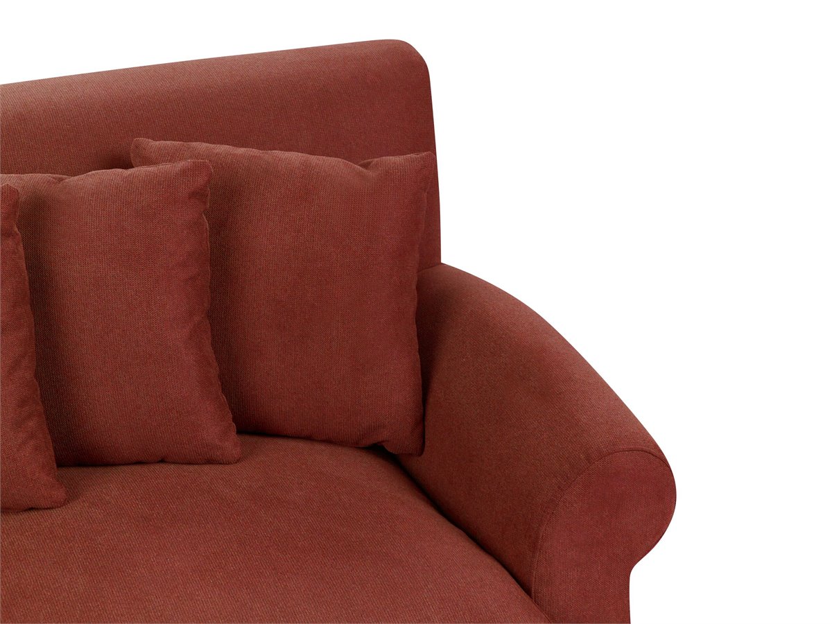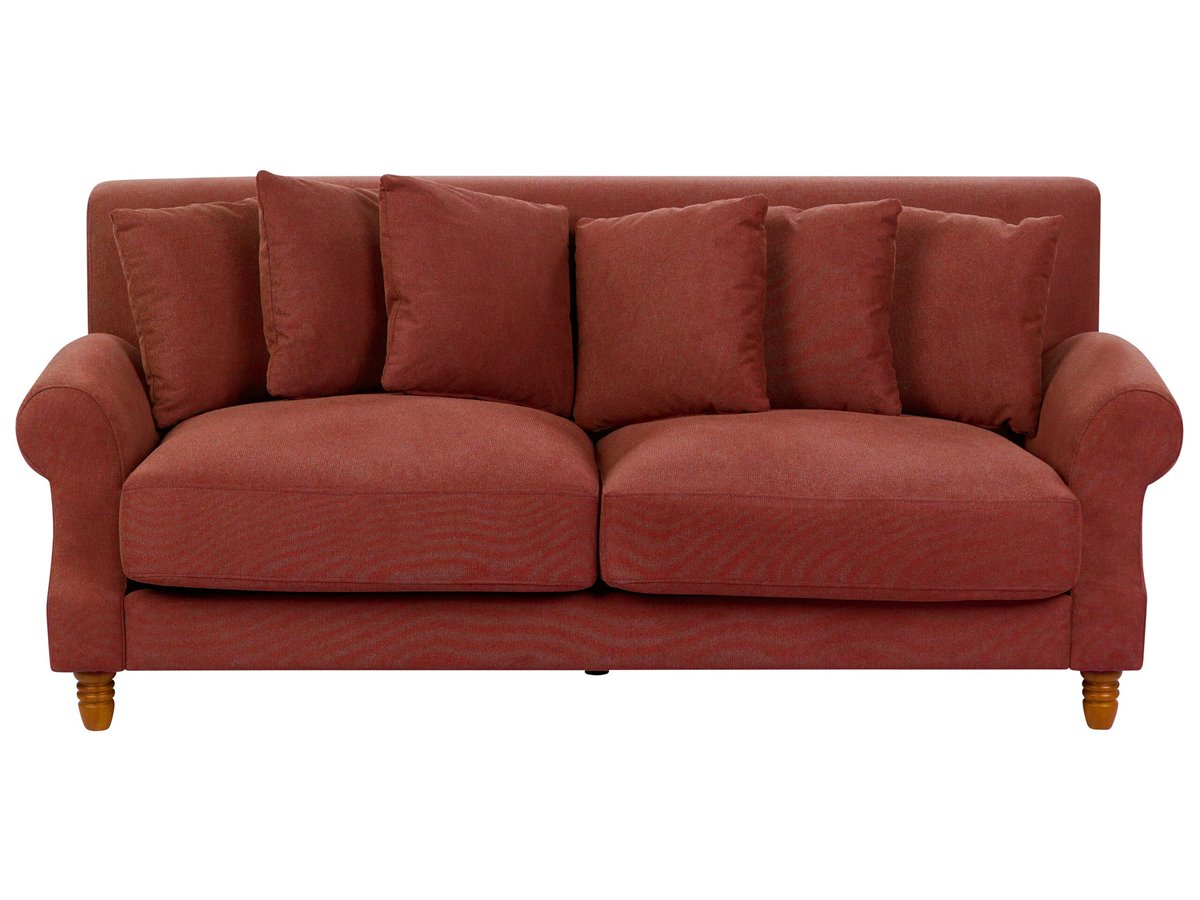 Sofá de estilo vintage. Este sofá de tela atrae todas las miradas e infunde a tu salón un suave aire vintage. Diseñado para aportar a tu hogar un ambiente hogareño y elegante, cuenta con patas de madera ornamentadas, reposabrazos enrollados y un suave tejido que mantendrá su color durante años. Los respaldos acolchados y los cojines a juego complementan la pieza, creando una composición muy acogedora.