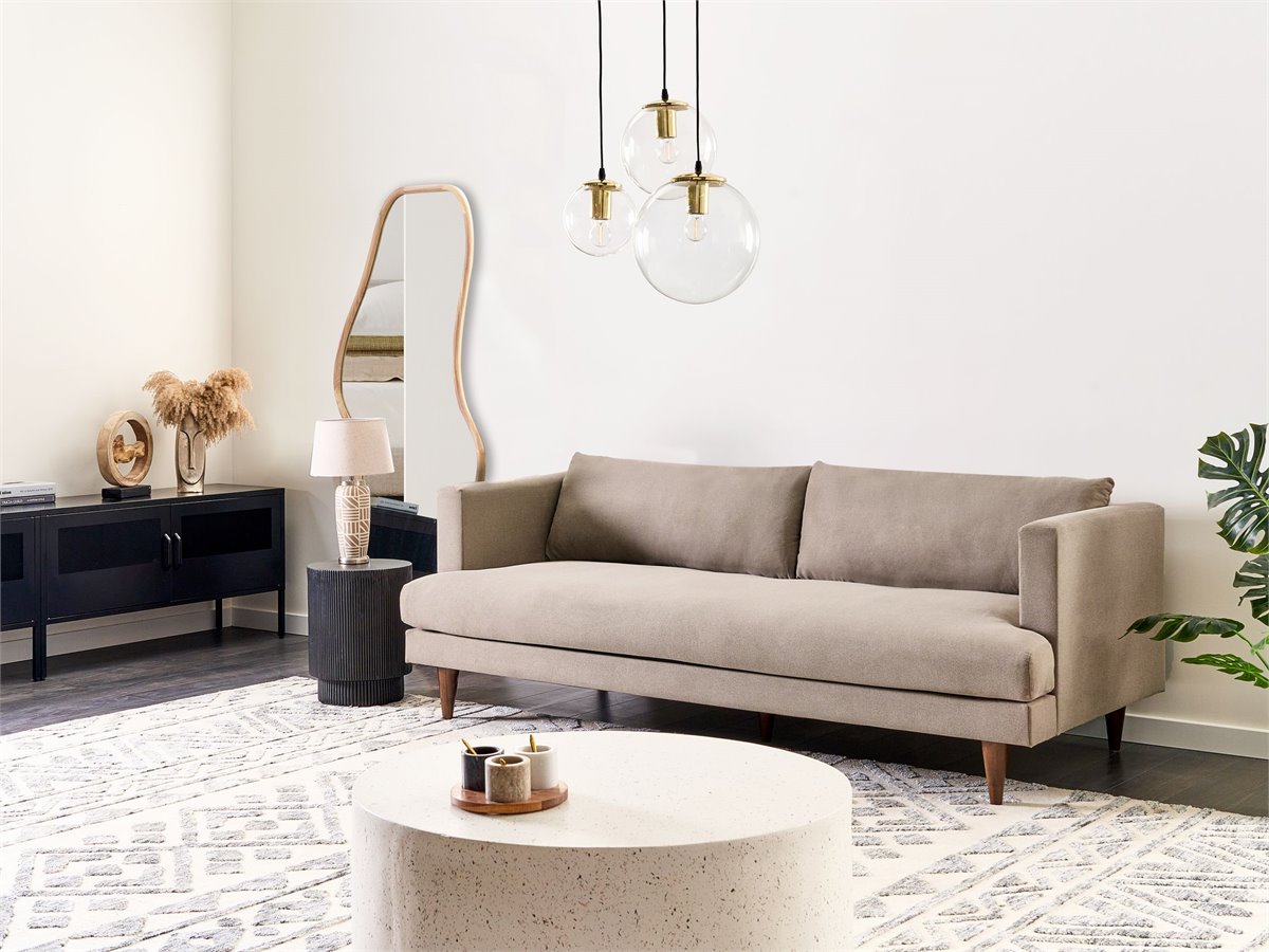 Sofá de estilo moderno. Introduce un toque de elegancia en tu hogar con este elegante sofá tapizado en un atemporal tono beige. Fabricado para ofrecer durabilidad y comodidad, cuenta con una estructura resistente y cojines mullidos que garantizan un apoyo y un descanso duraderos. El diseño elegante y contemporáneo es perfecto para interiores modernos. Este versátil sofá es una opción ideal para quienes buscan una mezcla de sofisticación y comodidad.