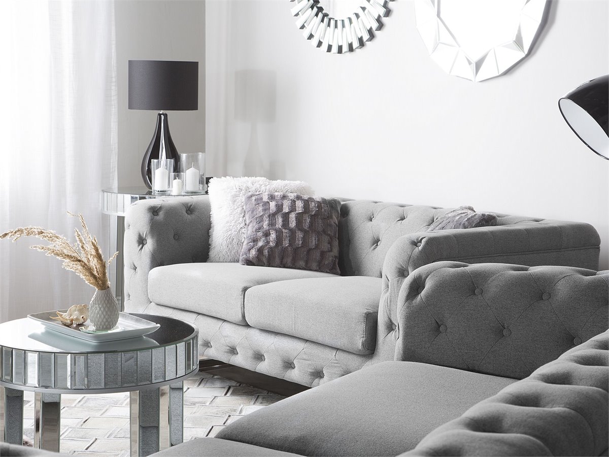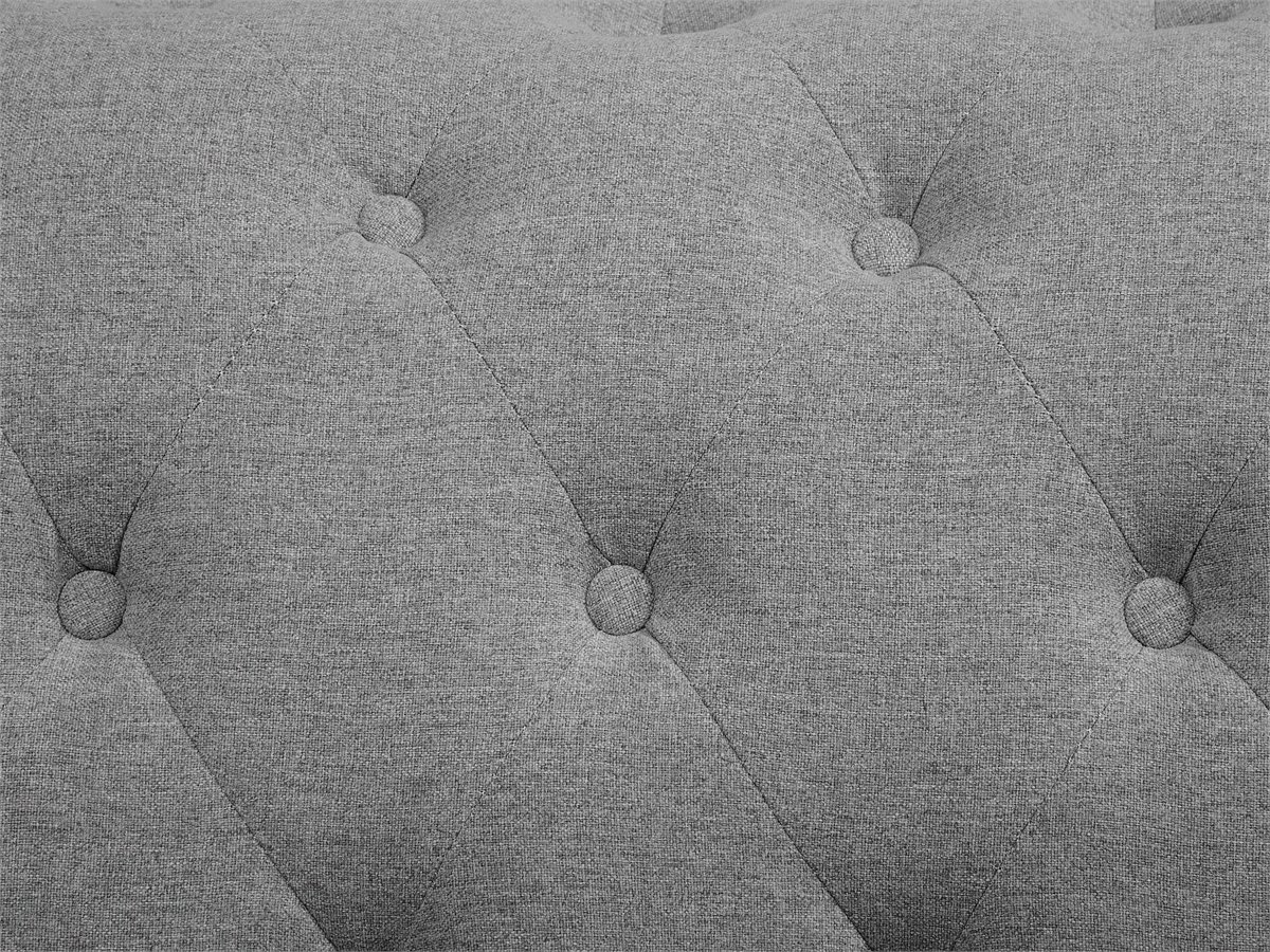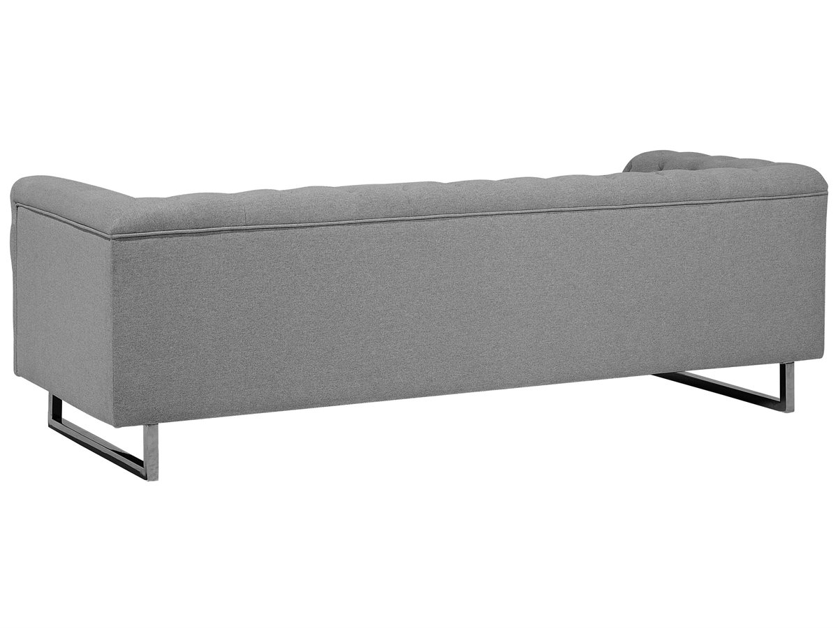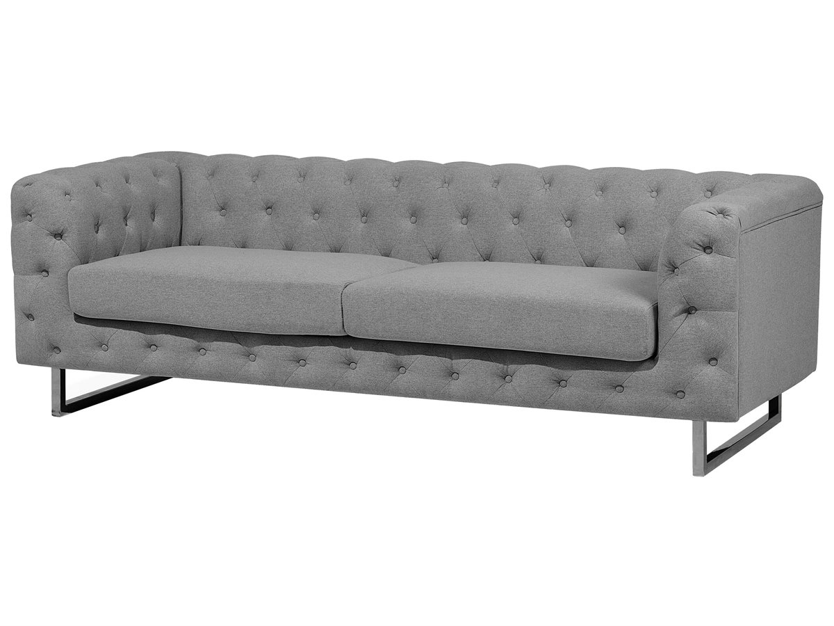 Elegante sofá clásico en color gris. Renueva la decoración de tu interior con este sofá de 3 plazas. Está fabricado a partir de tela de poliéster de alta calidad. Los cojines de asiento de acolchado grueso y el estilo capitoné completan el diseño. Las patas de acero garantizan estabilidad. Combina bien con cualquier sala de estar de estilo moderno o tradicional.