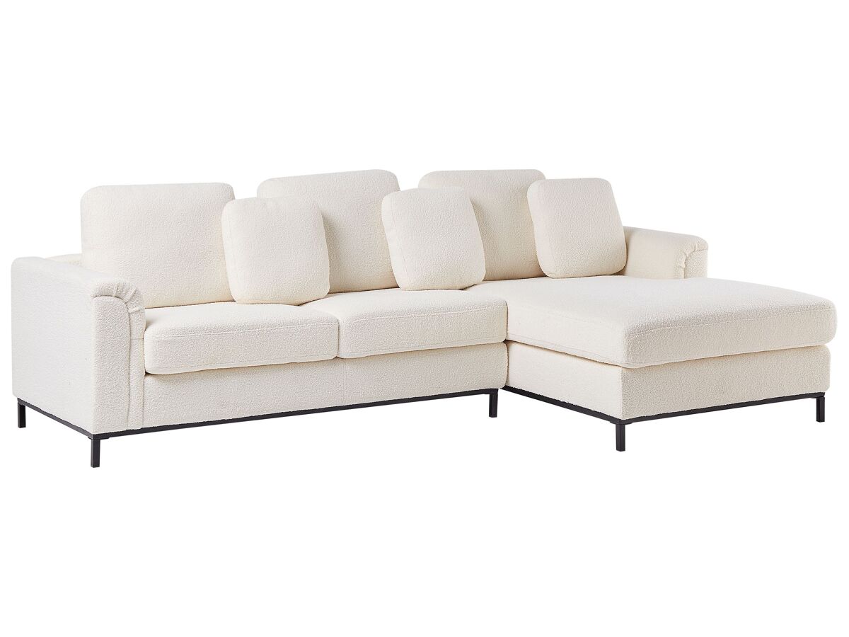 Precioso sofá seccional. Este sofá esquinero funcional combina bien con cualquier interior de estilo contemporáneo. Está fabricado a partir de bouclé suave de alta calidad. Su diseño garantiza el mejor descanso. Las patas de metal aportan un toque de modernidad a la pieza. Los cojines adicionales vienen con fundas extraíbles.