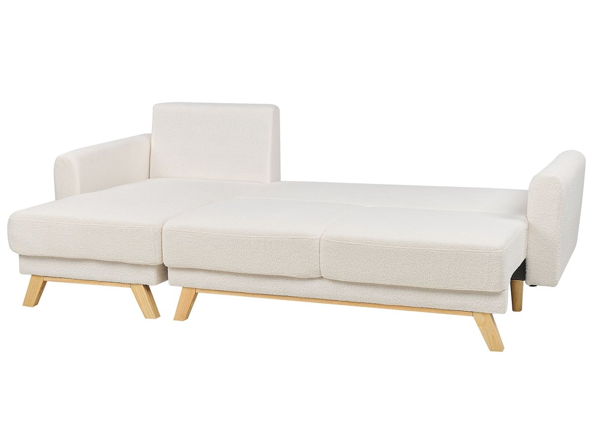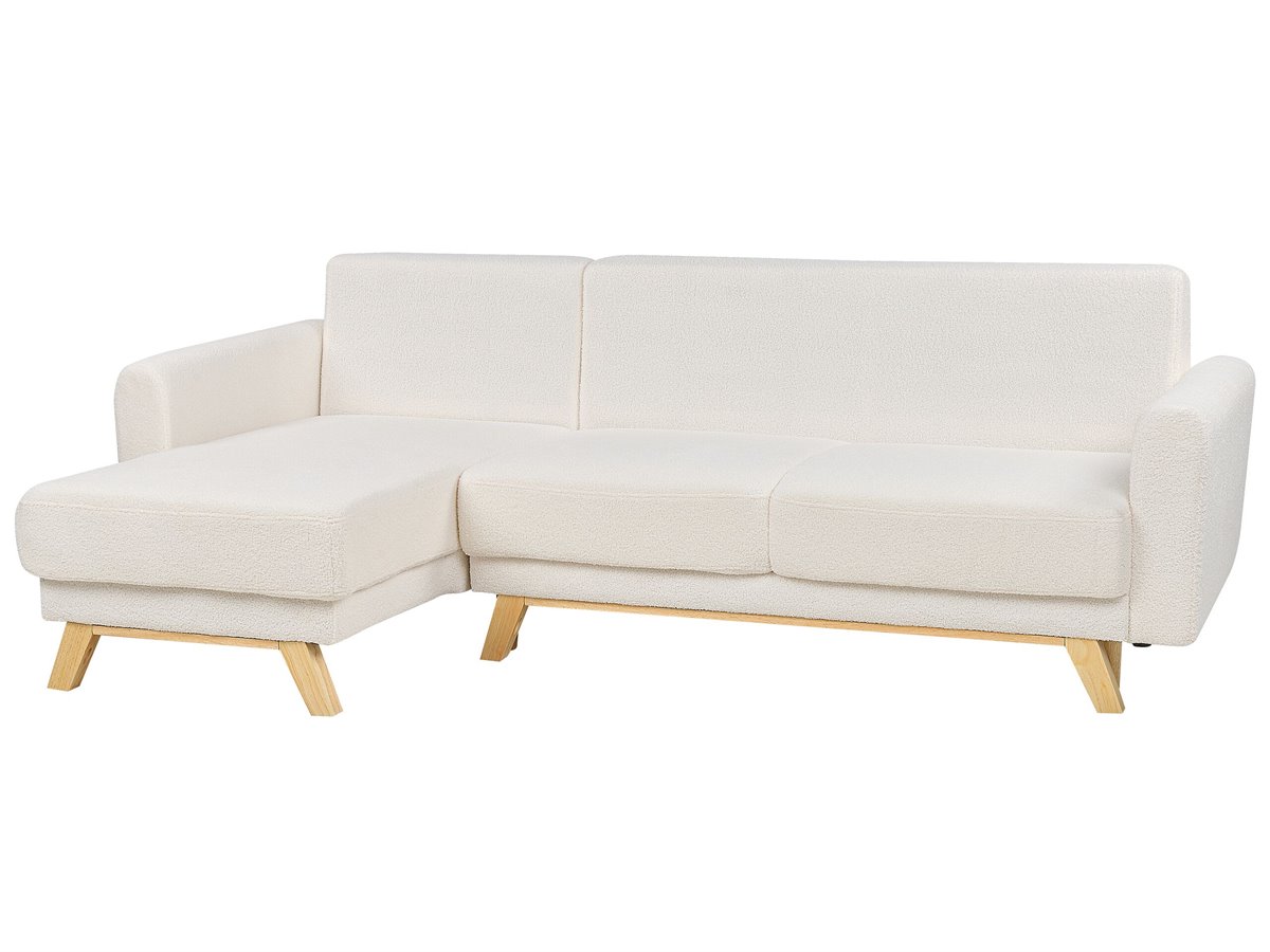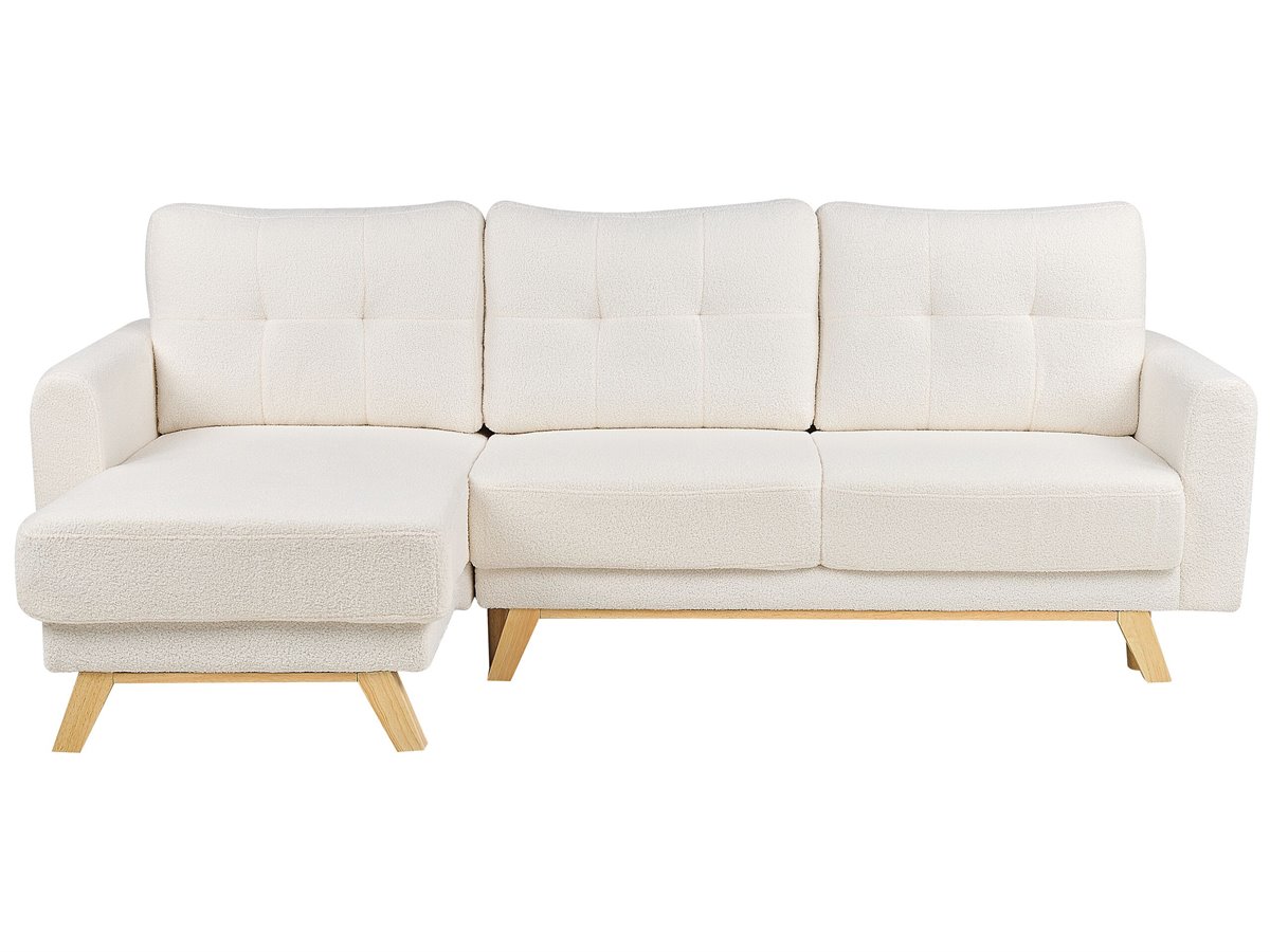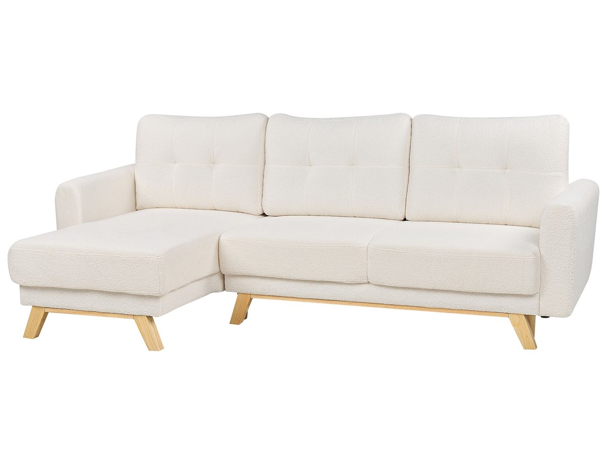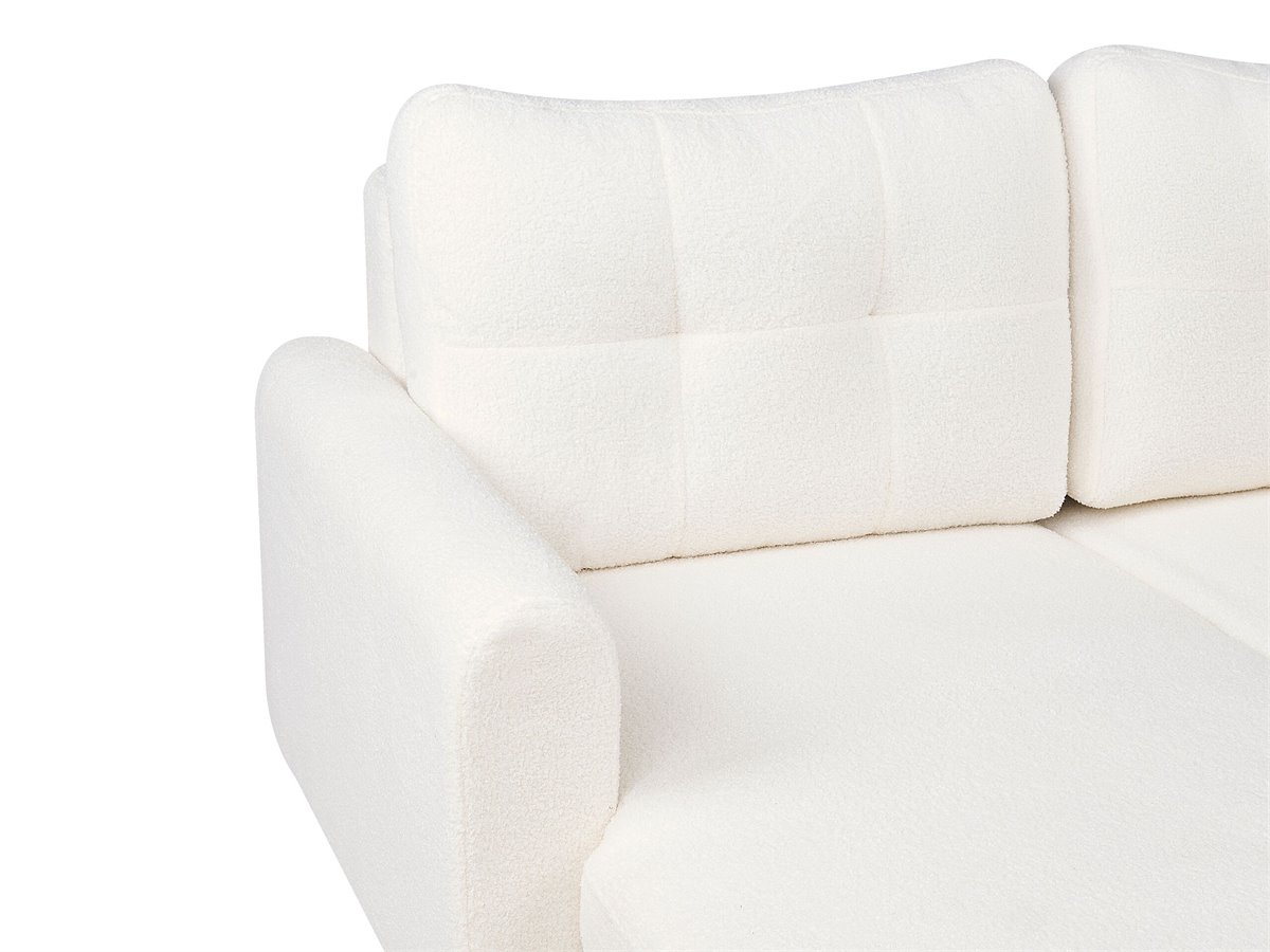 Sofá acolchado de estilo moderno. Este sofá esquinero, de diseño moderno con respaldo acolchado, se adapta fácilmente a cualquier salón moderno. La chaise longue y la opción abatible proporcionan una funcionalidad versátil, por lo que es ideal para descansar o alojar a invitados durante la noche. Los pequeños detalles, como el capitoné de los cojines y las patas delanteras inclinadas, le confieren una sensación de sencilla elegancia.