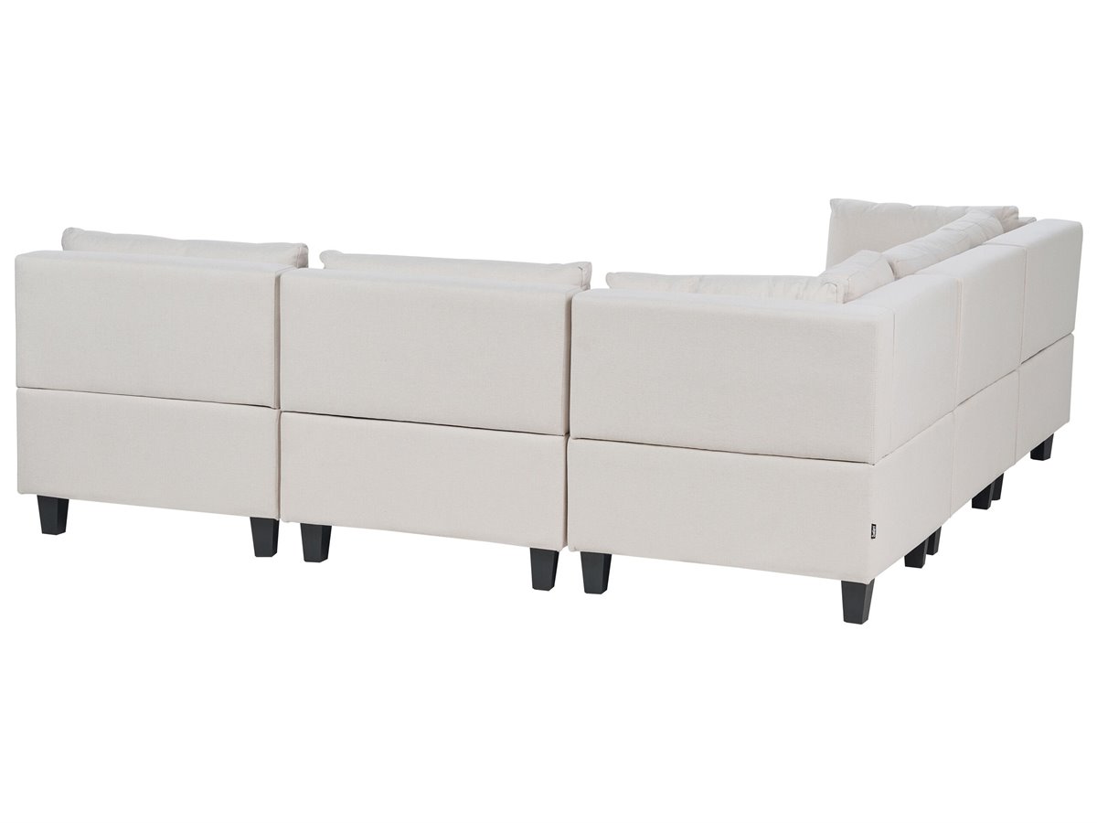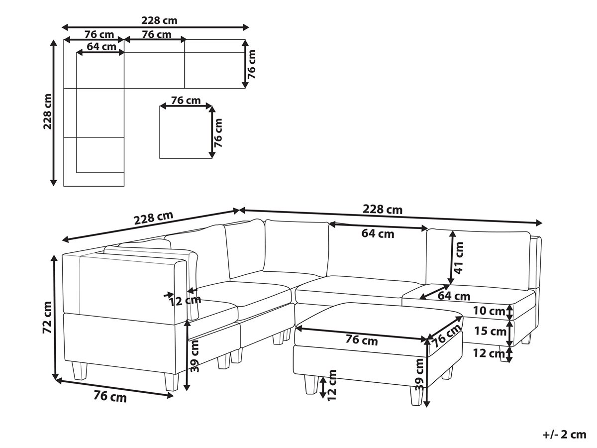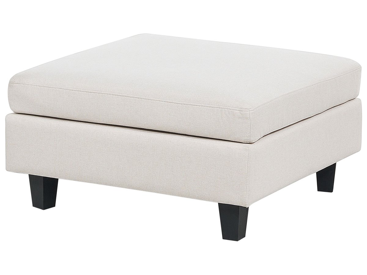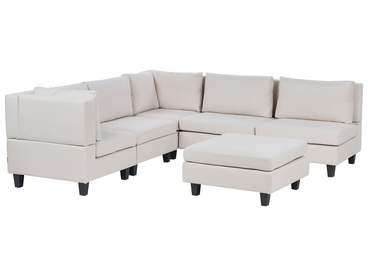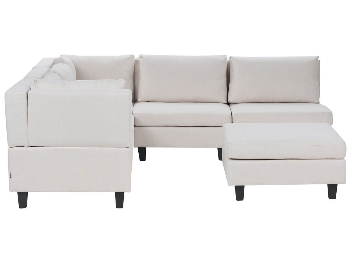 Sofá seccional tapizado con reposapiés. Este sofá modular tapizado va a transformar tu salón en una zona de descanso. El conjunto consta de varios módulos, que puede conectar entre sí, para conseguir un sofá esquinero, o utilizarlos como muebles independientes que ofrecen espacio de asiento adicional. Además, el sofá viene con una otomana, que puede usarse como reposapiés o superficie adicional para sentarse. Todas las piezas están recubiertas de un suave tejido de poliéster de alta calidad, que recuerda al lino por su aspecto, por lo que sin duda atraerá las miradas de todos tus invitados. La construcción también es muy estable gracias a las patas sintéticas, y el grueso acolchado garantiza la comodidad.