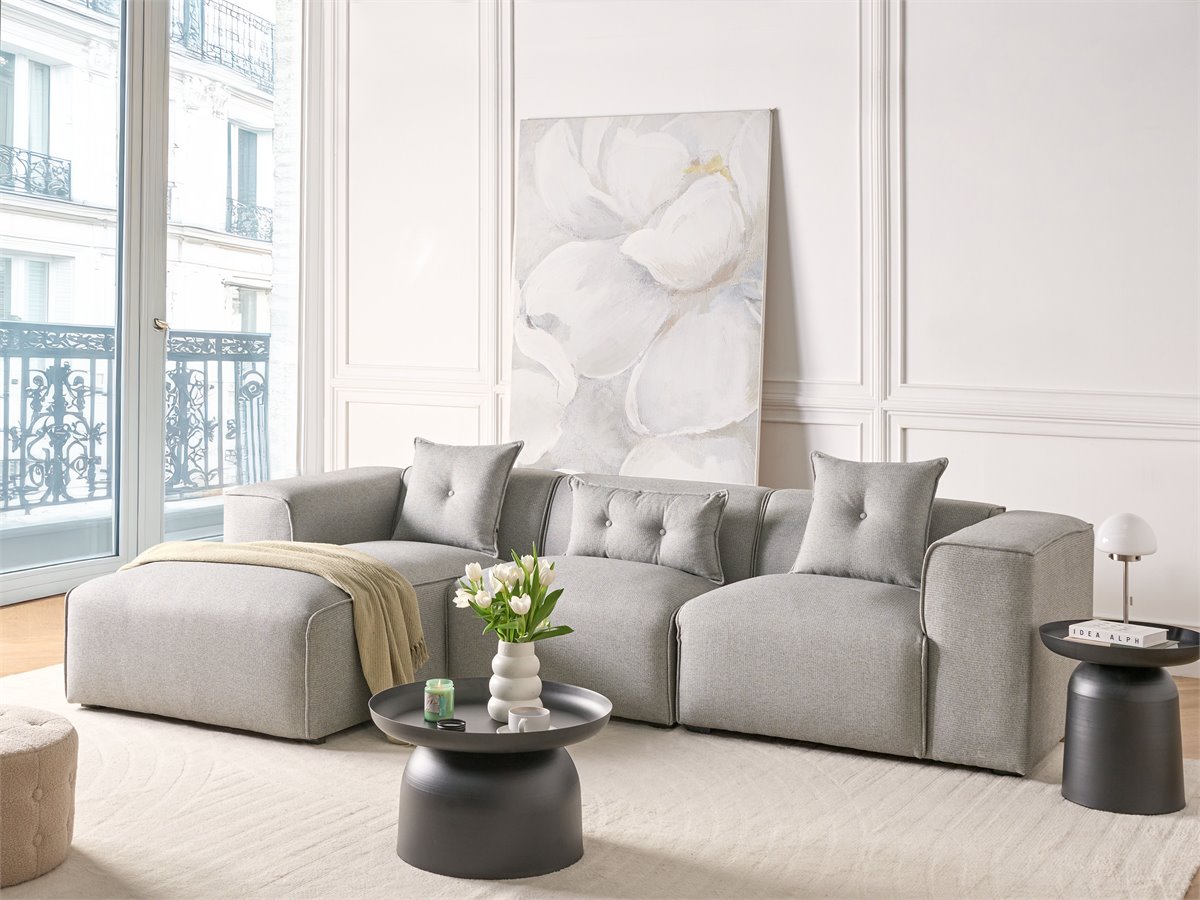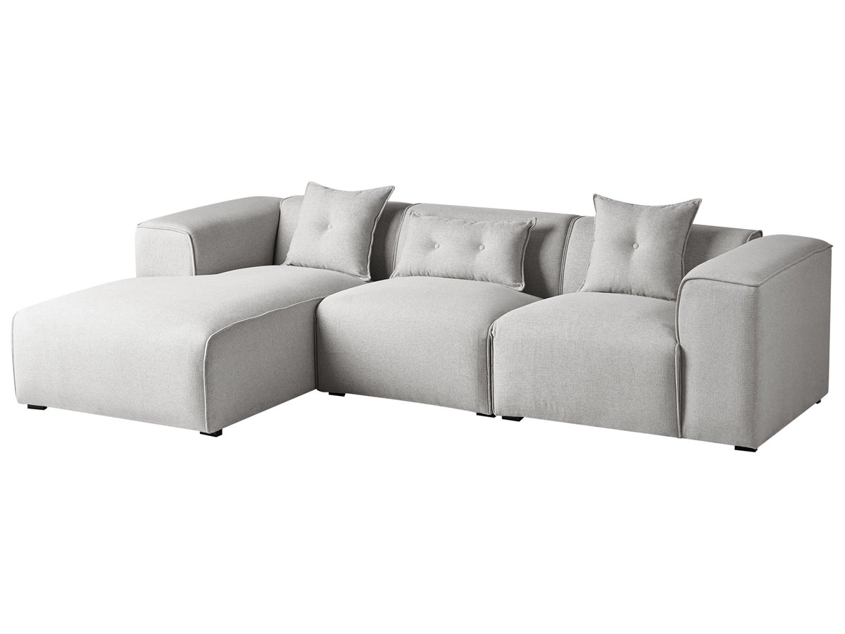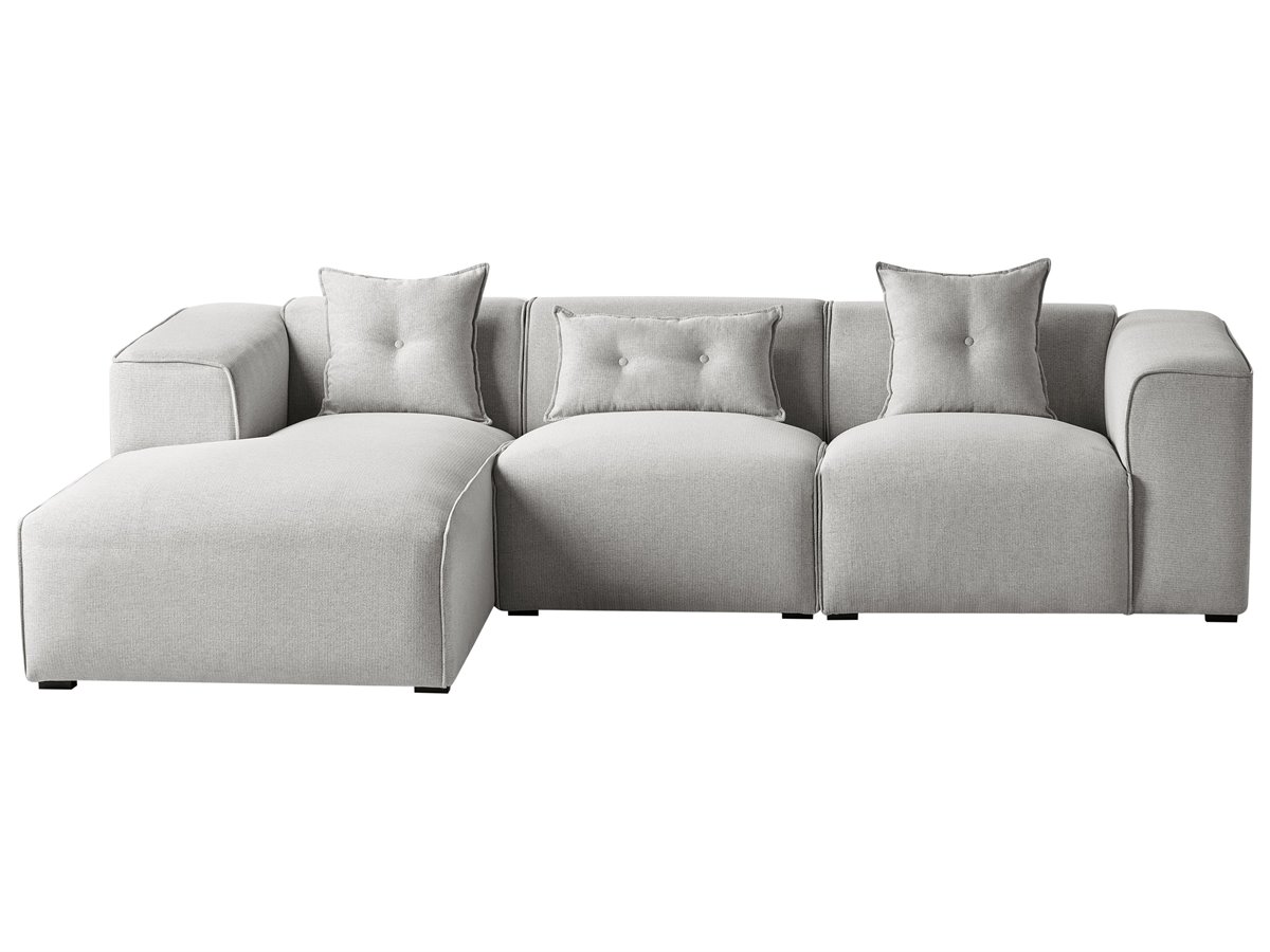 Sofá seccional rinconero. Un sofá con tumbona que se convierte instantáneamente en la pieza central de cualquier salón moderno, tradicional o minimalista. Su robusta estructura de madera y sus patas sintéticas garantizan su longevidad, mientras que la suave tapicería recubre gruesas capas de espuma que garantizan un cómodo asiento. Las líneas elegantes y el diseño sencillo del sofá se enriquecen con tres cojines que añaden un encanto hogareño.