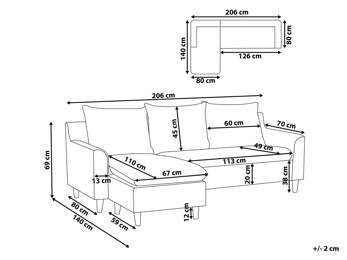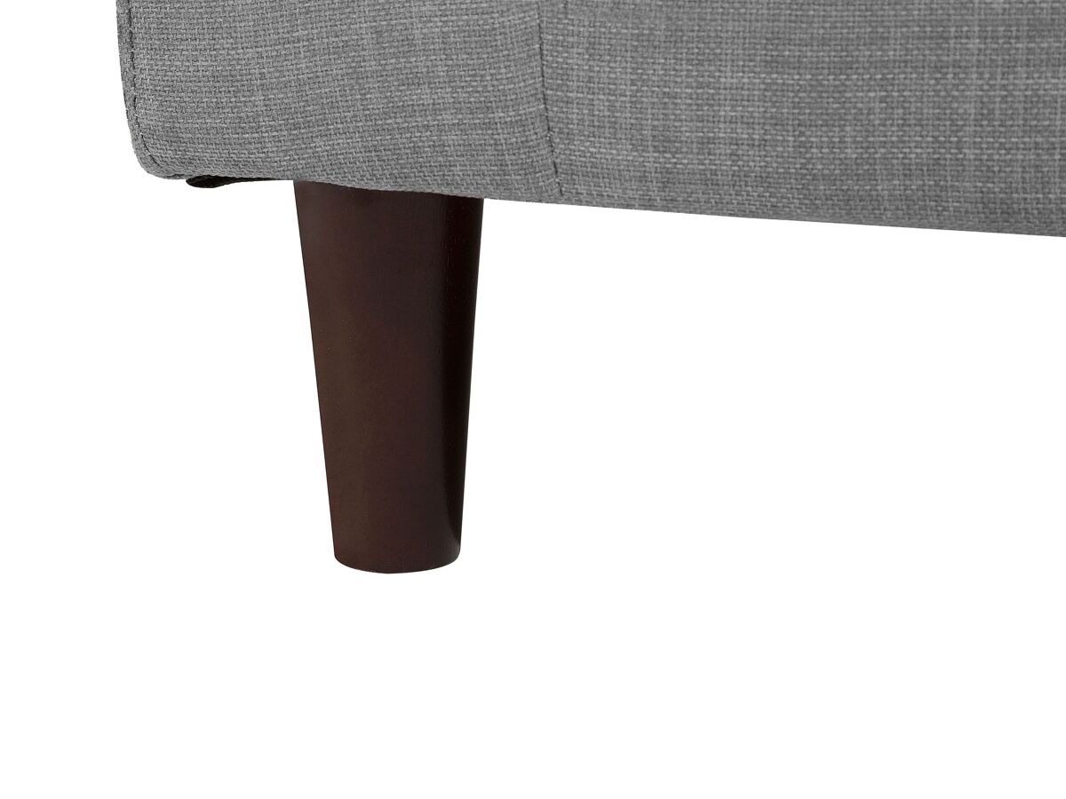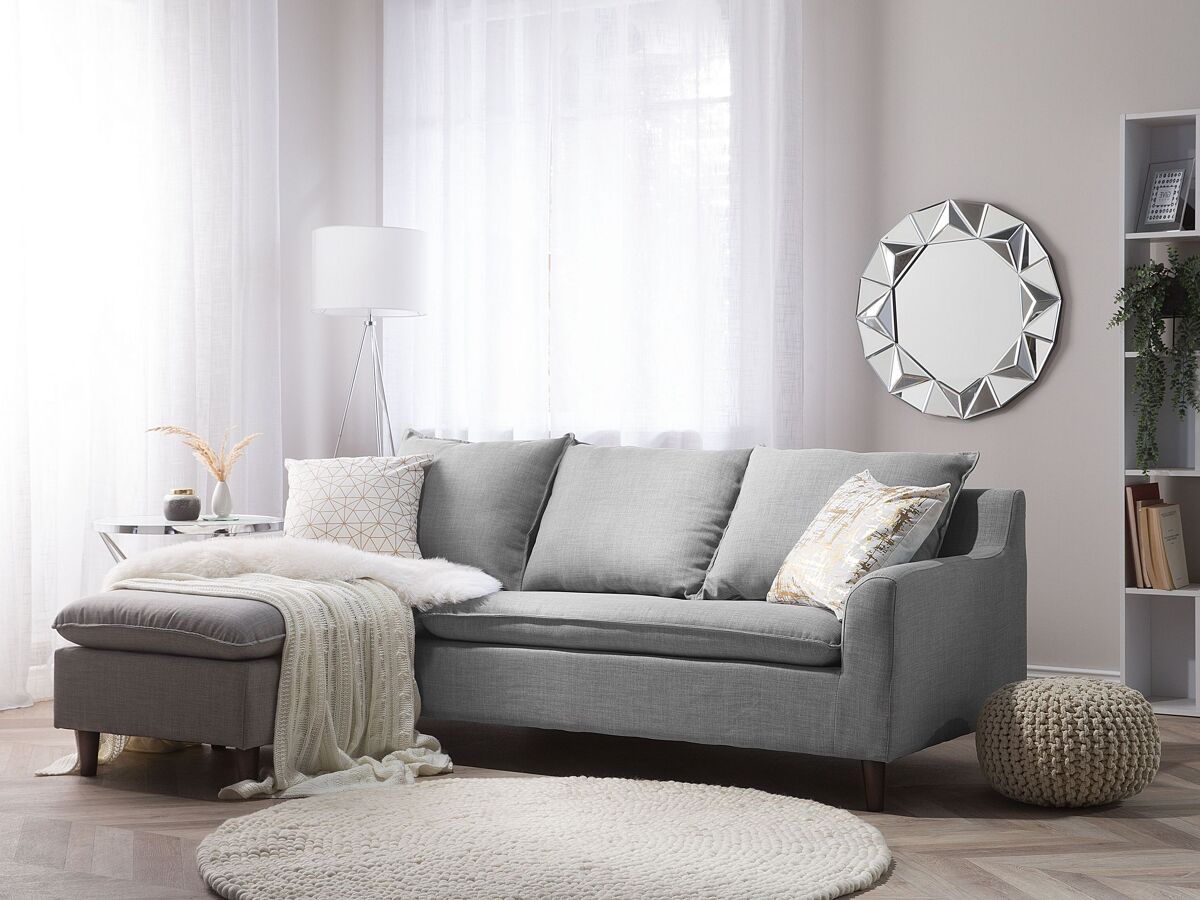 Cómodo sofá tapizado. Este sofá esquinero combina un estilo clásico con un toque moderno. Gracias a su diseño versátil que permite colocar la otomana a ambos lados, este sofá se convierte en una zona de conversación ideal para cualquier sala de estar, complementando tanto la decoración tradicional como la contemporánea. La pieza presenta una tapicería duradera en un color elegante junto con unas esbeltas patas de madera de caucho que garantizan la estabilidad. Debido al material utilizado, el sofá también es fácil de limpiar. Un asiento de espuma gruesamente acolchado y un respaldo ancho formado por tres grandes cojines hacen que este sofá sea perfecto para quienes disfrutan de un alto nivel de confort.