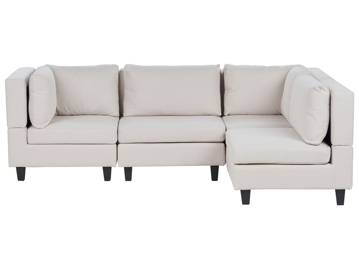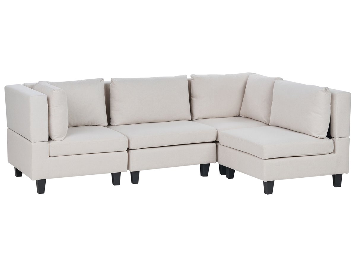 Sofá seccional tapizado. Este sofá viene con piezas modulares que se pueden organizar fácilmente en un rincón. Los asientos anchos y profundos agrupados crean un espacio amplio y cómodo, ideal para estirar las piernas y relajarse plenamente. La pieza está equipada con patas sintéticas en color negro. Gracias a la tapicería de poliéster en un color neutro, el sofá complementa perfectamente una amplia variedad de estilos de decoración y esquemas de color.
