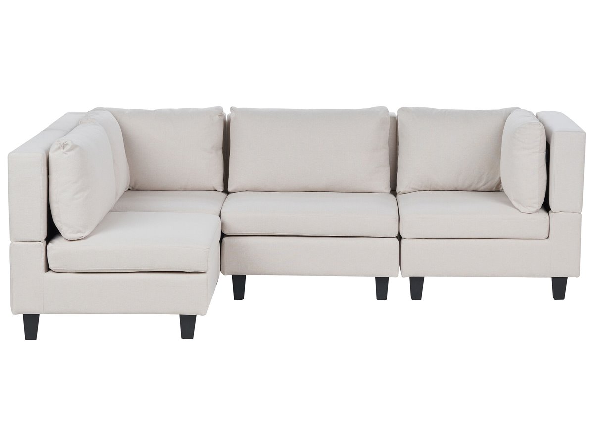 Sofá seccional tapizado. Este sofá modular tapizado va a transformar tu salón en una zona de descanso. El conjunto se compone de varios módulos, que puedes conectar entre sí, para conseguir un sofá esquinero, o utilizarlos como muebles independientes que ofrecen espacio adicional para sentarse. Todas las piezas están recubiertas de un suave tejido de poliéster de alta calidad, que recuerda al lino por su aspecto, por lo que sin duda atraerá las miradas de todos tus invitados. La construcción también es muy estable gracias a las patas sintéticas, y el grueso acolchado garantiza la comodidad.