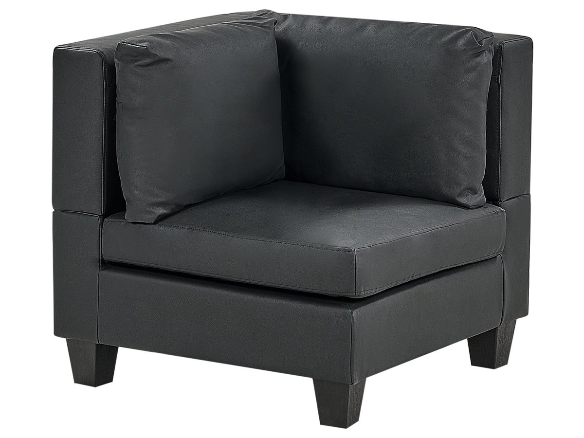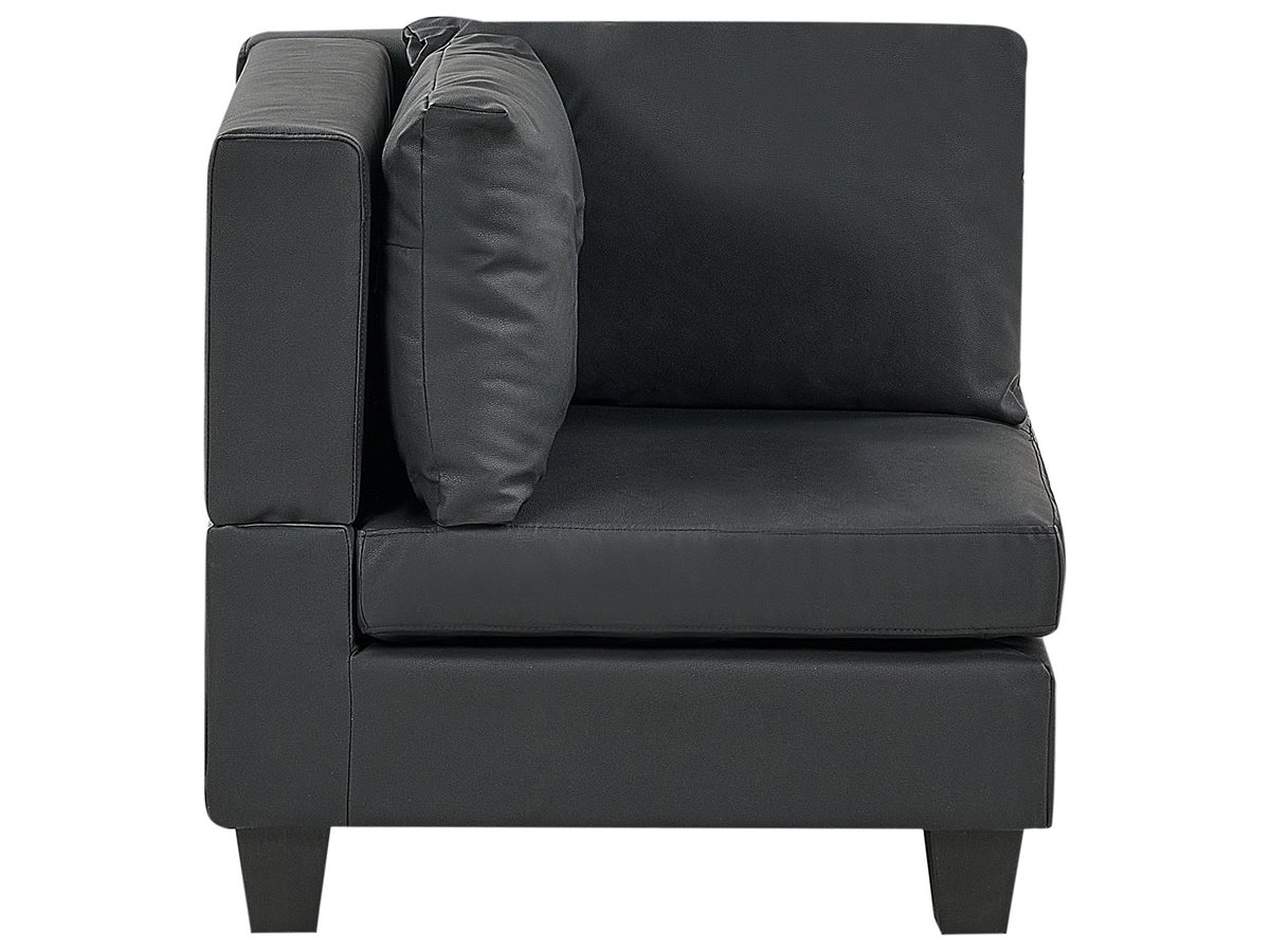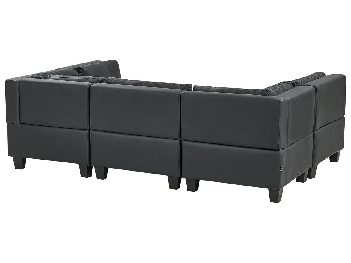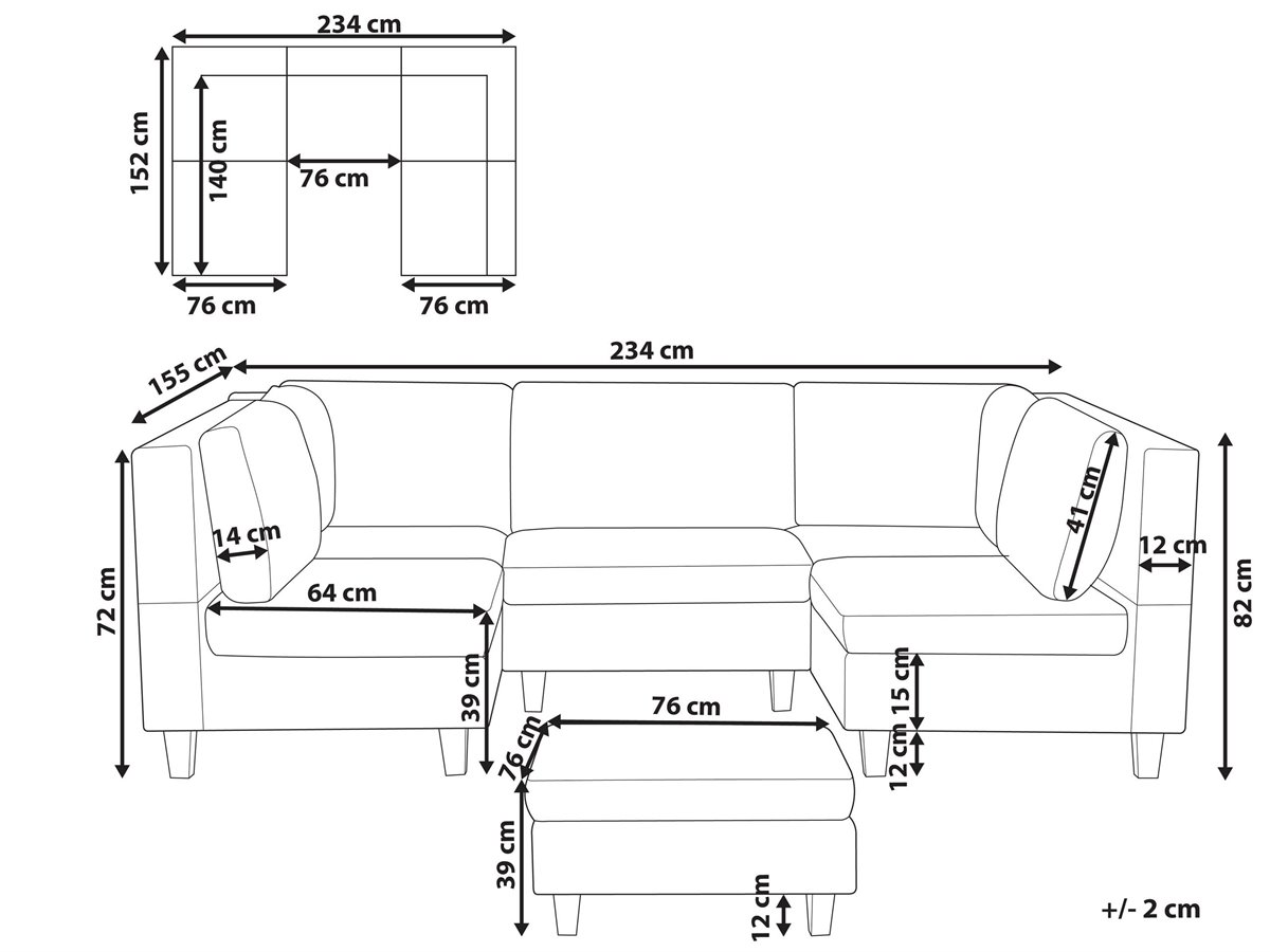 Sofá seccional tapizado con reposapiés. Este sofá modular tapizado va a transformar tu salón en una zona de descanso. El conjunto consta de varios módulos, que puede conectar entre sí, para conseguir un sofá clásico y recto, o utilizarlos como muebles independientes que ofrecen espacio de asiento adicional. Además, el sofá viene con una otomana, que puede usarse como reposapiés o superficie adicional para sentarse. Todas las piezas están recubiertas de piel sintética de alta calidad que, con su aspecto elegante, atraerá sin duda las miradas de todos tus invitados. La construcción también es muy estable gracias a las patas sintéticas, y el grueso acolchado garantiza la comodidad.