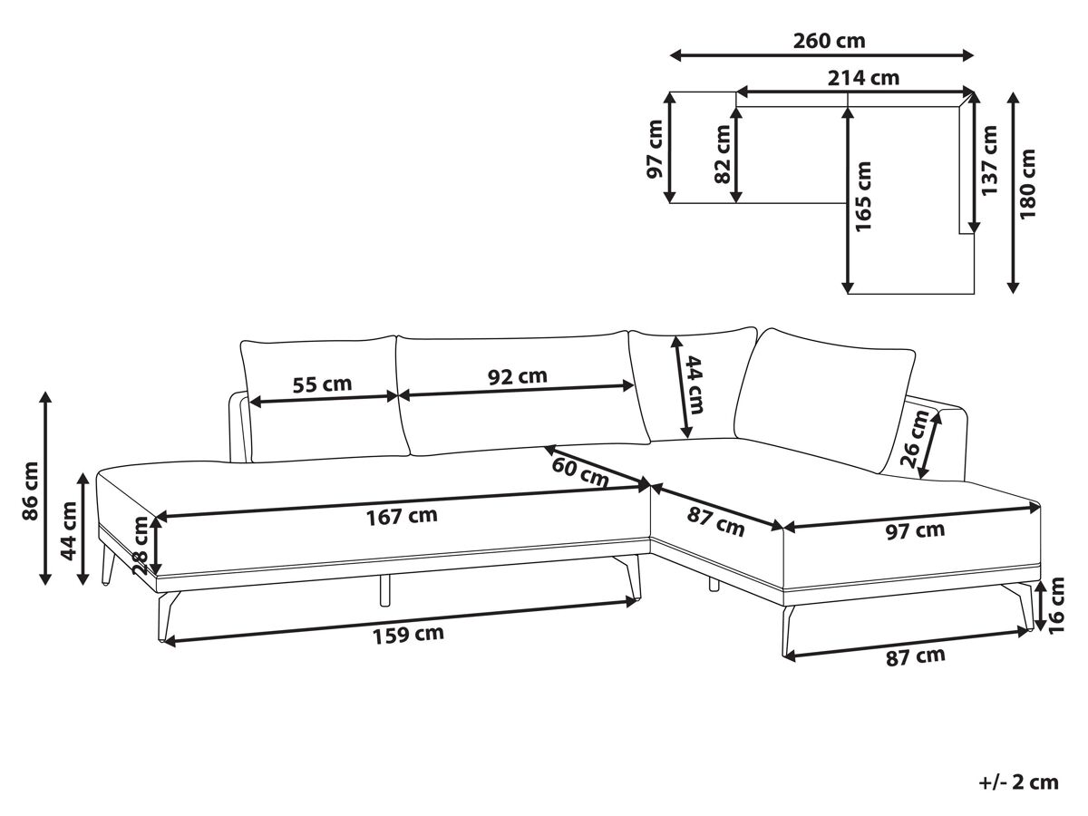 La oferta incluye: 1 x Sofá de 2 plazas, 1 x Chaise longue, 4 x Cojín del respaldo, Conectores incluidos