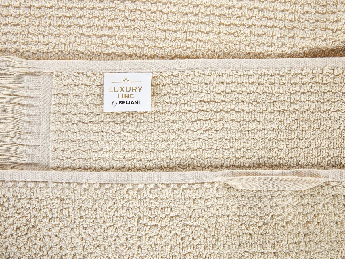 Juego de toallas. Siente la máxima comodidad después de un baño relajante o una ducha con este conjunto de 2 toallas. Está fabricado a partir de algodón y poliéster reciclado de alta calidad. Su estructura de rizo es suave para la piel y absorbe perfectamente el agua. Los flecos decorativos aportan un toque boho a cualquier baño.