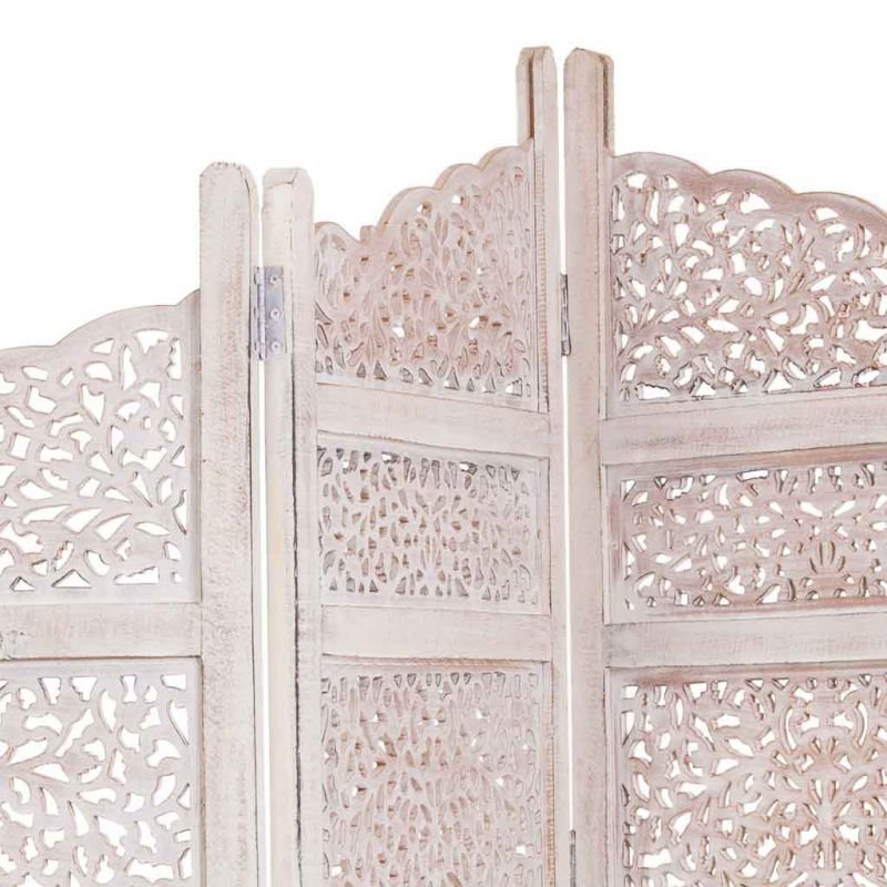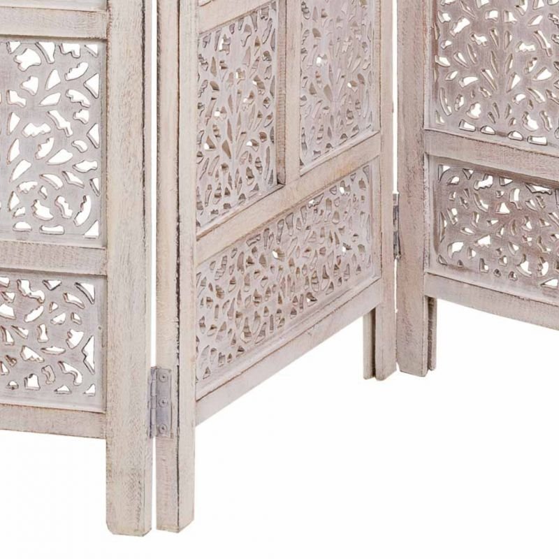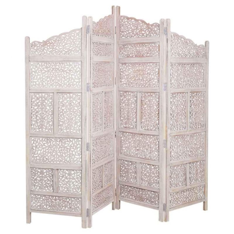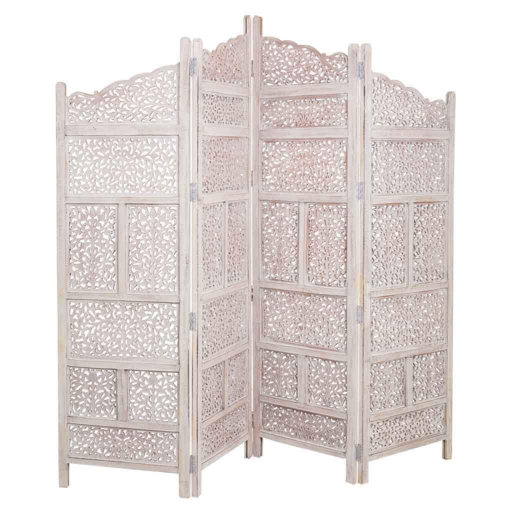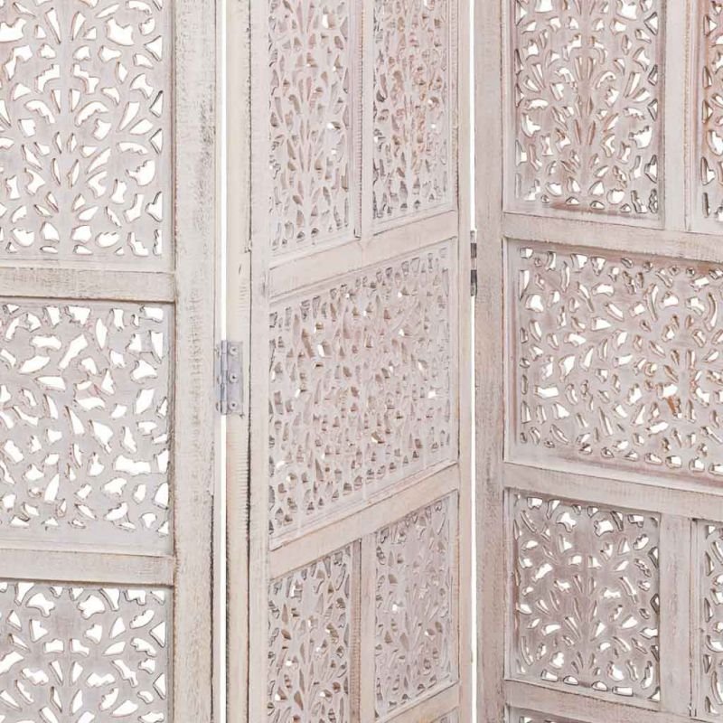 Este parabán de cuatro paneles de madera tallada presenta un acabado artesanal en blanco que le otorga un aspecto luminoso y elegante. Cada panel tiene unas dimensiones de 50 centímetros de ancho y 180 centímetros de altura.