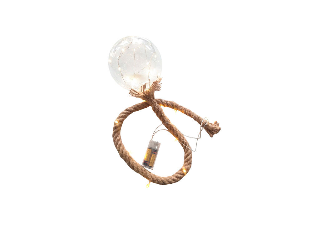 Cuerda 1 metro y 2 cm de diámetro, 24 led cálidos (15 led dentro y 9 en l acuerda), caja de pilas (on-off) con bateria 2xaa (no incluidas)