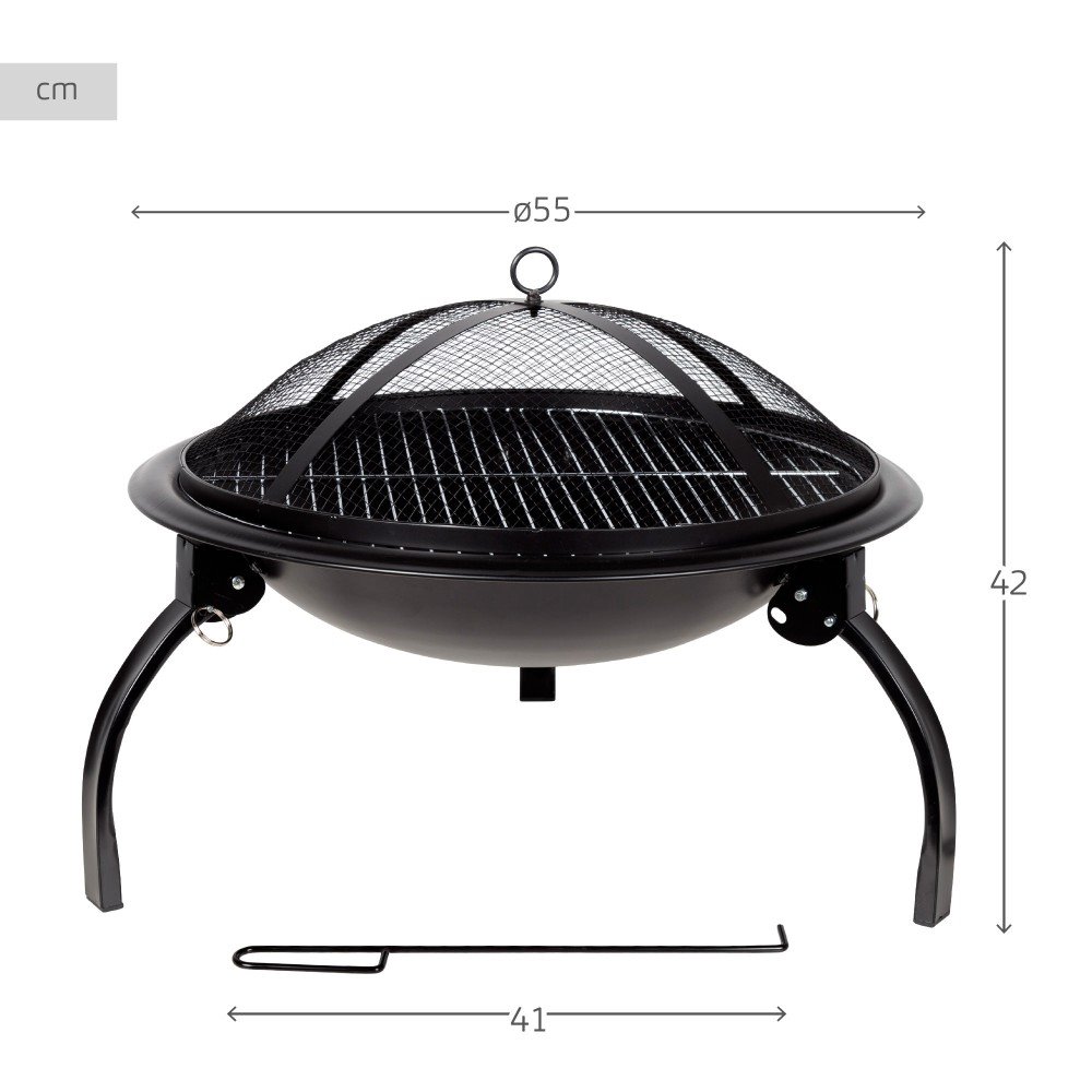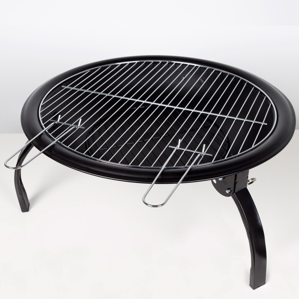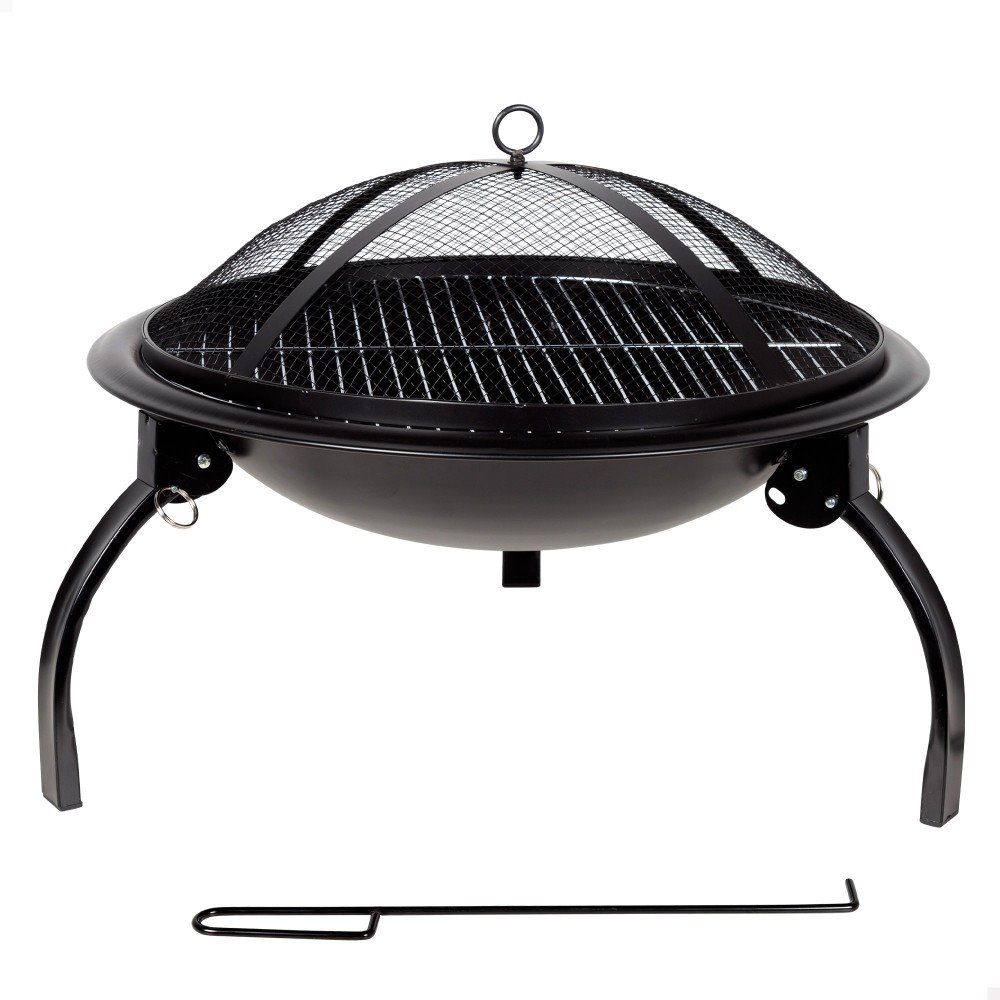 - Brasero exterior portátil Aktive Barbecue 2 en 1. Mide Ø55x42 cm, es color negro, tiene forma circular y se sostiene del suelo por tres patas plegables