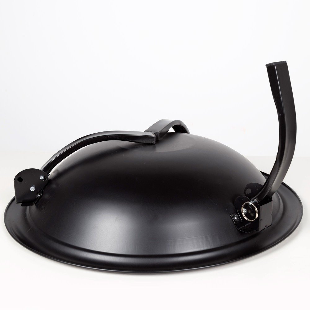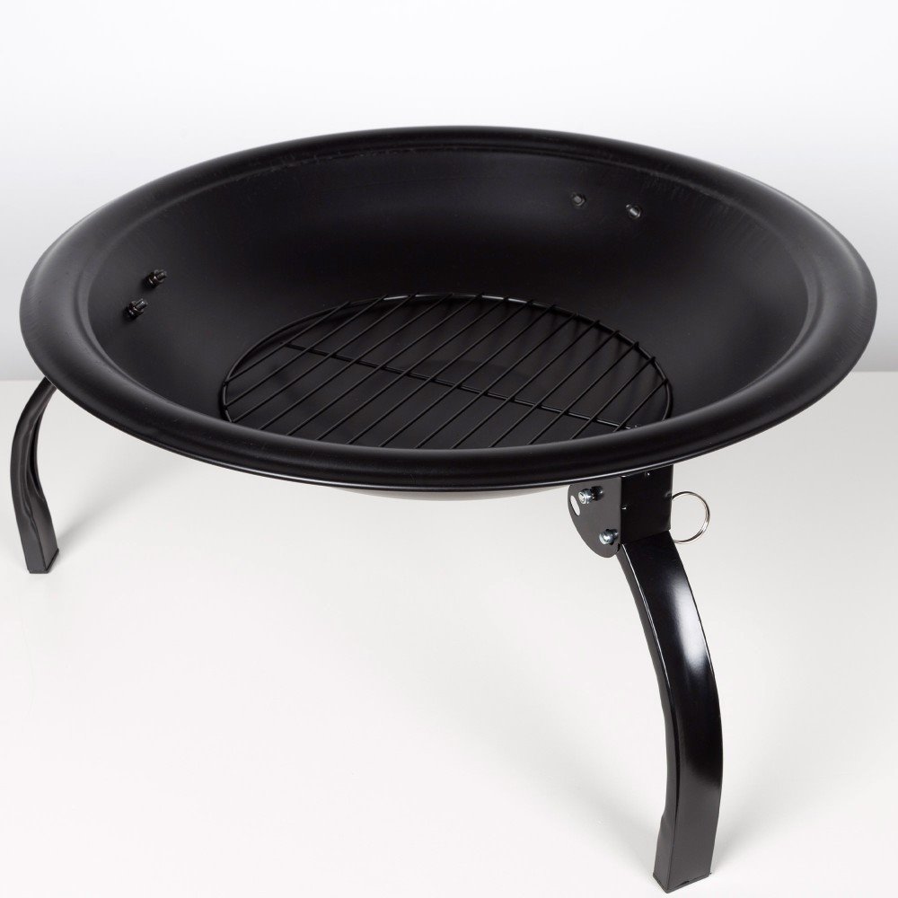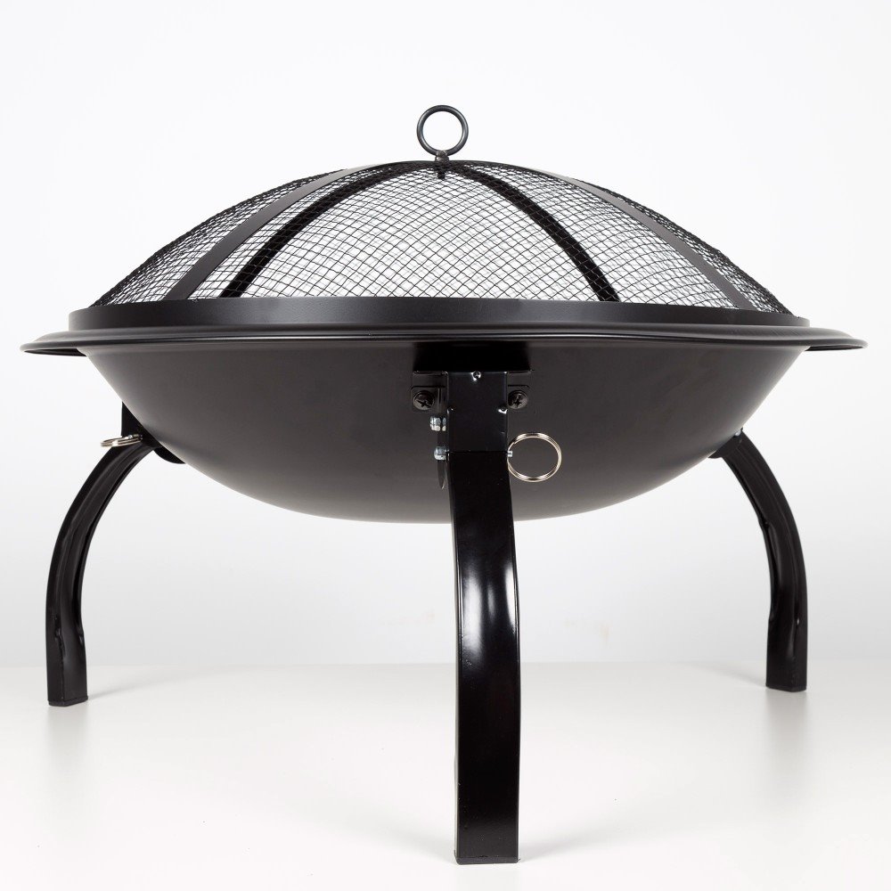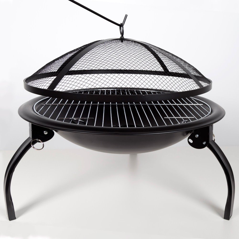 - Brasero exterior portátil Aktive Barbecue 2 en 1. Mide Ø55x42 cm, es color negro, tiene forma circular y se sostiene del suelo por tres patas plegables