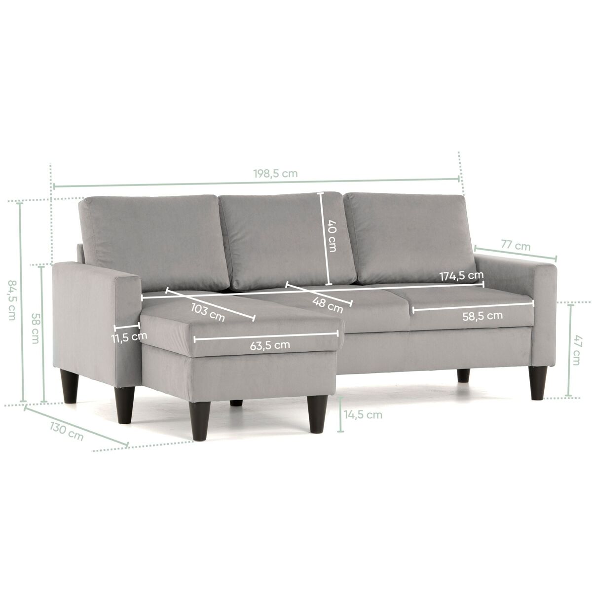 - Altura: 84,5 cm | Anchura: 198,5 cm | Profundidad máxima: 103 cm | Altura del asiento: 47 cm | Altura de los pies: 14,5 cm | Peso del sofá: 45,8 kg.