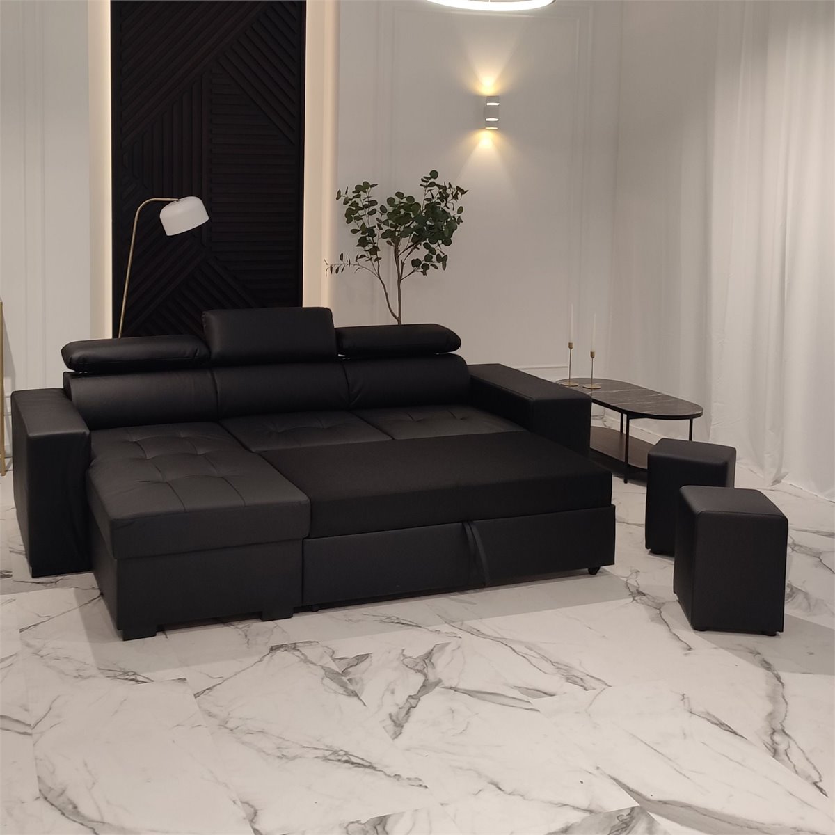 El sofá cama John, con 5 plazas, chaise longue reversible y reposacabezas ajustable, combina comodidad y versatilidad para cualquier espacio. Ideal para familias, decoración moderna y funcional, ofrece la flexibilidad de ser utilizado como sofá o cama. Perfecto para ambientes dinámicos, dueños de mascotas y familias numerosas.