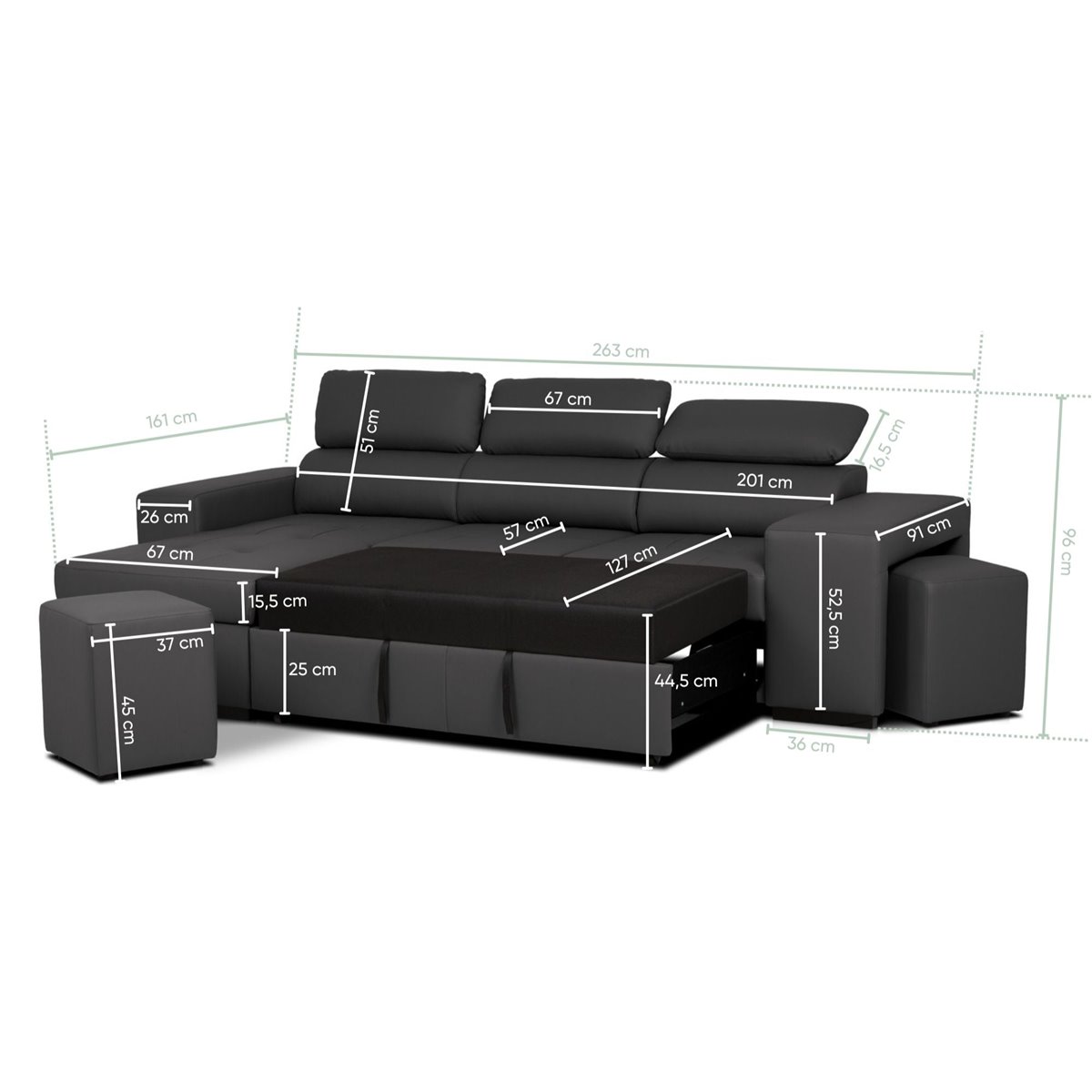 - 96 cm (Alto) x 263 cm (Ancho) x 127 cm (Fondo) | Asiento: Situado a 44,5 cm del suelo | Pies: 4,5 cm (Alto) | Medidas de la cama integrada: 201 cm (Largo) x 127 cm (Ancho) | Peso: 105,8 kg.