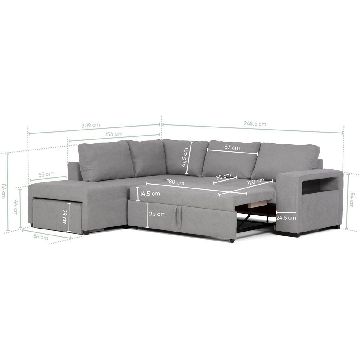 - Altura: 86 cm | Anchura: 248,5 cm | Profundidad máxima: 120 cm | Altura del asiento: 44 cm | Pies: 4,5 cm (Altura) | Medidas de la cama integrada: 235 cm (Largo) x 120 cm (Ancho) | Peso: 141 kg.