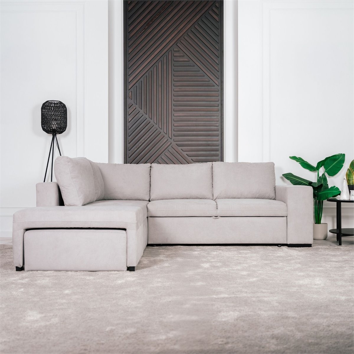 El sofá ZURIE es un sofá cama esquinero de 4 a 5 plazas con dos puffs incluidos, ideal para espacios modernos. Ofrece un confort superior, almacenamiento práctico y un diseño contemporáneo, perfecto para familias numerosas, salones modernos, quienes necesitan espacio de almacenamiento adicional y los amantes del diseño contemporáneo y la funcionalidad.